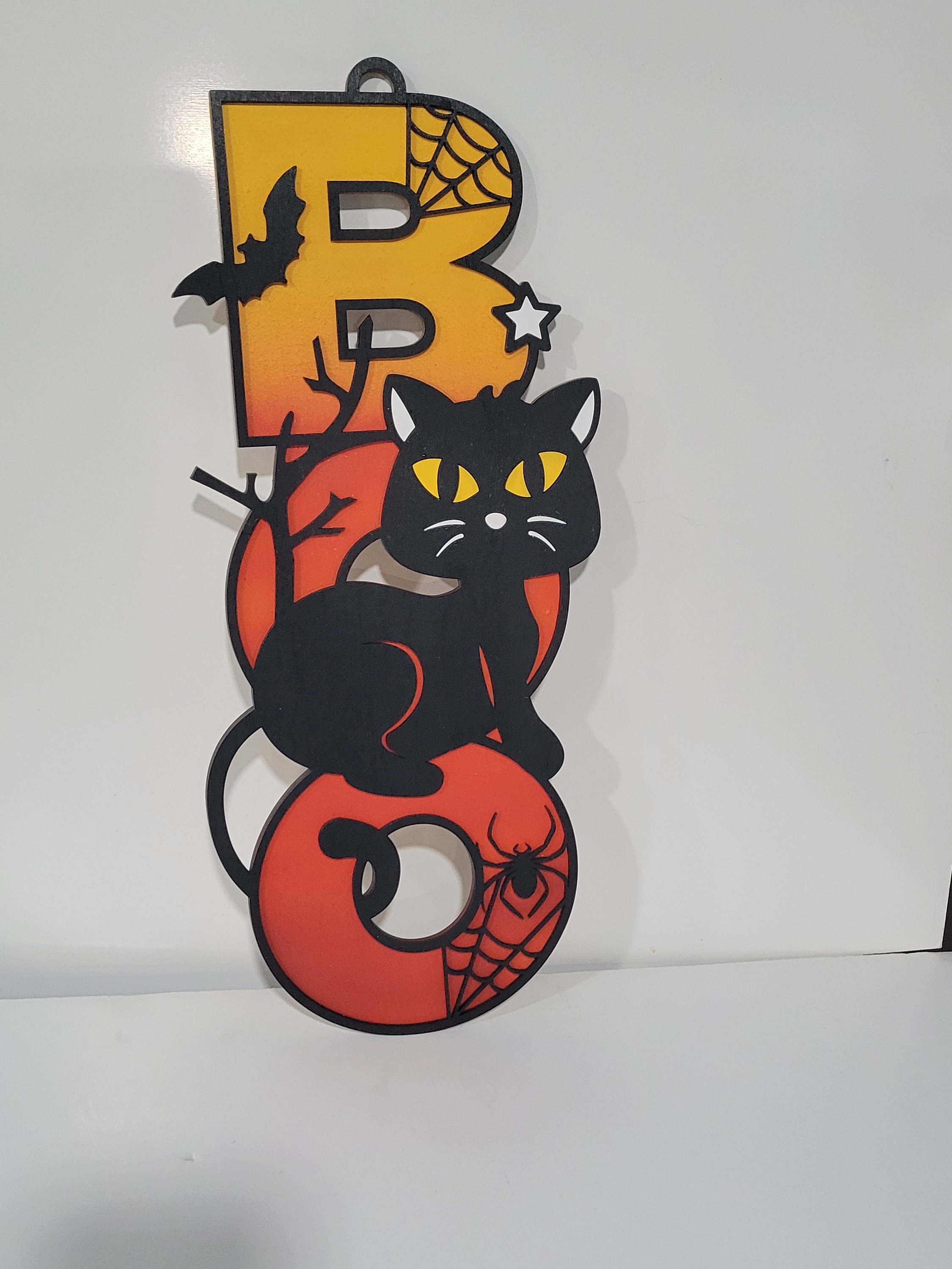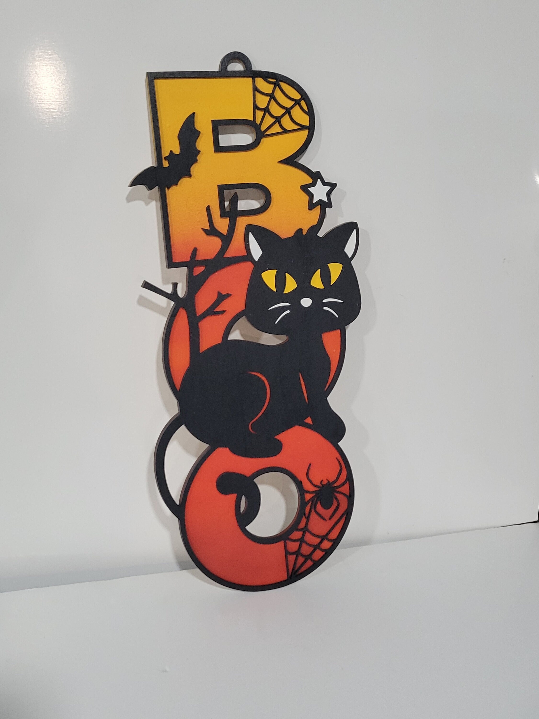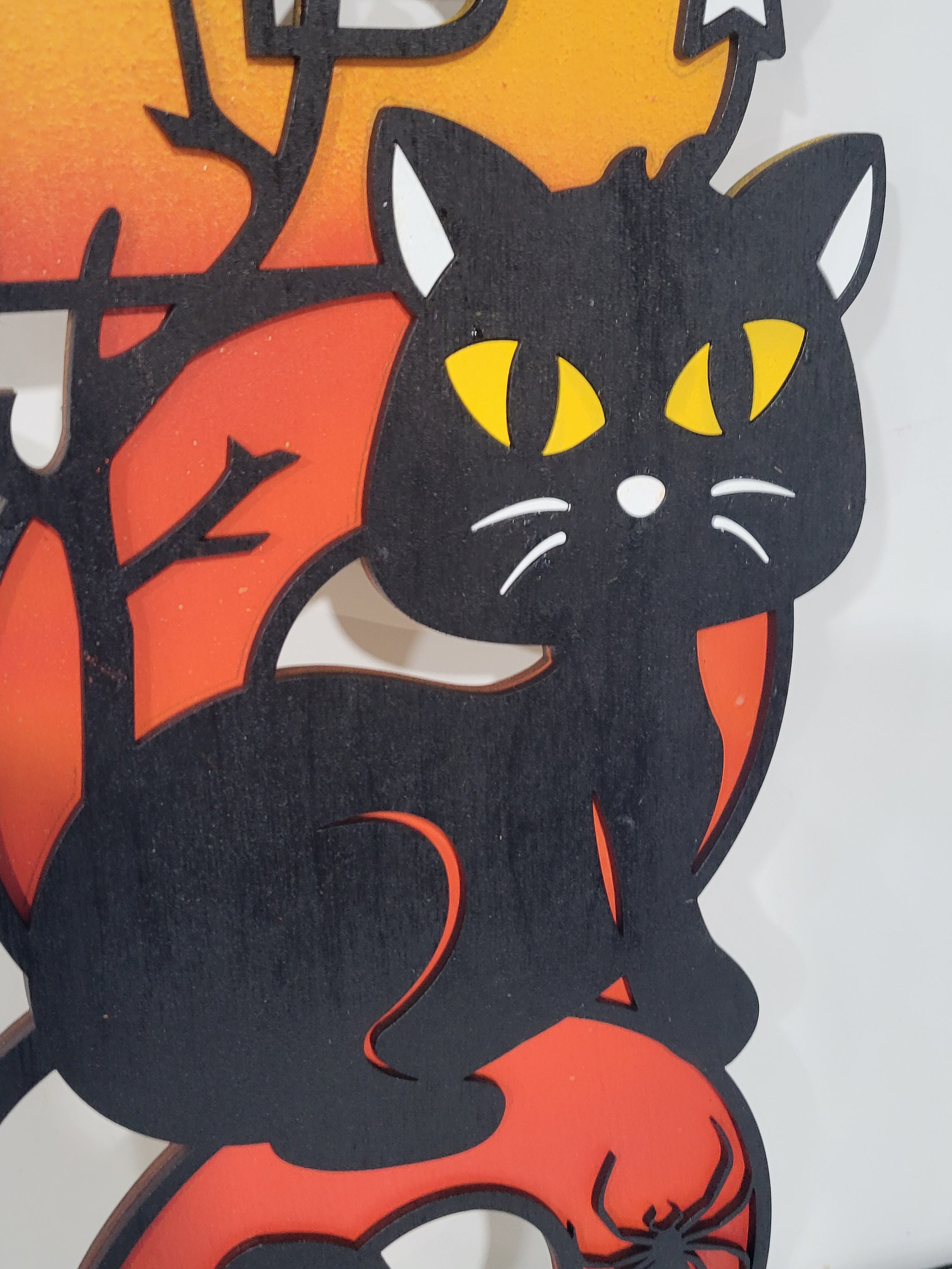 This adorable wood cat sign is made from two layers of Baltic birch wood and spray painted.