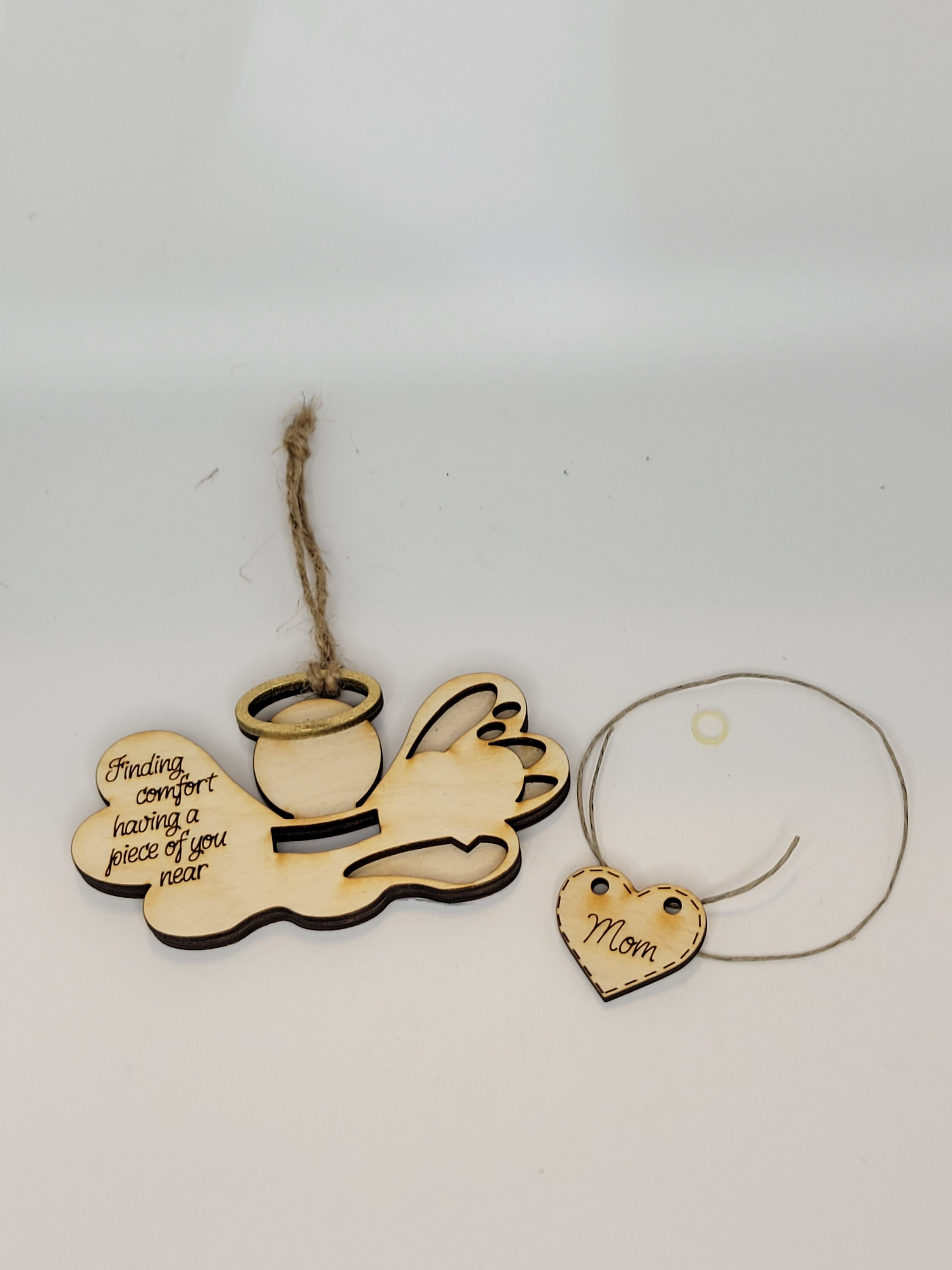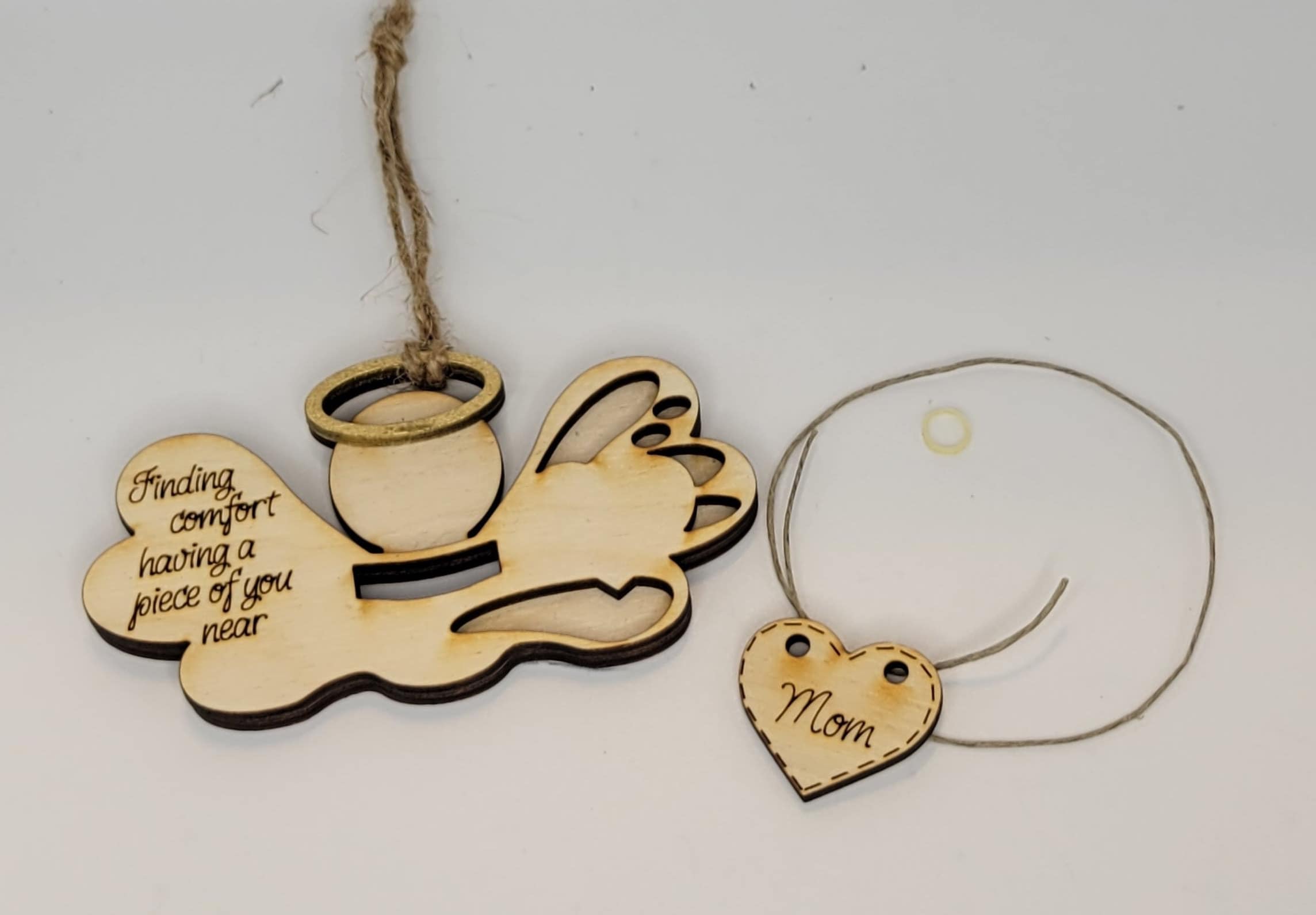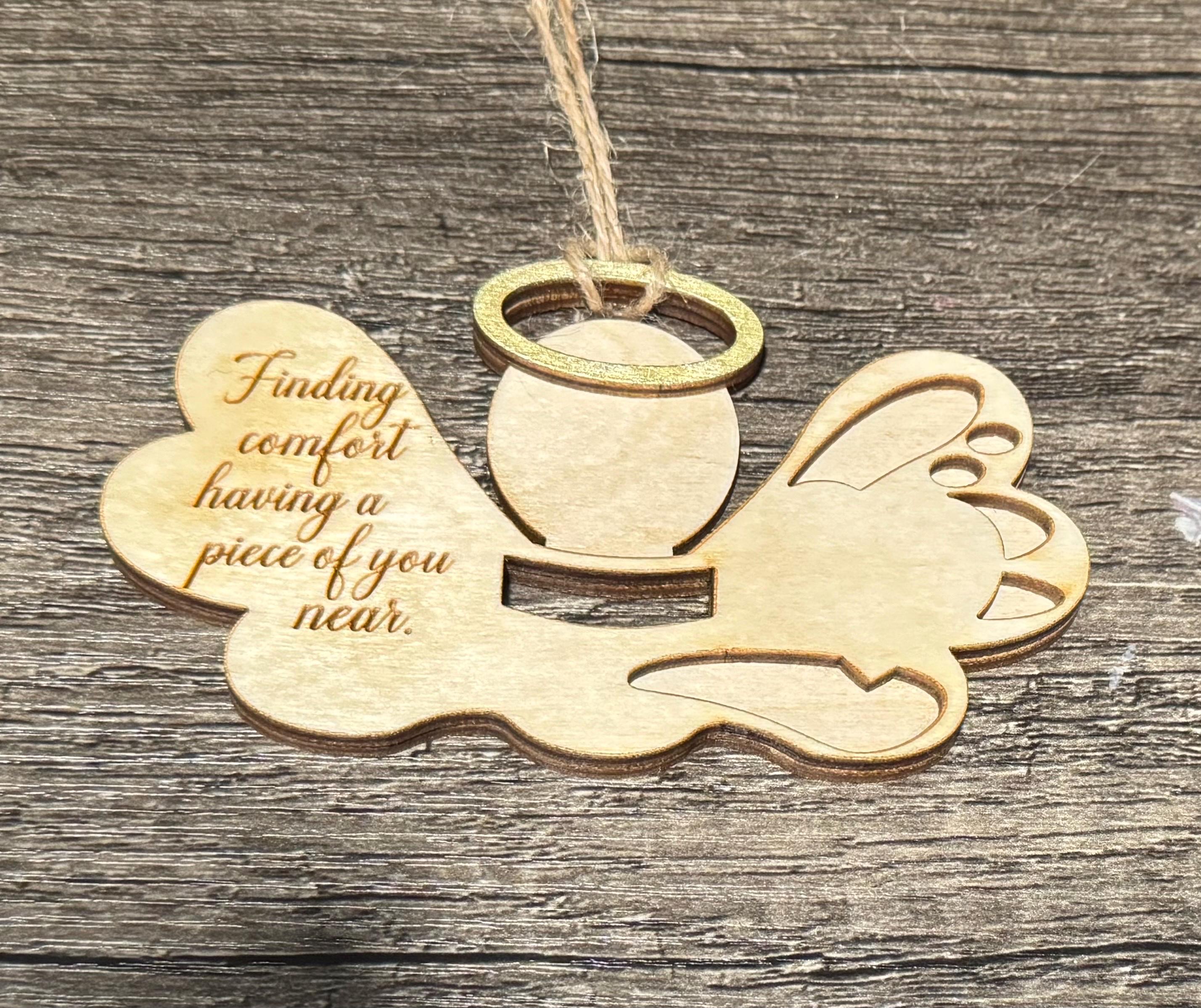 Assembled wings with engraved saying: Finding Comfort Having You Near and a jute hanger