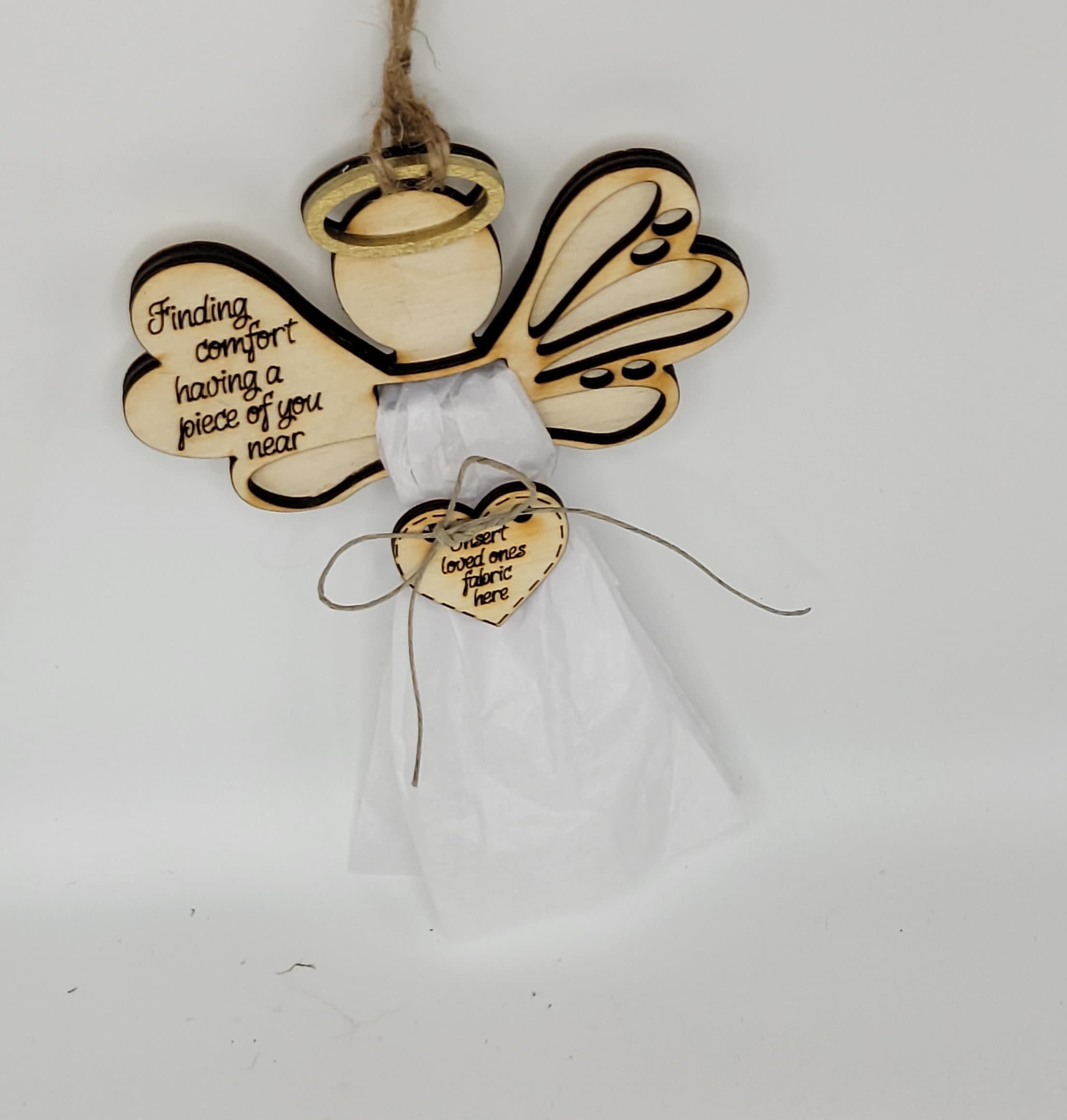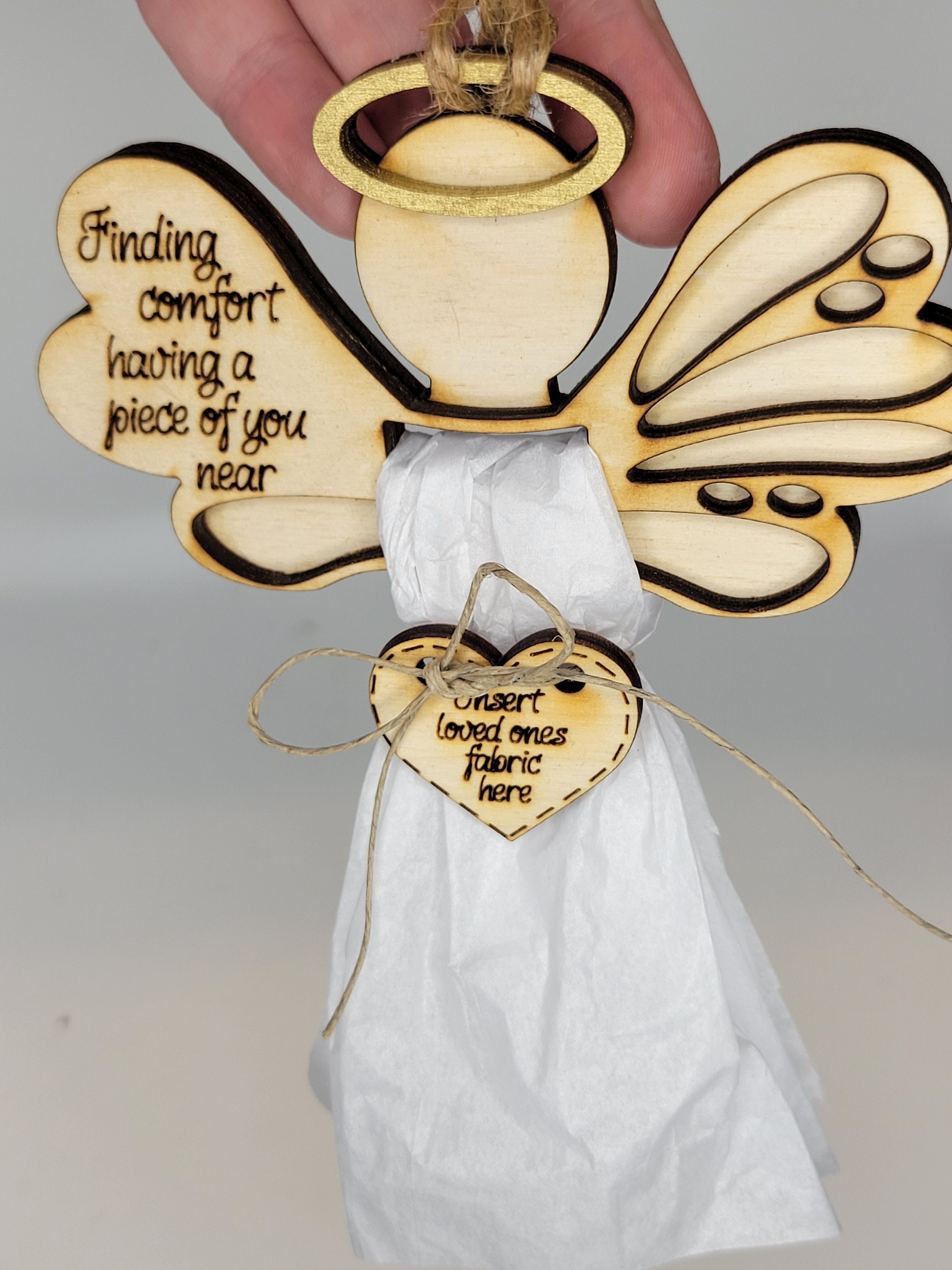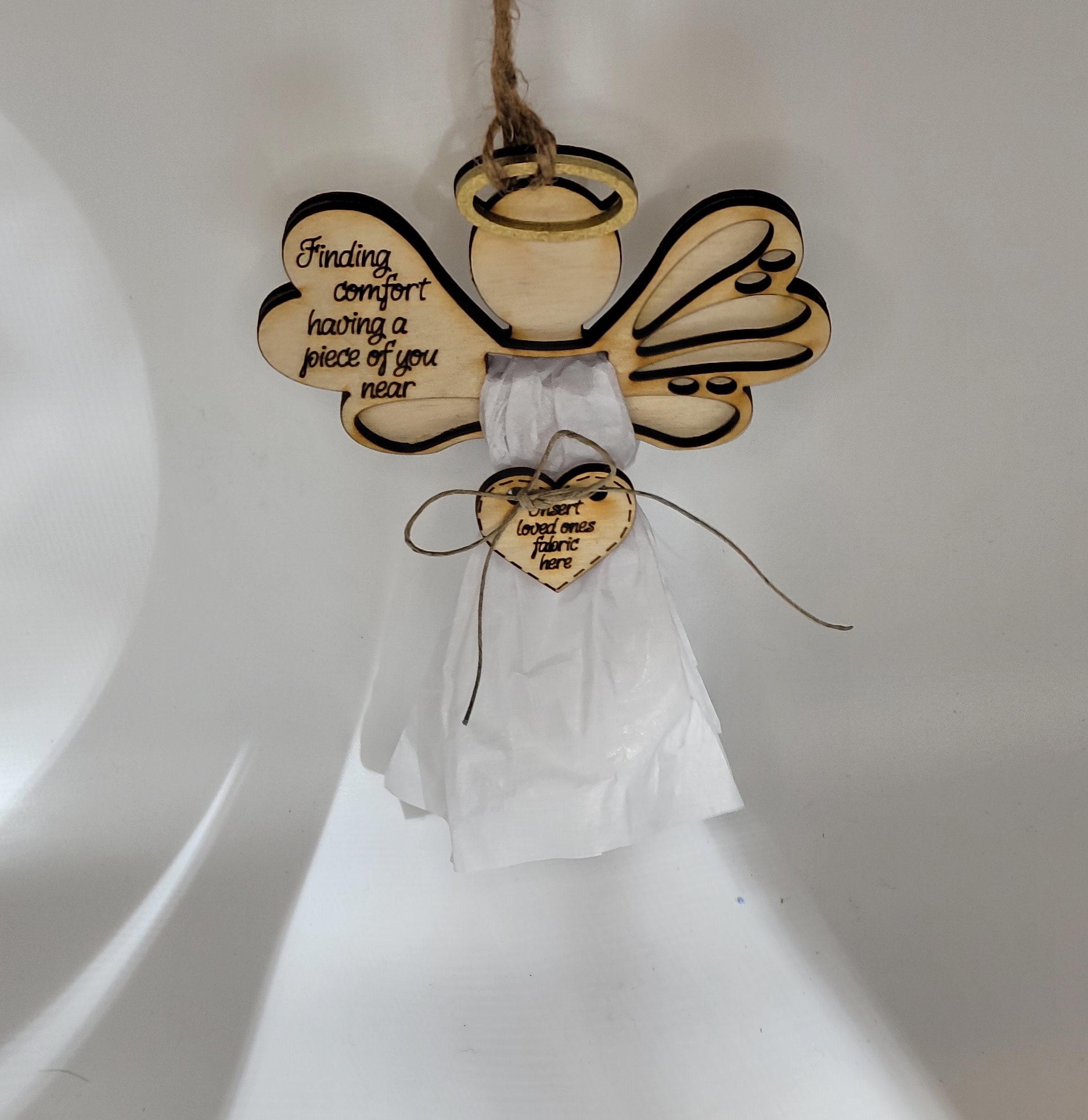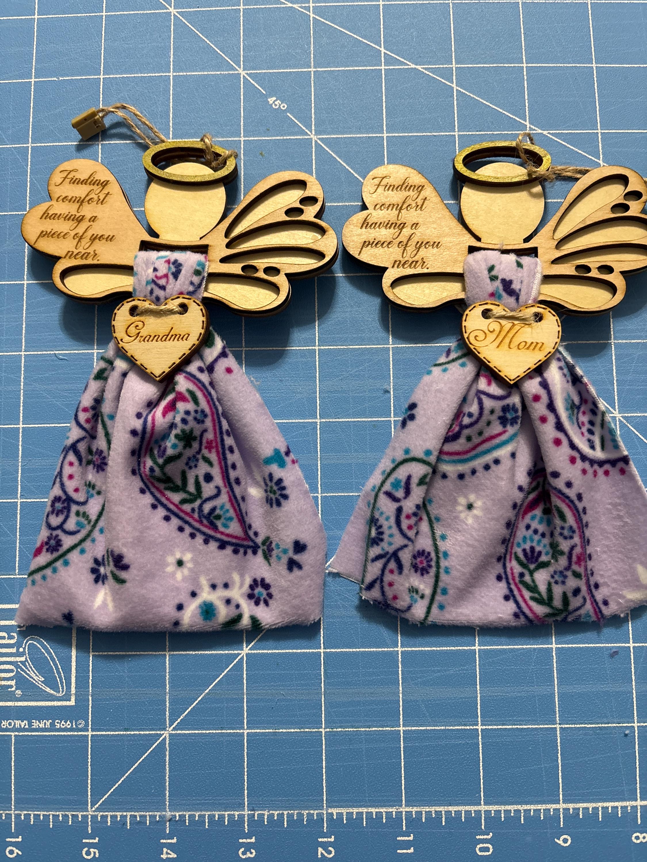 This Angel ornament kit is styled for you to use a 5x10 piece of fabric from an item of clothing from a loved one.