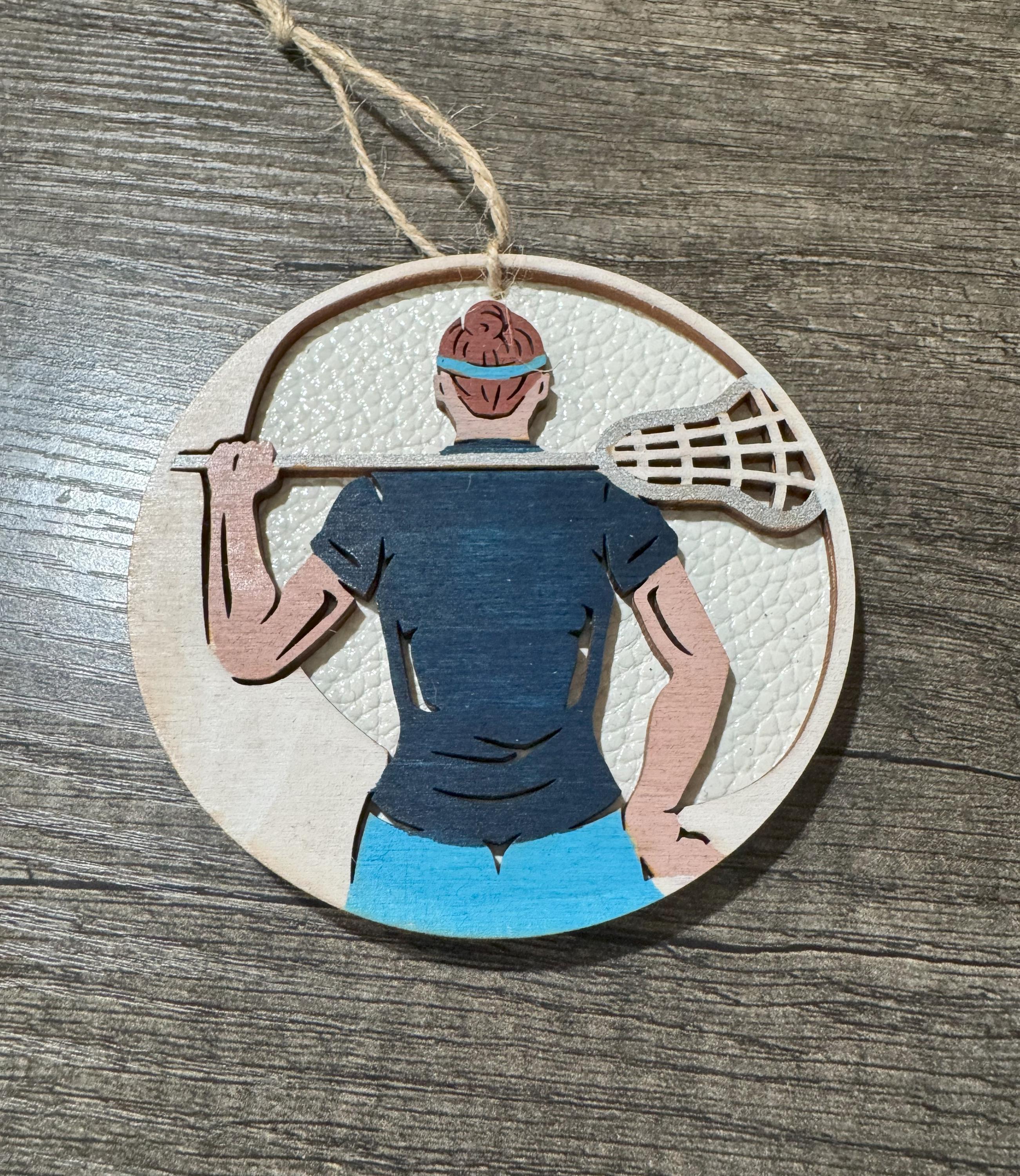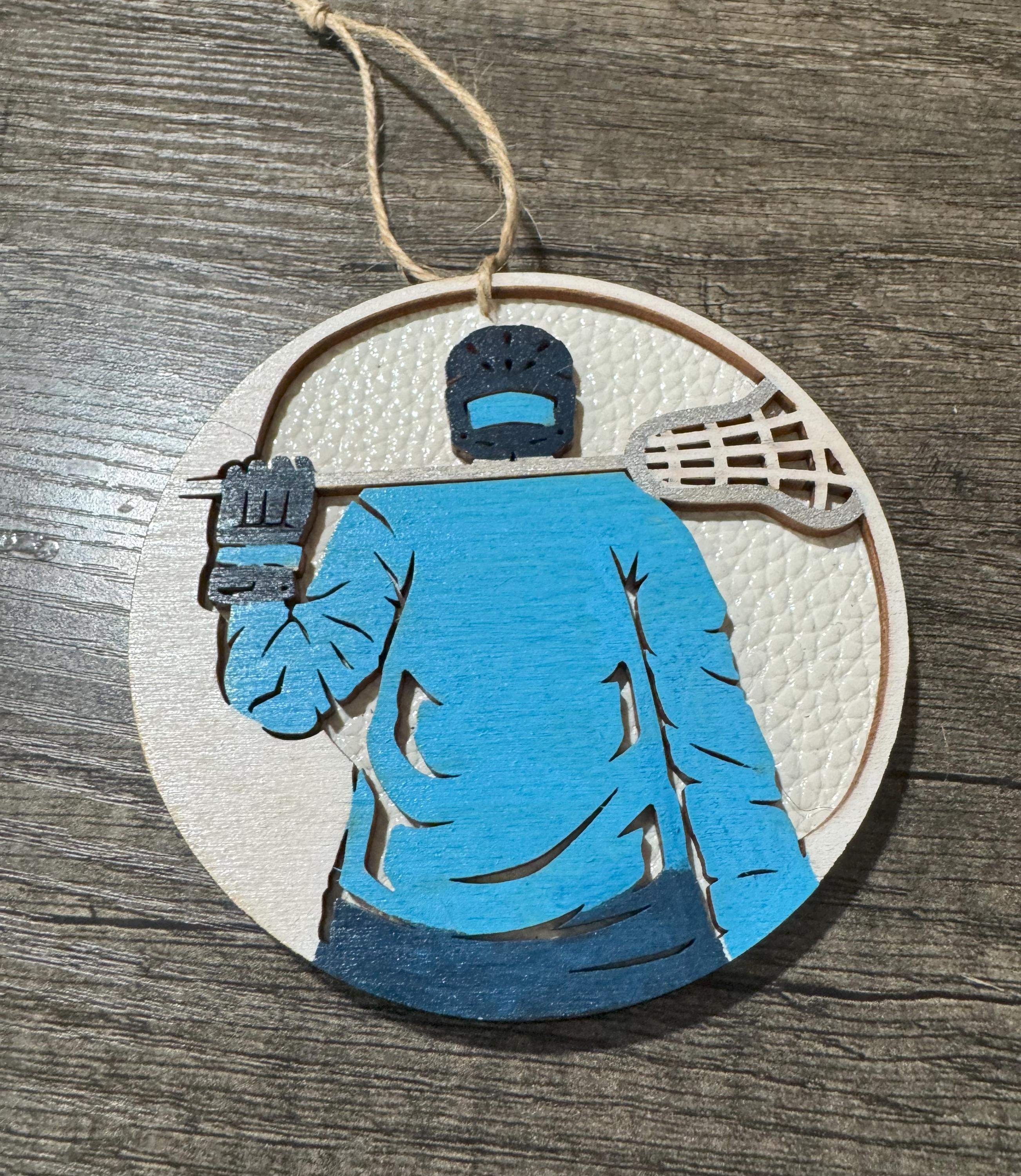 This ornament is made from two layers of 1/8" Baltic birch wood with a faux leather covering on the backing.