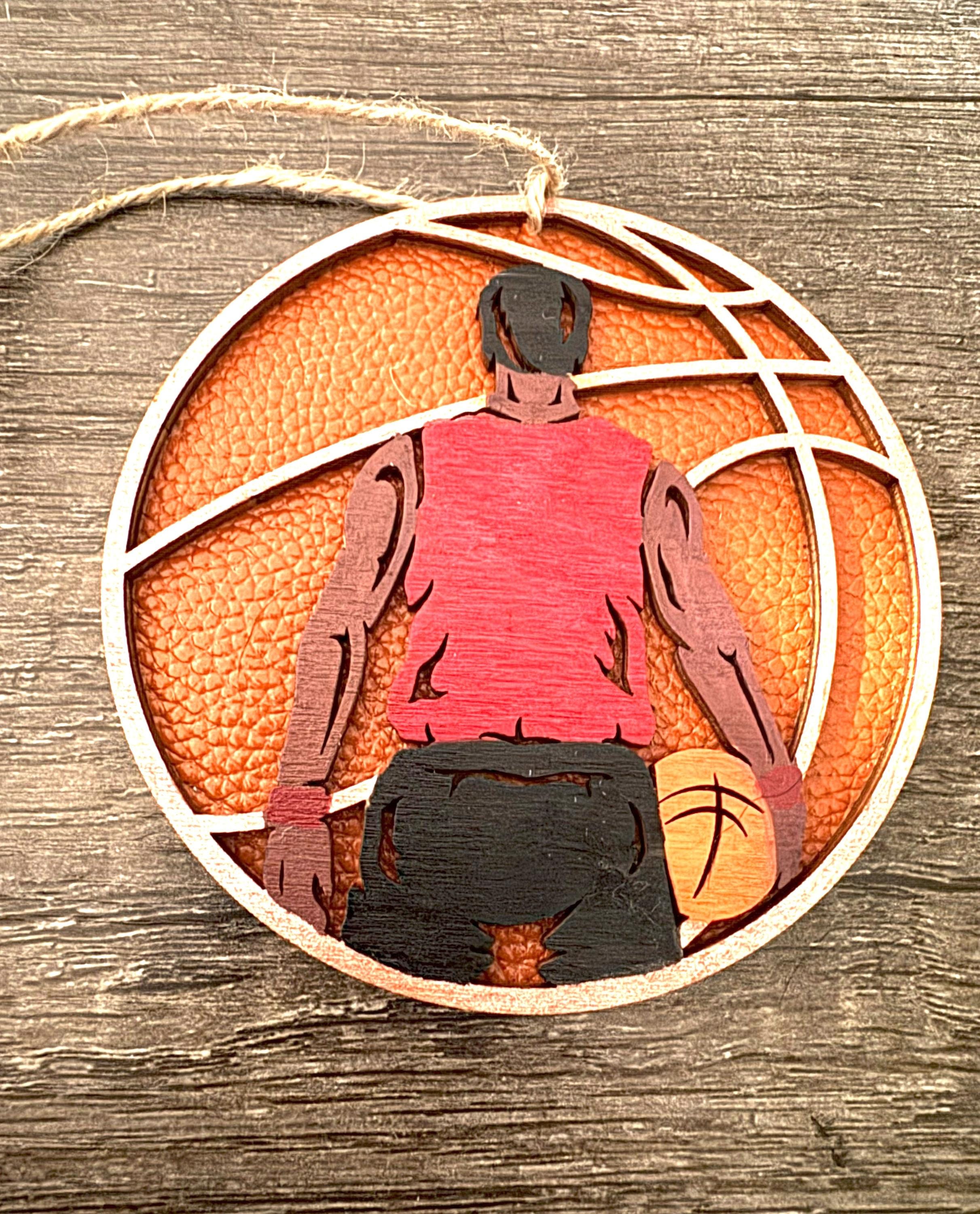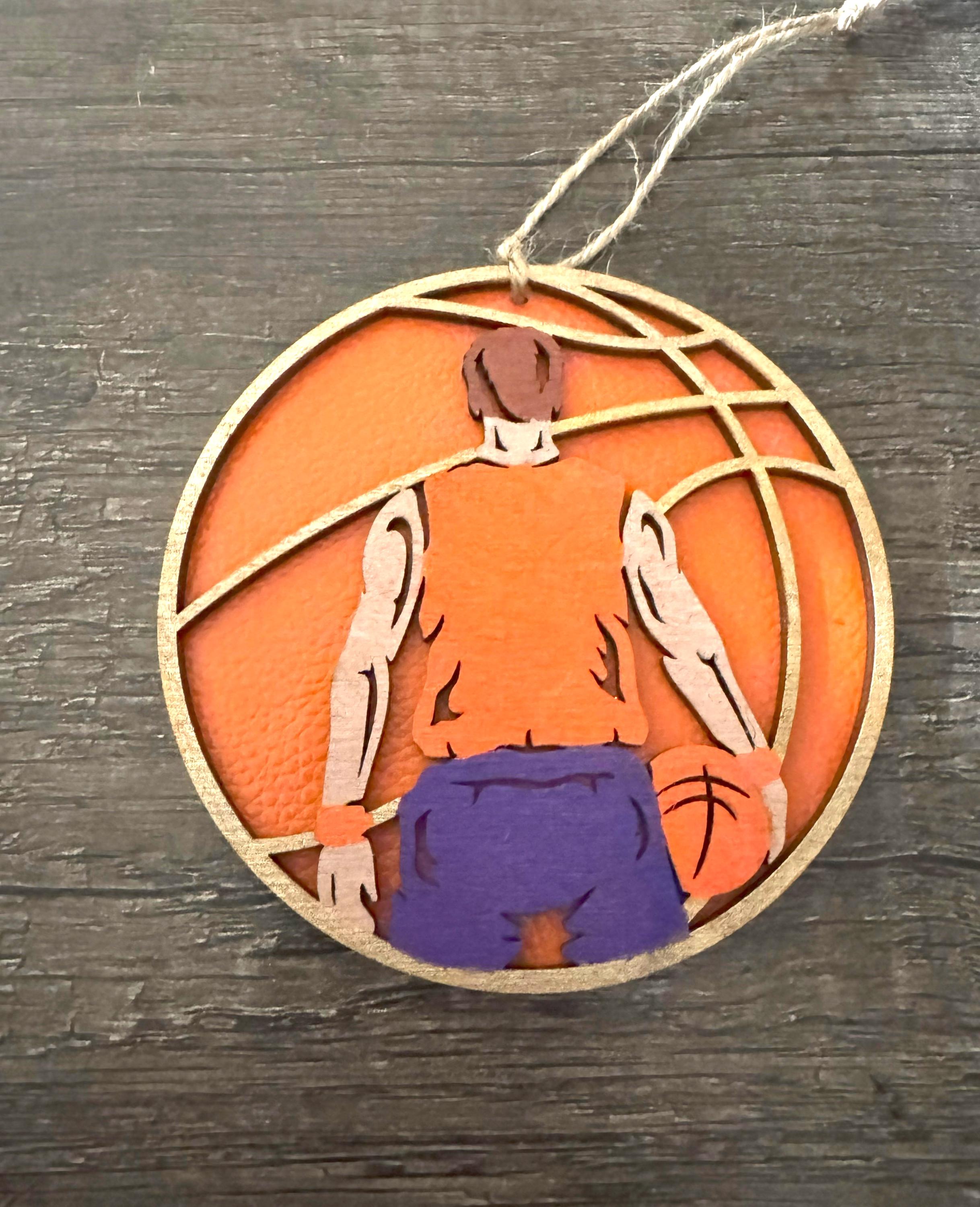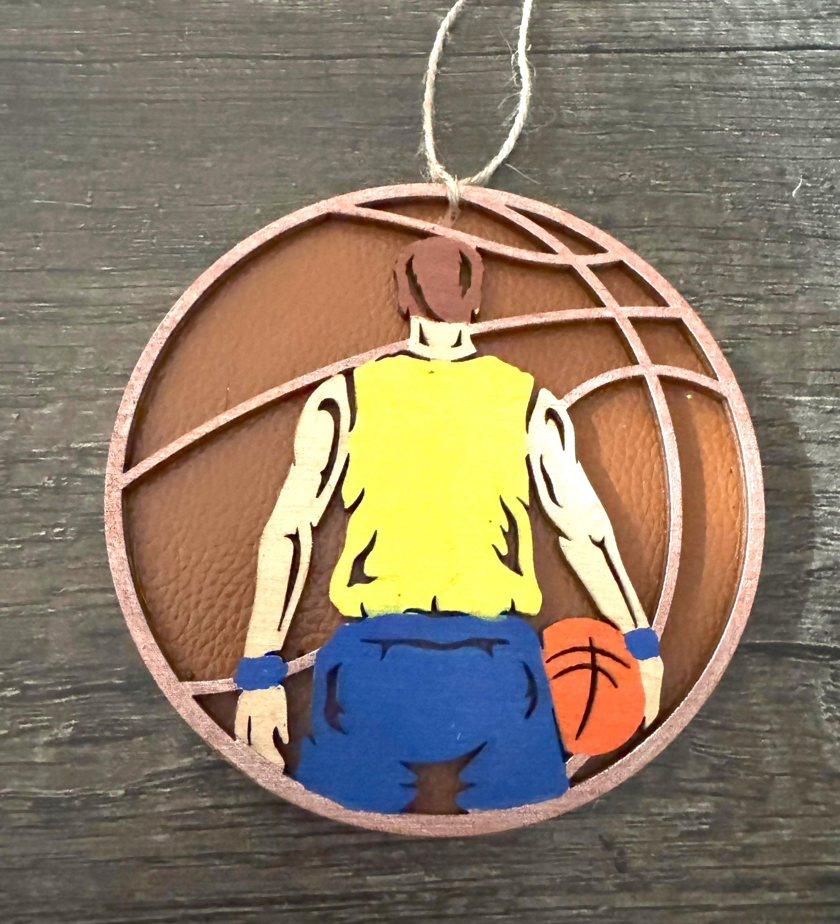 This ornament is made from two layers of 1/8" Baltic birch wood with a faux leather covering on the backing. The top can be handpainted, left natural, stained, or painted all black like a silhouette (see examples above).