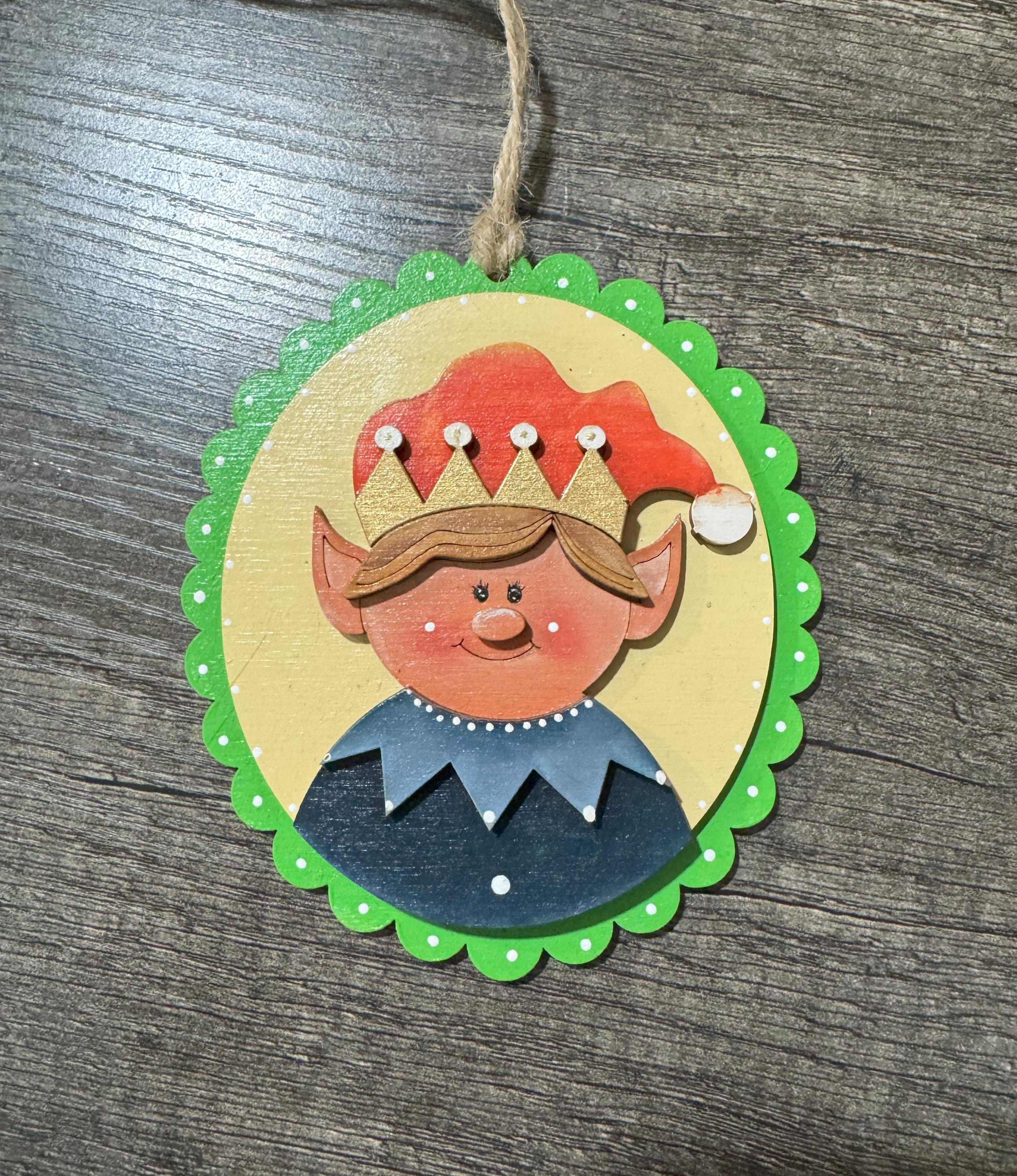 This adorable elf ornament is made from layers of 1/8" Baltic Birch wood. It is hand-painted and varnished.