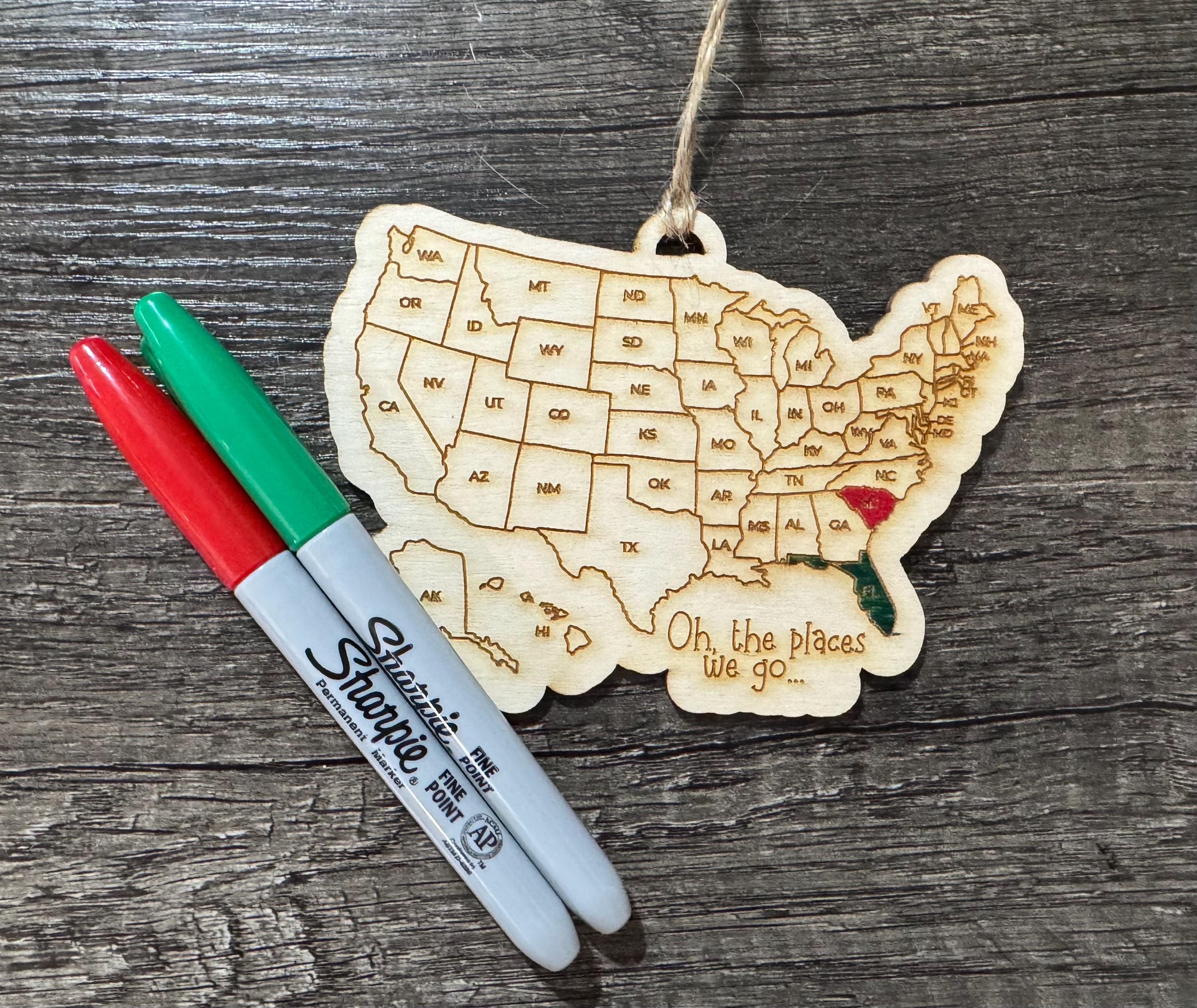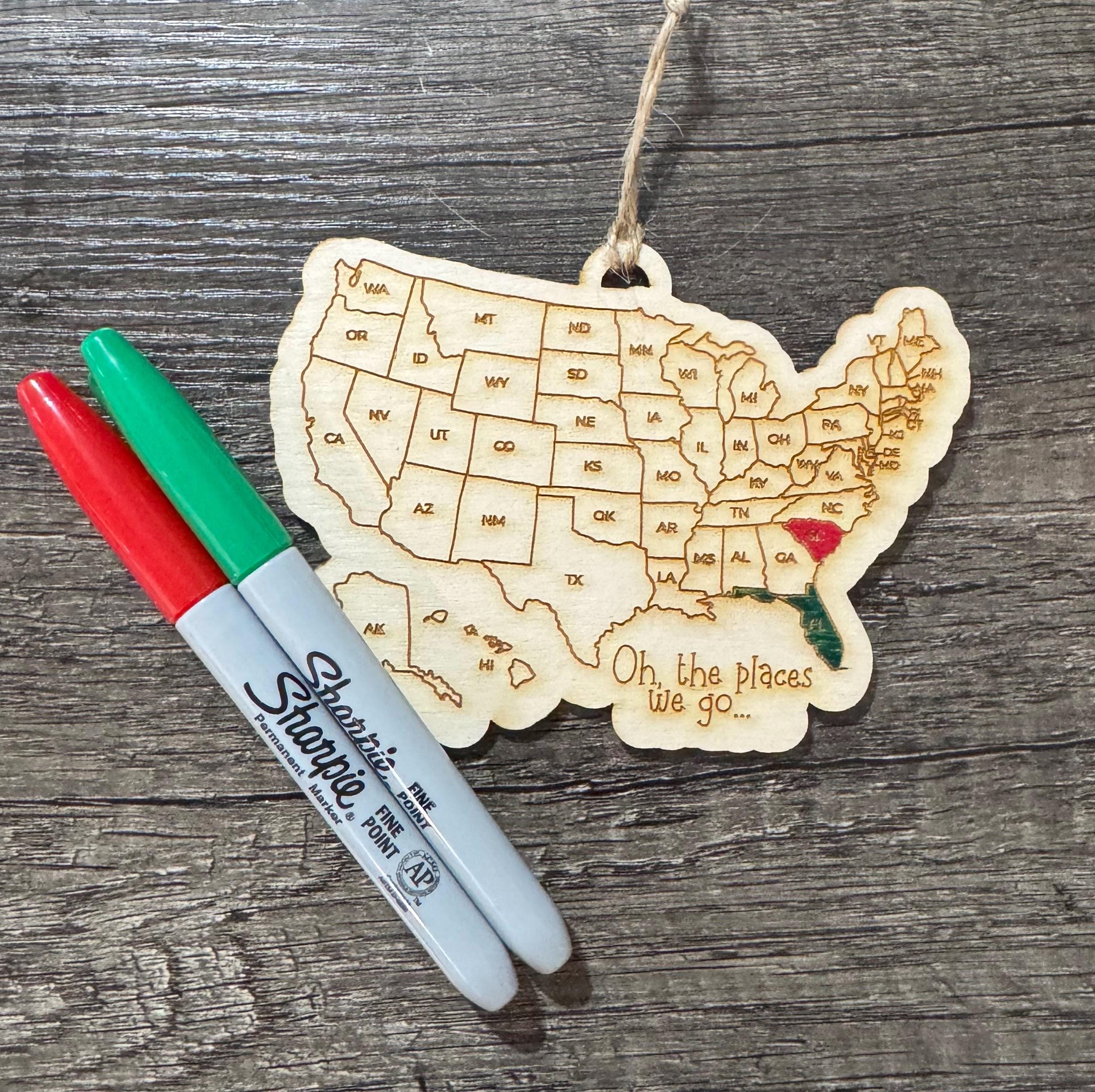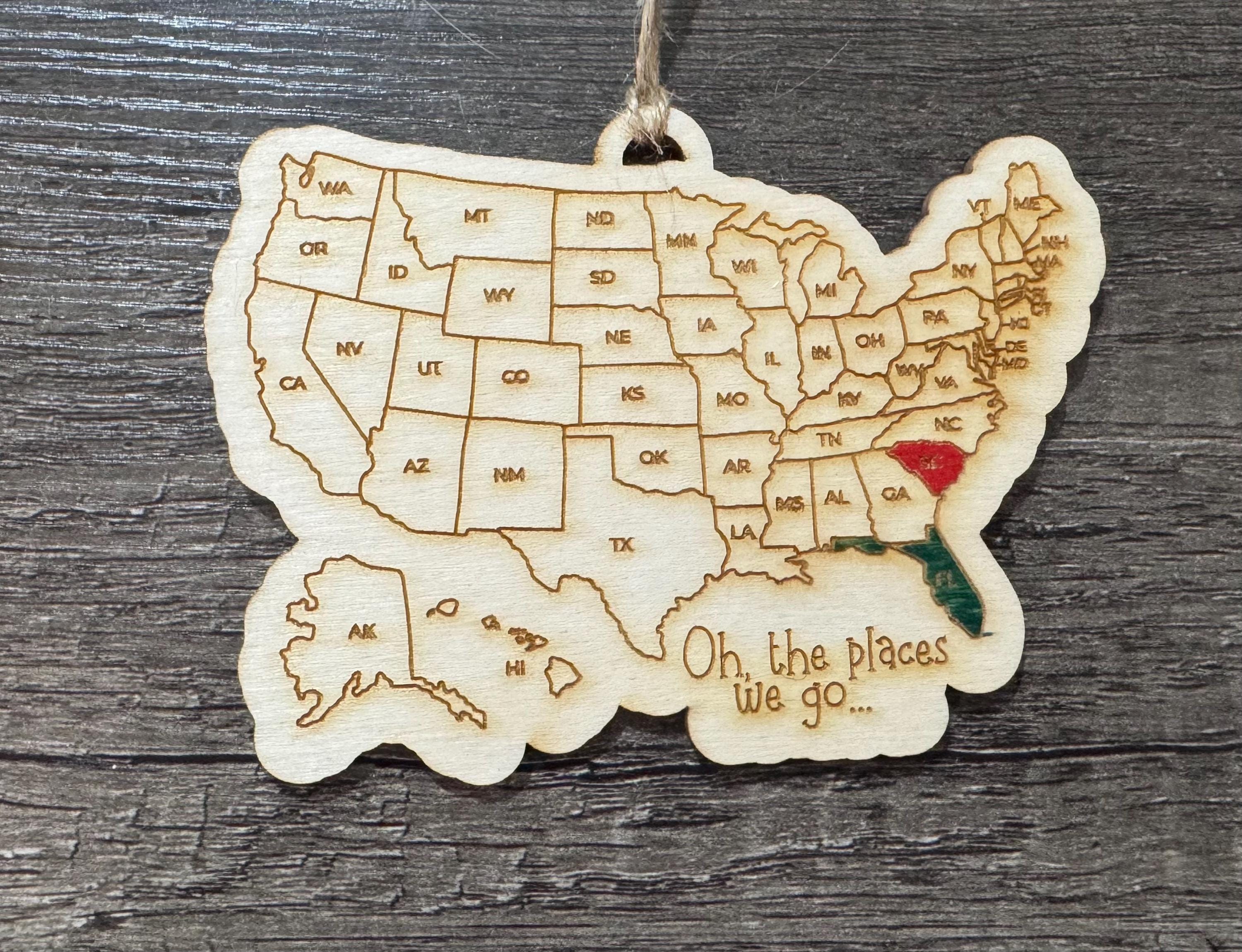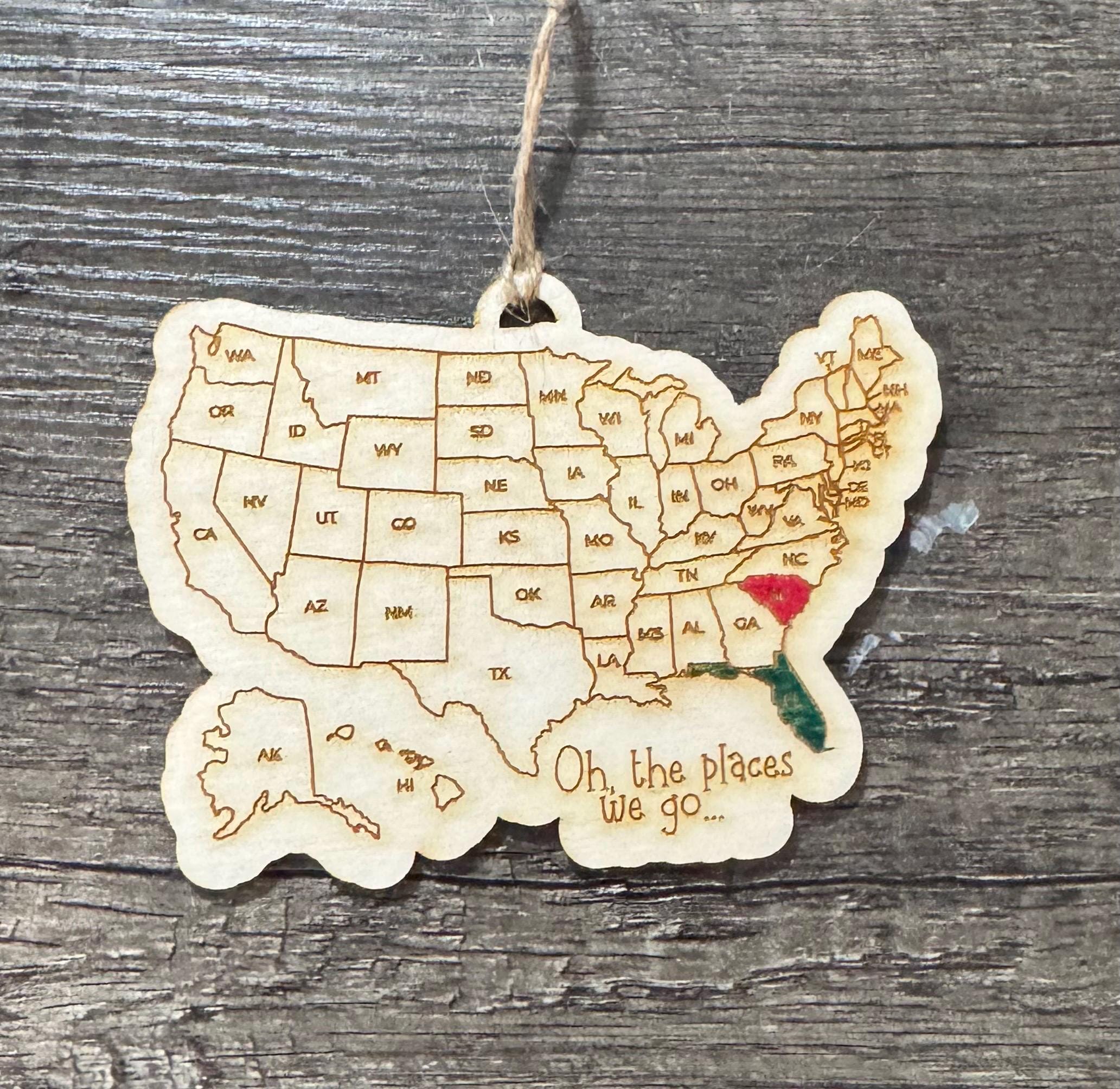 Please choose if you would like the standard USA ornament or magnet (will say "Oh the places we go") or if you would like a custom saying. If choosing a custom saying, please leave the customization in the personalization box.