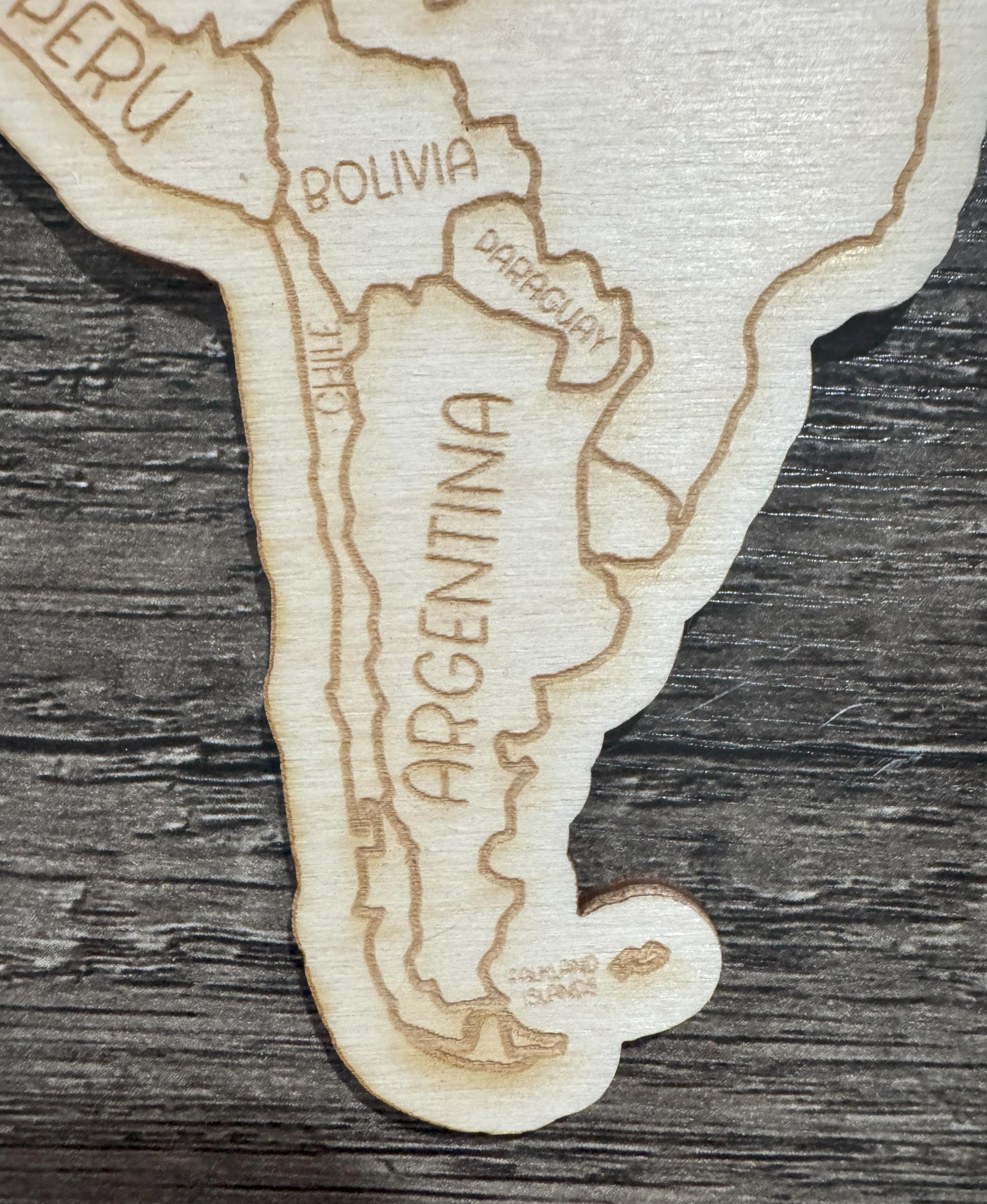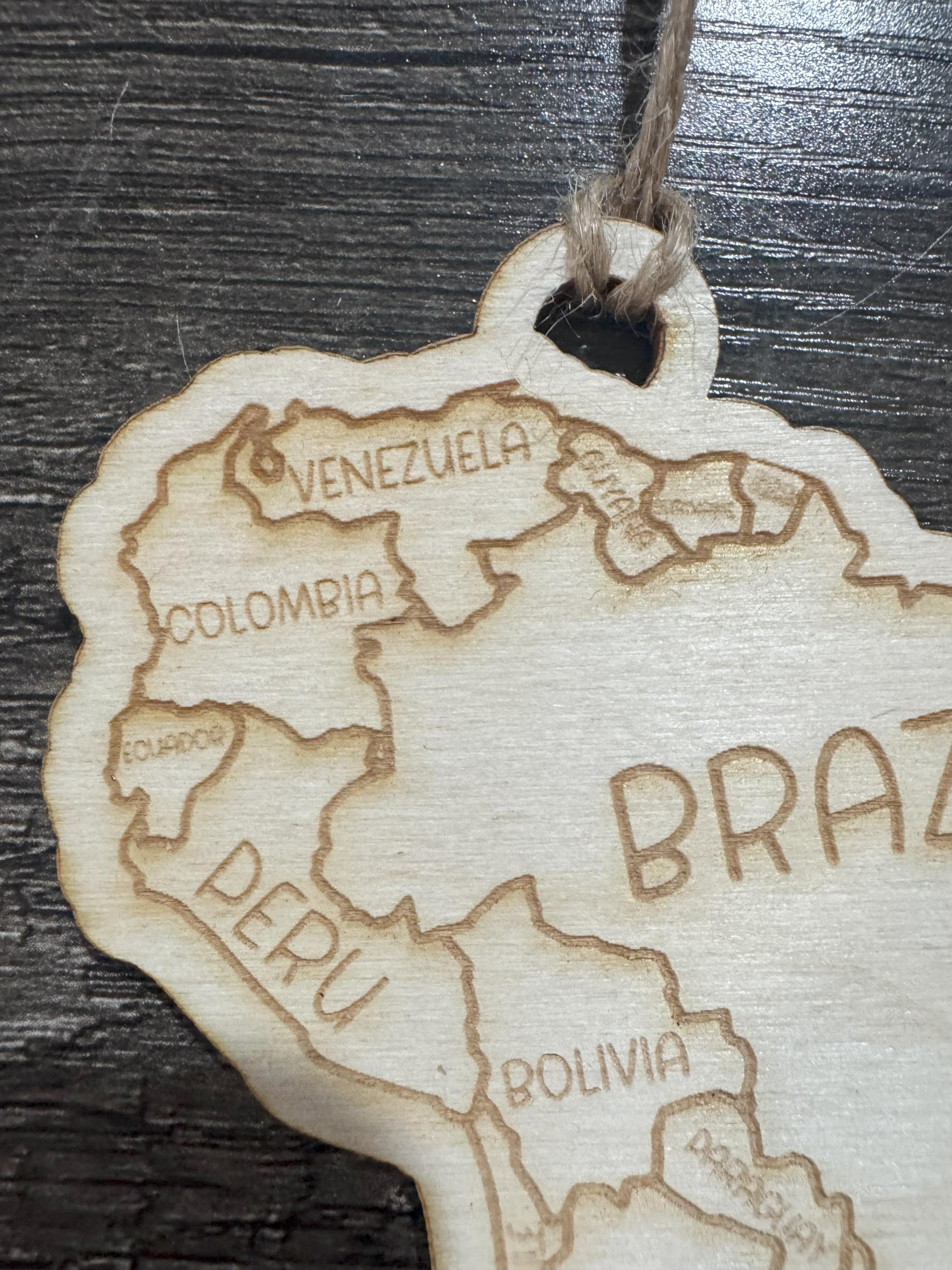 This ornament depicts South America and all of its countries.