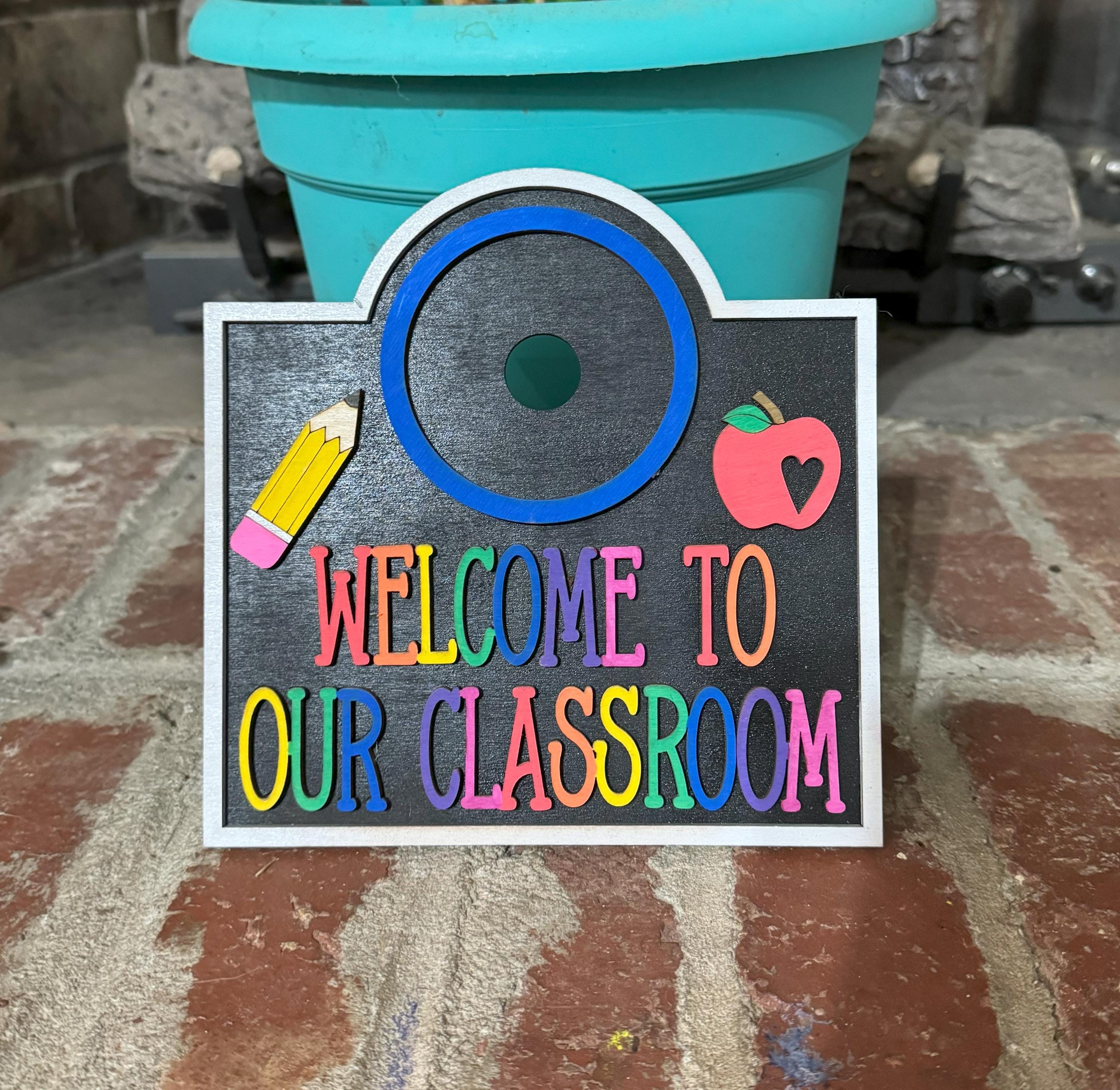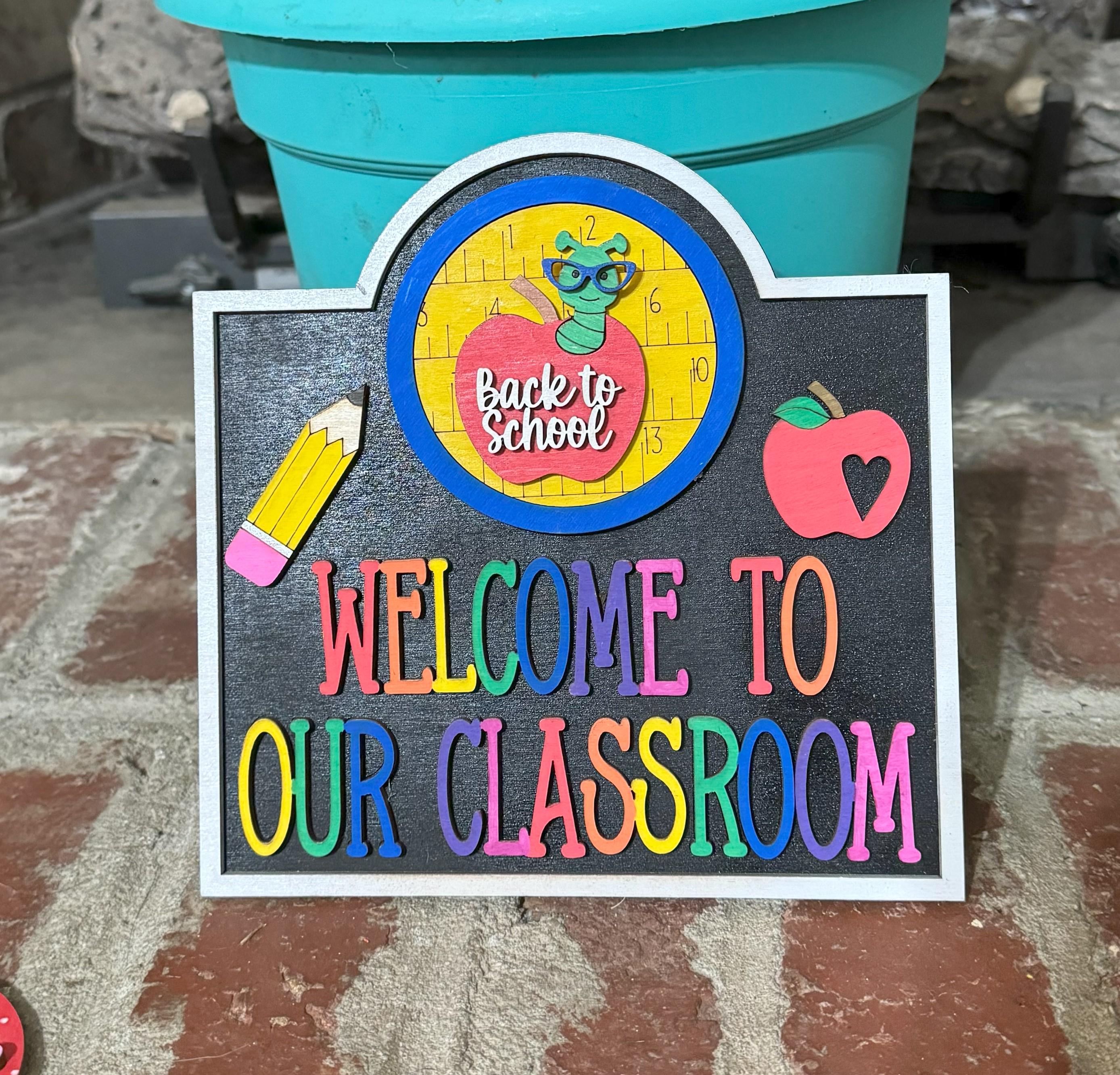Brighten your classroom with this handmade welcome sign featuring bold colors, playful lettering, and classic school icons. The cheerful design helps create a warm, inviting atmosphere for students and families the moment they walk in.