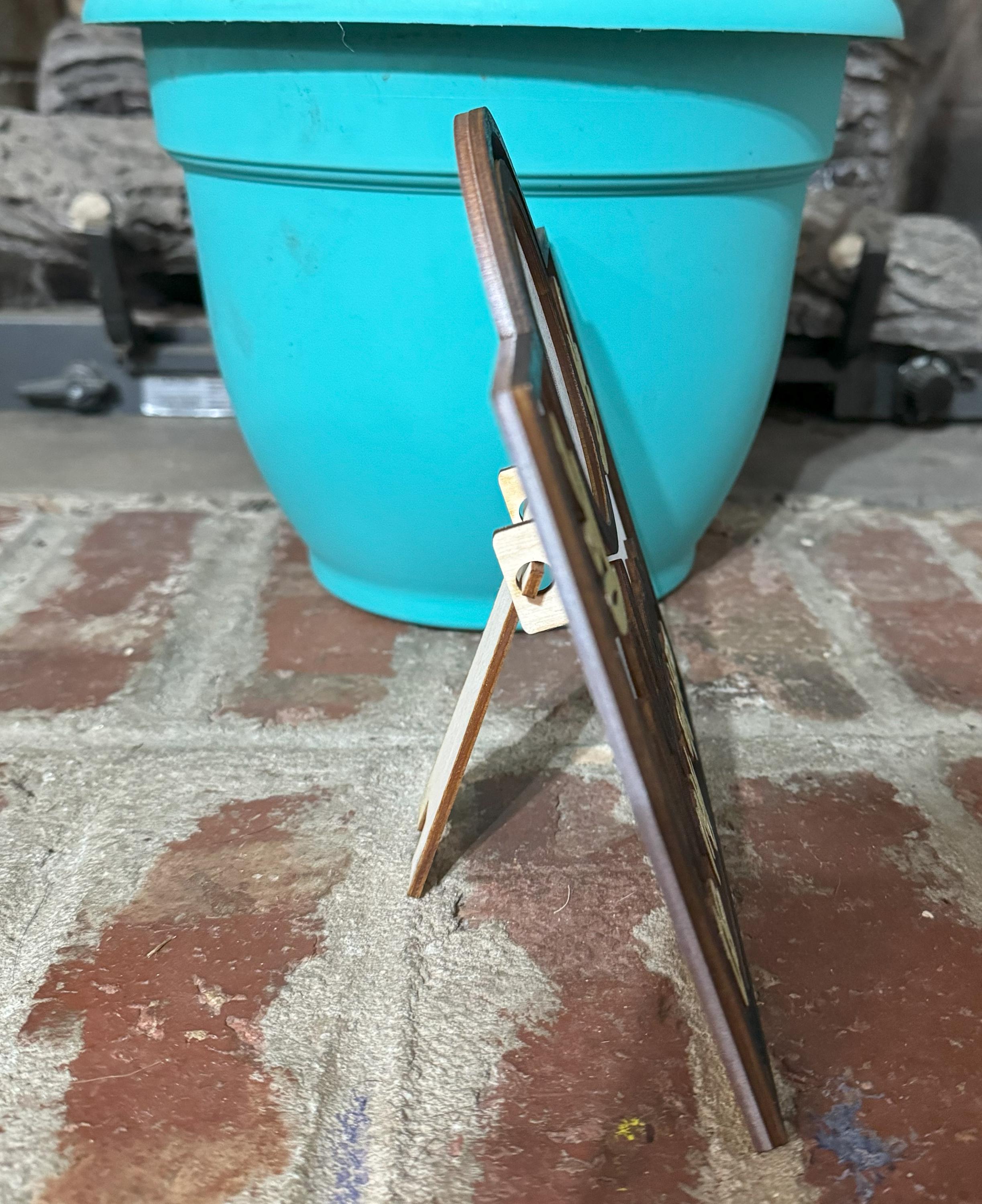 This frame is 7.5" wide and tall. The frame has an attached wood kickstand. Tiles are sold separately. Available in 1/8" or 1/4" thickness.