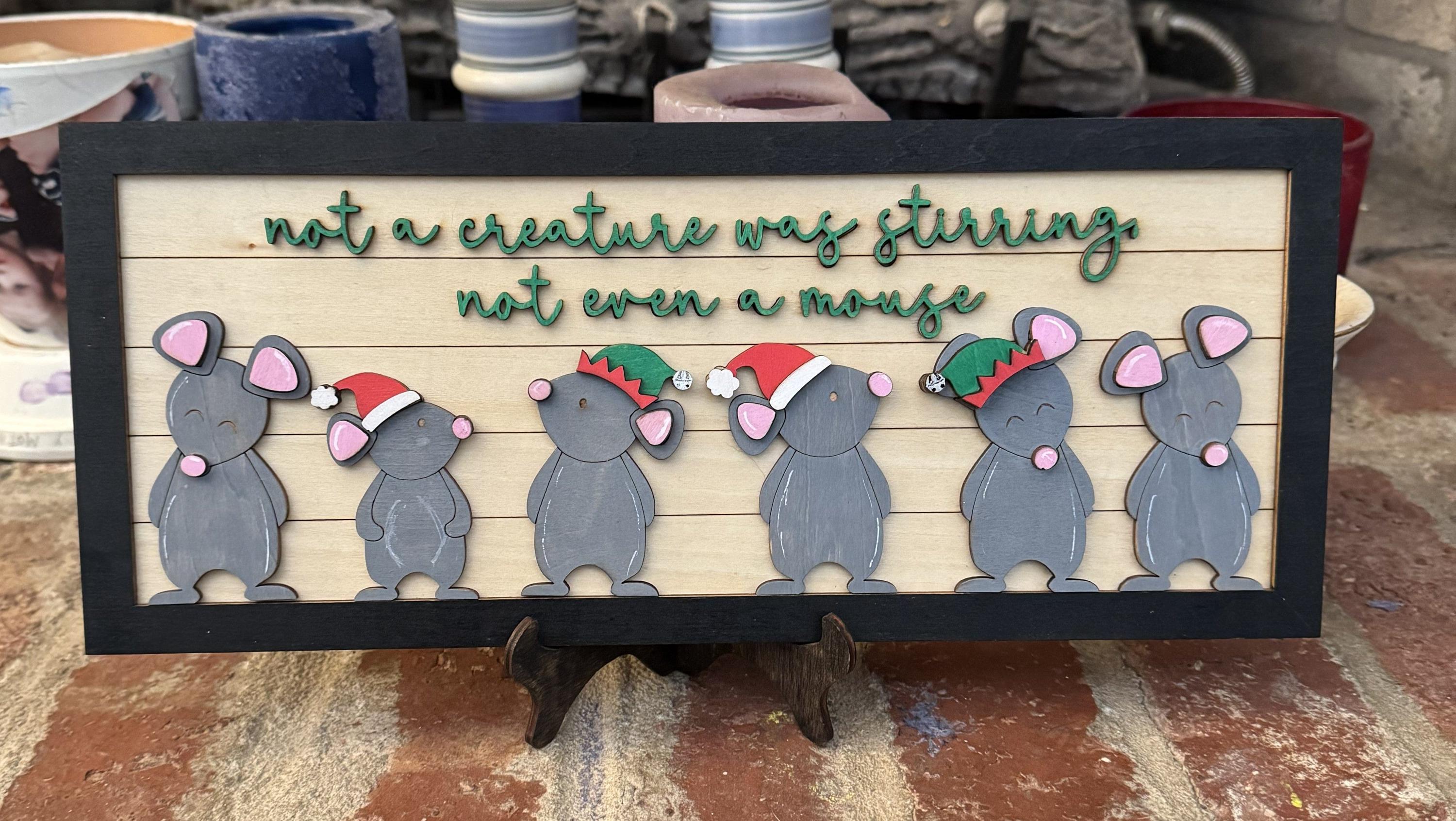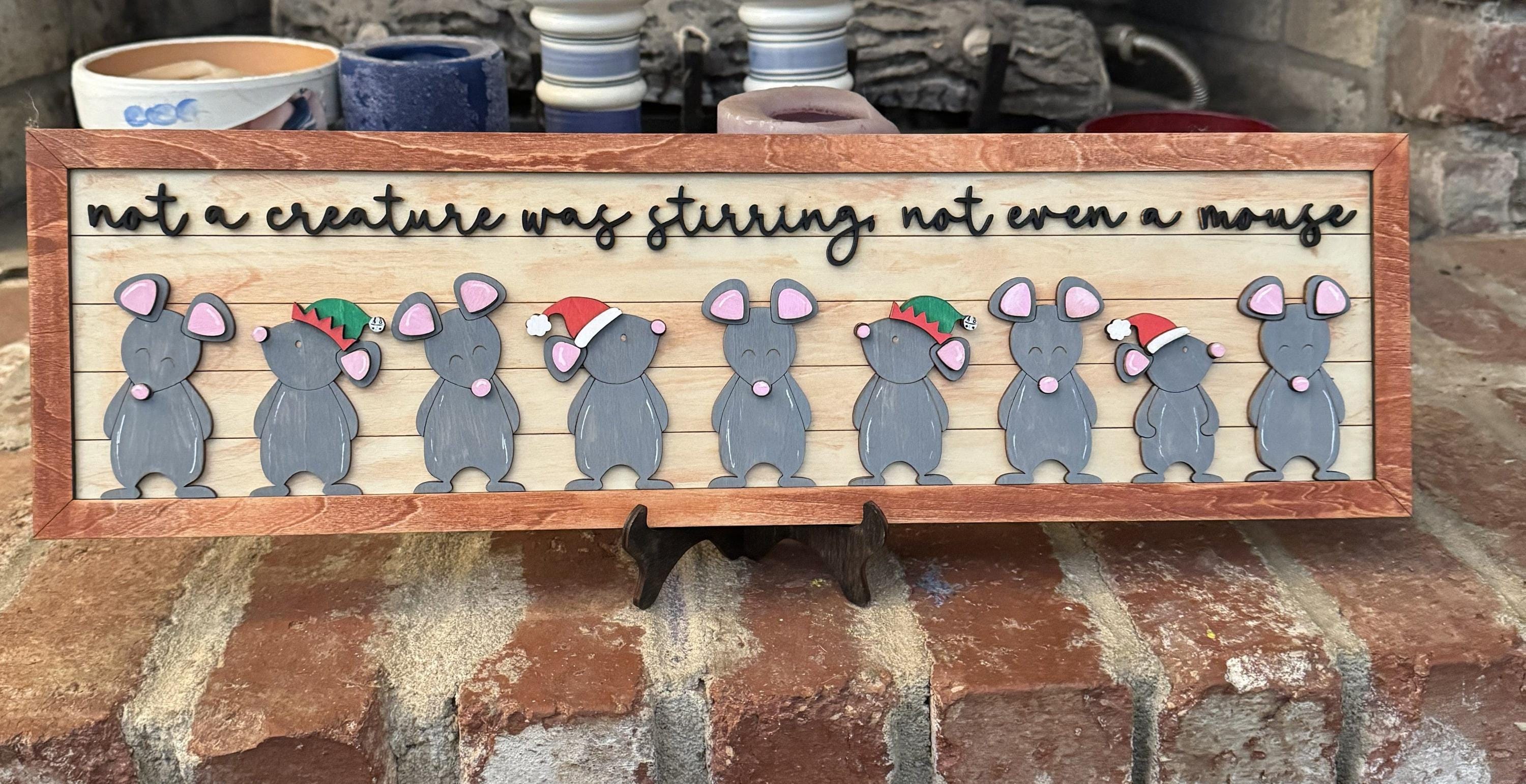 Bring festive charm to your home with this delightful Christmas wall hanging inspired by the classic holiday poem. Perfect for walls, shelves, or mantels, this customizable piece lets you personalize it with up to 9 adorable mouse characters. Each mouse adds warmth and whimsy to your seasonal décor, making it a conversation starter that captures the magic of Christmas morning. Whether you're decorating a cozy corner or creating a focal point in your holiday display, this charming hanging celebrates the wonder of the season while adding a playful touch to your festive arrangements.