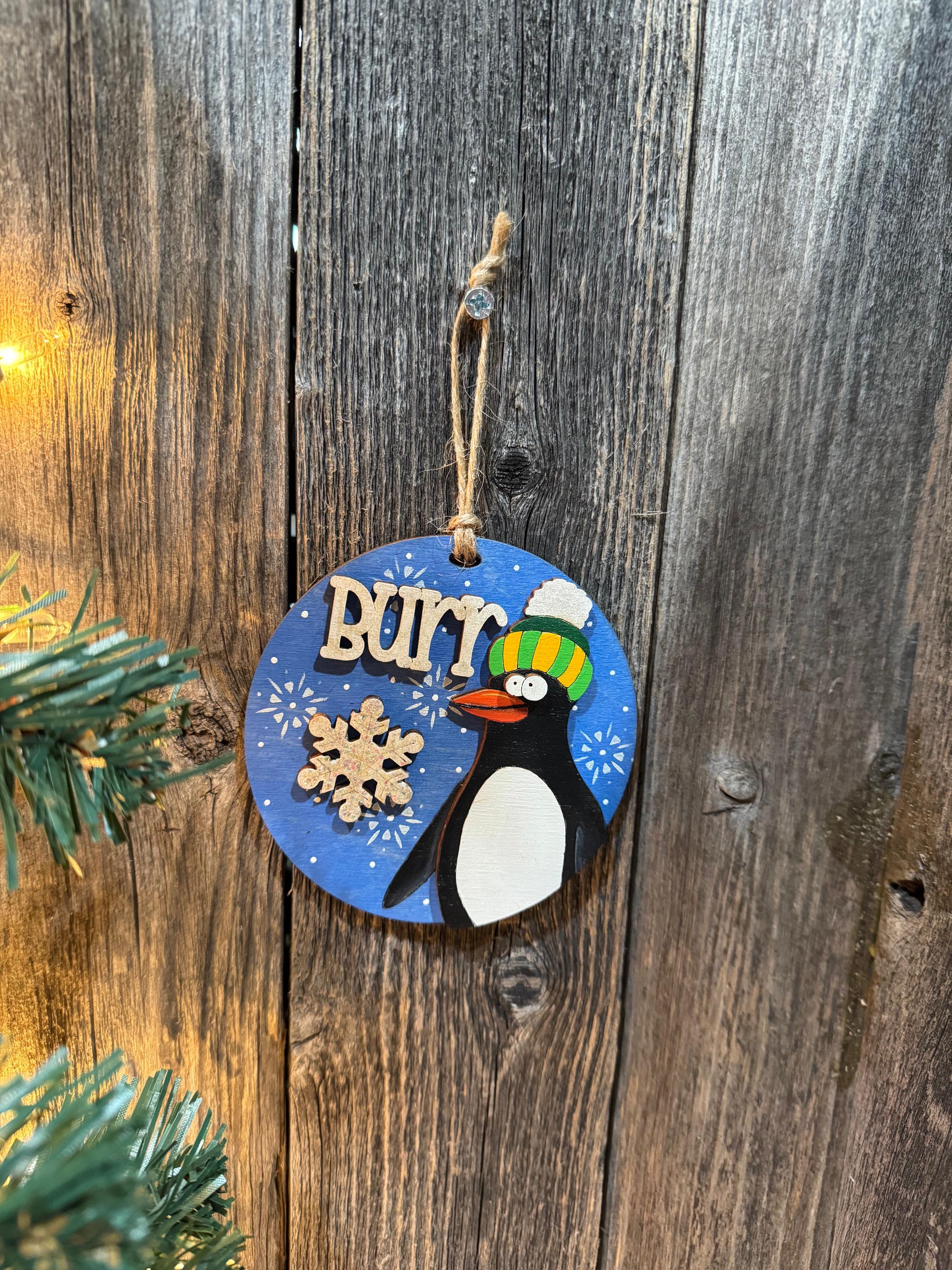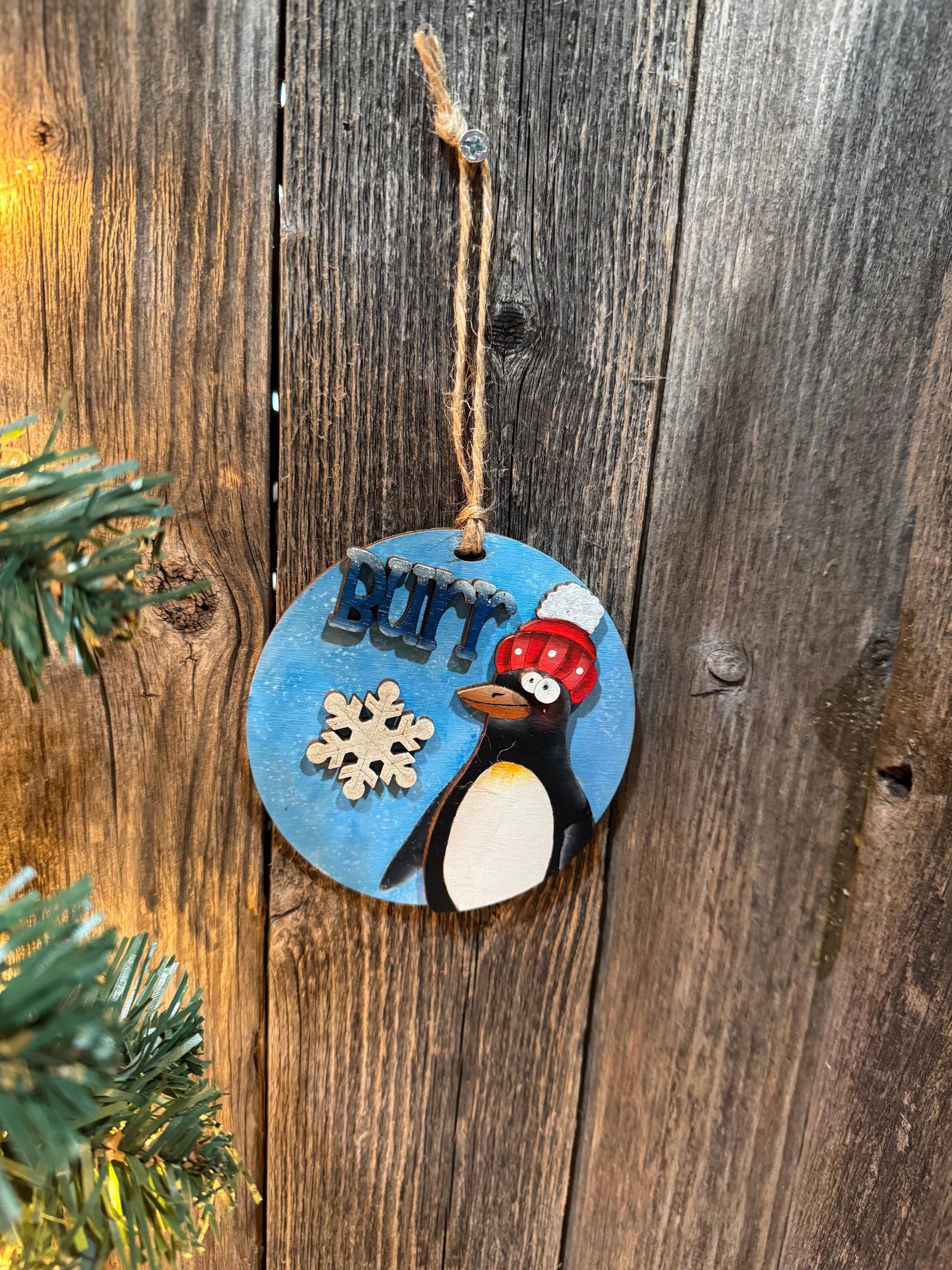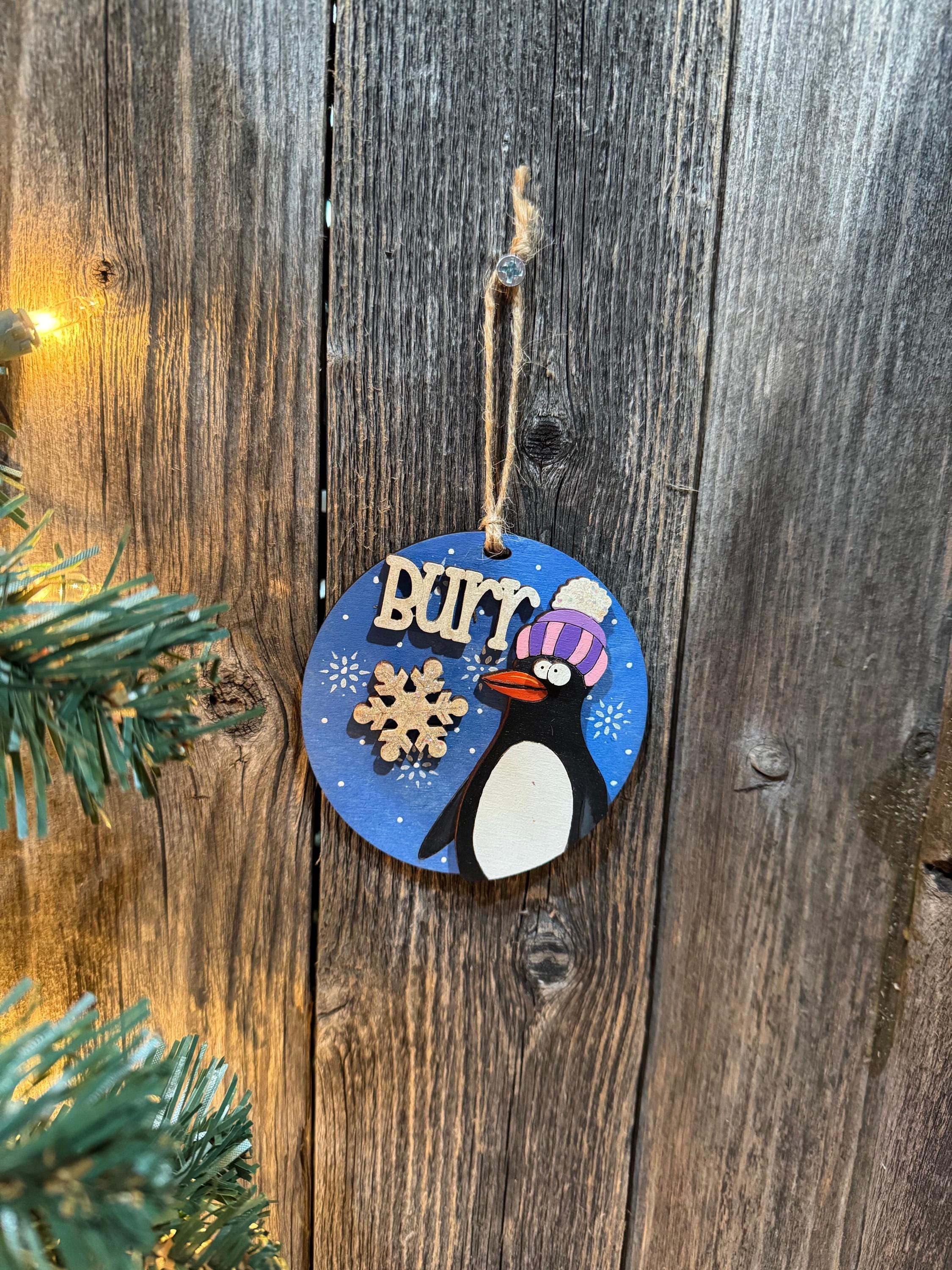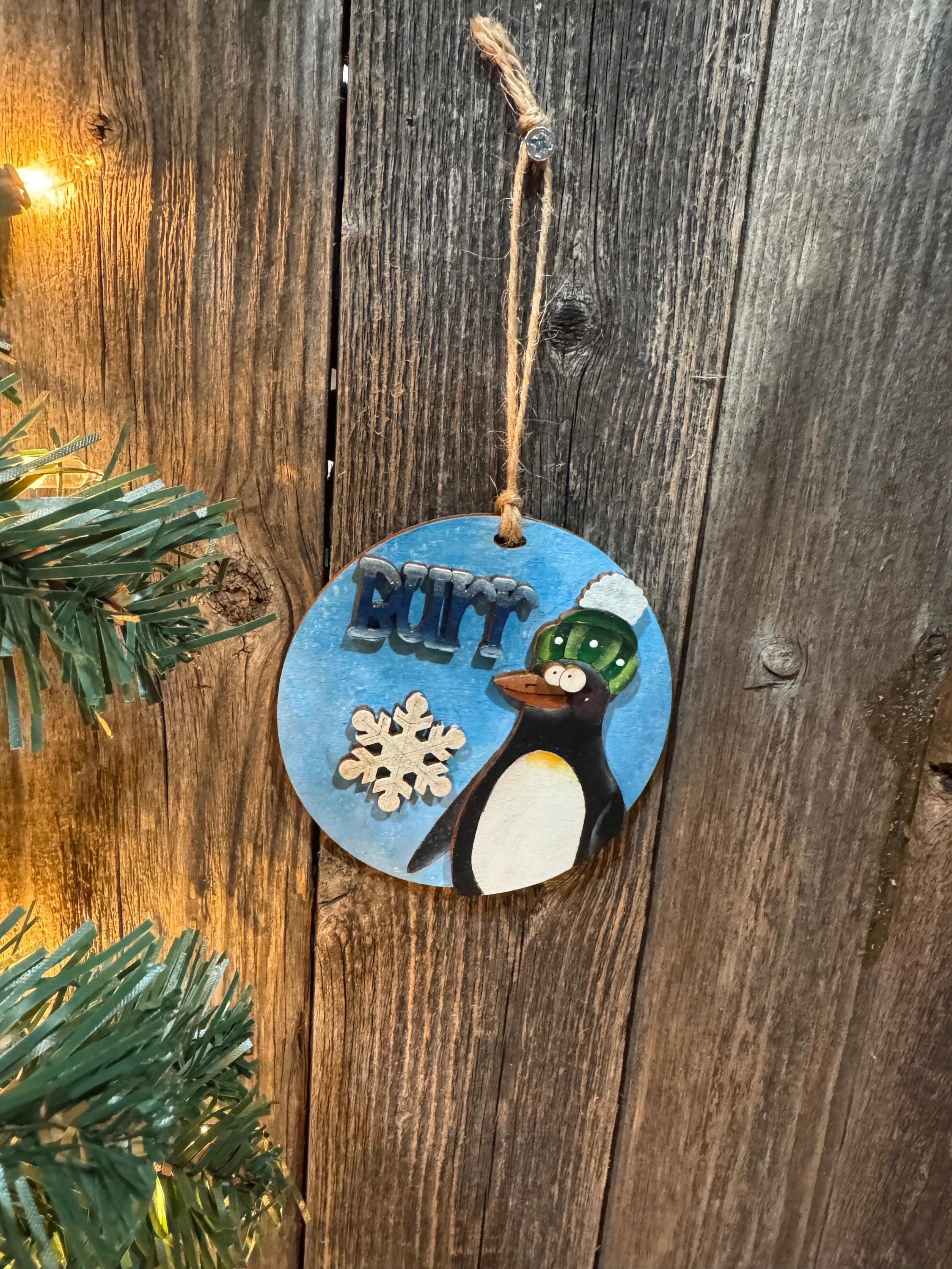 This charming penguin ornament captures the playful spirit of winter with its cozy knit hat and cheeky "Burr" message. Perfect for penguin lovers and anyone who appreciates a touch of humor on their holiday tree, this delightful decoration brings warmth and personality to your seasonal décor. Whether you choose a custom design or select from our ready-made options, this ornament makes a thoughtful gift that celebrates the fun side of chilly weather.