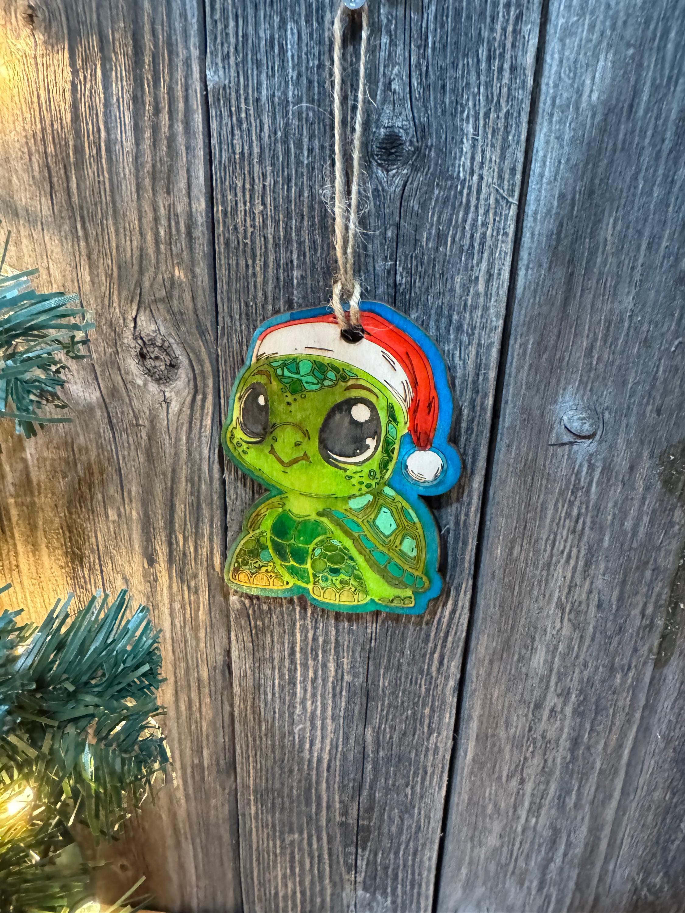 Bring ocean-inspired charm to your holiday tree with this delightful watercolor turtle ornament wearing a jolly Santa hat. Each piece features soft, flowing watercolor brushstrokes that beautifully capture the gentle nature of these beloved creatures. Ideal for ocean lovers, nature enthusiasts, and anyone seeking a distinctive holiday decoration. This thoughtful ornament adds character and warmth to your seasonal display while celebrating the wonder of marine life.