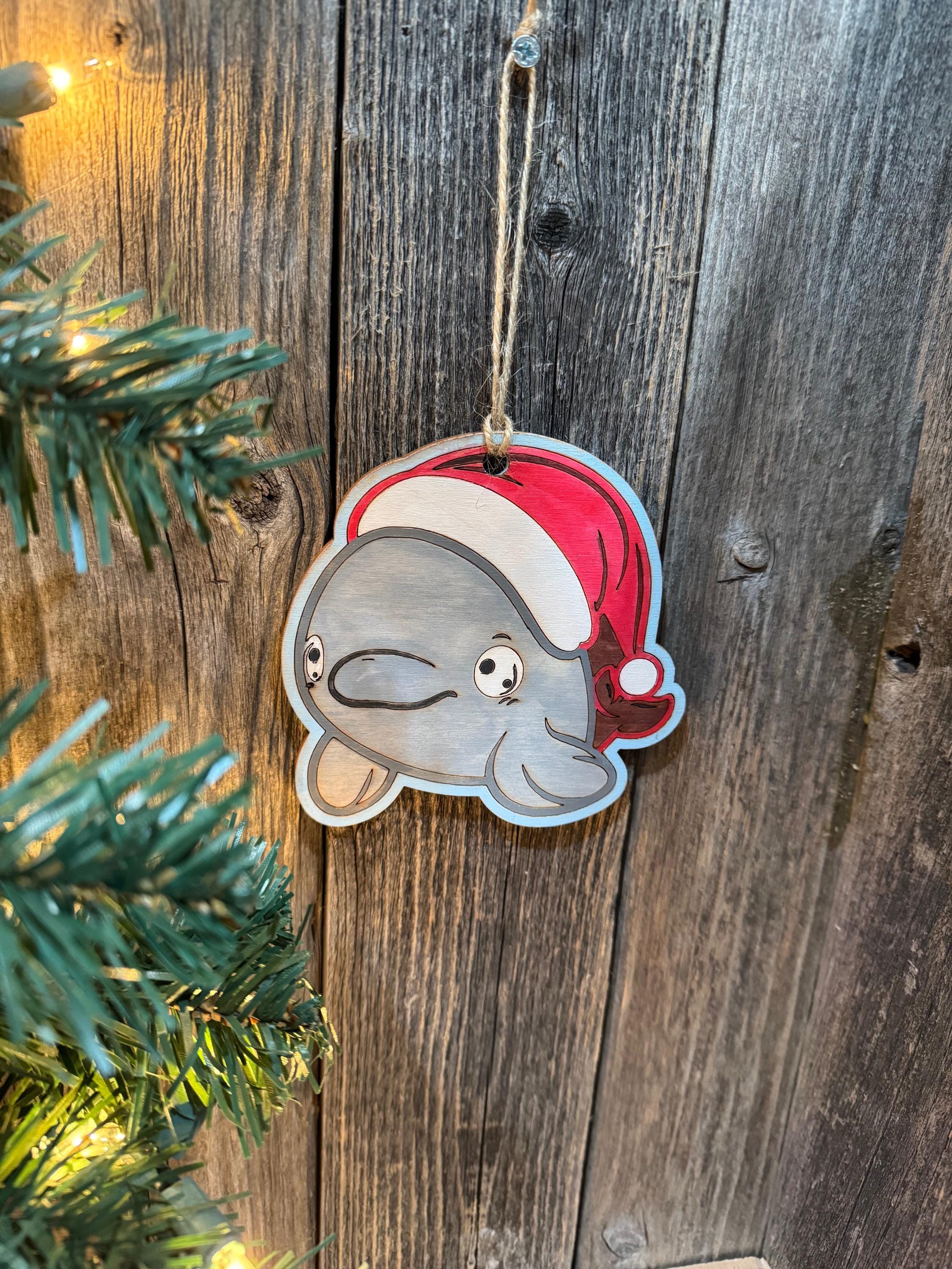 Bring festive cheer to your tree with this delightful watercolor dolphin ornament. Featuring a cheerful dolphin sporting a jolly Santa hat, rendered in soft yellow and white tones, this piece captures the playful spirit of the season. Perfect for ocean lovers and holiday enthusiasts alike, it adds a unique, whimsical touch to your Christmas décor. A wonderful way to celebrate both your love of marine life and the magic of the holidays.
