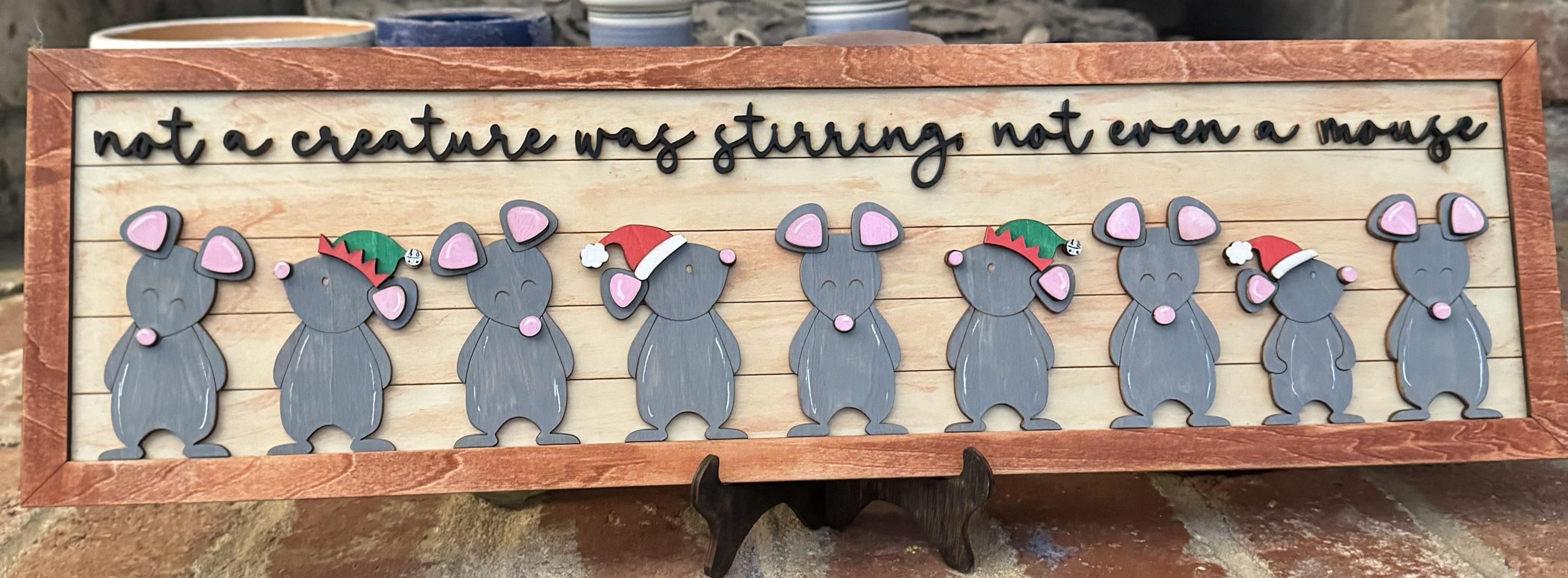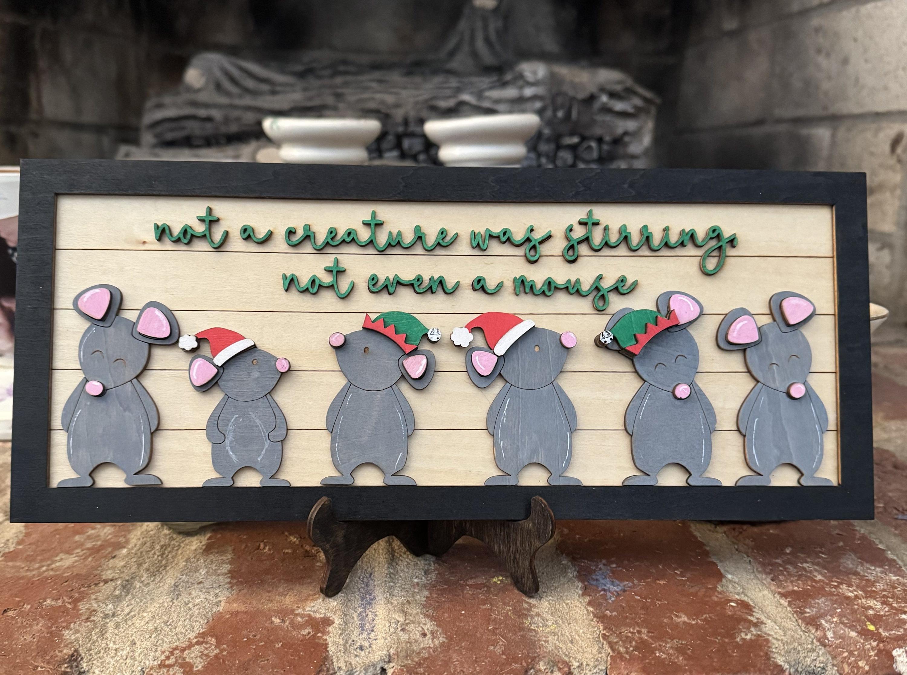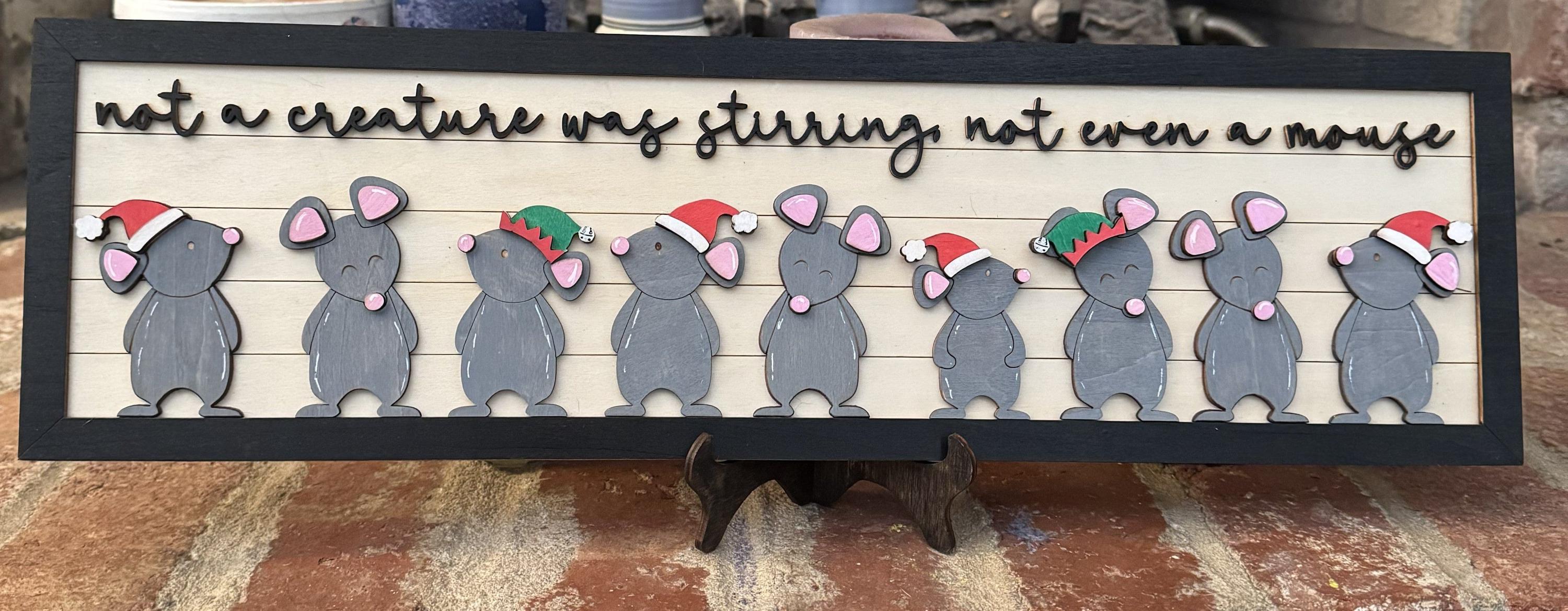 Bring festive charm to your home with this delightful Christmas wall hanging inspired by the classic holiday poem. Perfect for walls, shelves, or mantels, this customizable piece lets you personalize it with up to 9 adorable mouse characters. Each mouse adds warmth and whimsy to your seasonal décor, making it a conversation starter that captures the magic of Christmas morning. Whether you're decorating a cozy corner or creating a focal point in your holiday display, this charming hanging celebrates the wonder of the season while adding a playful touch to your festive arrangements.