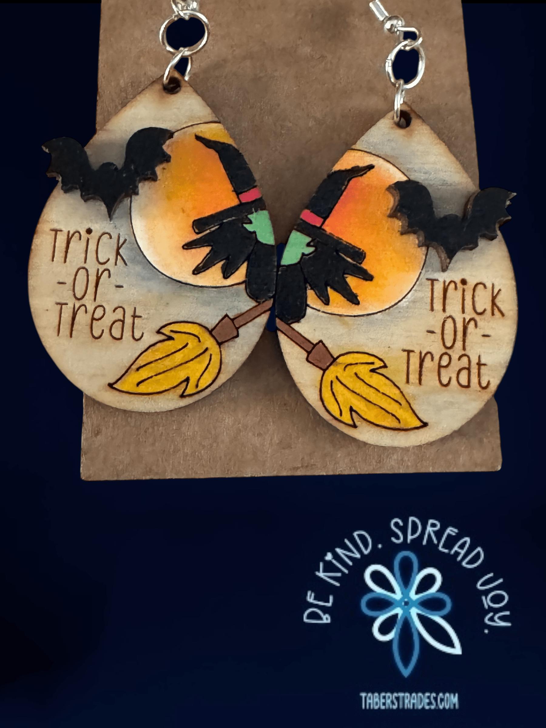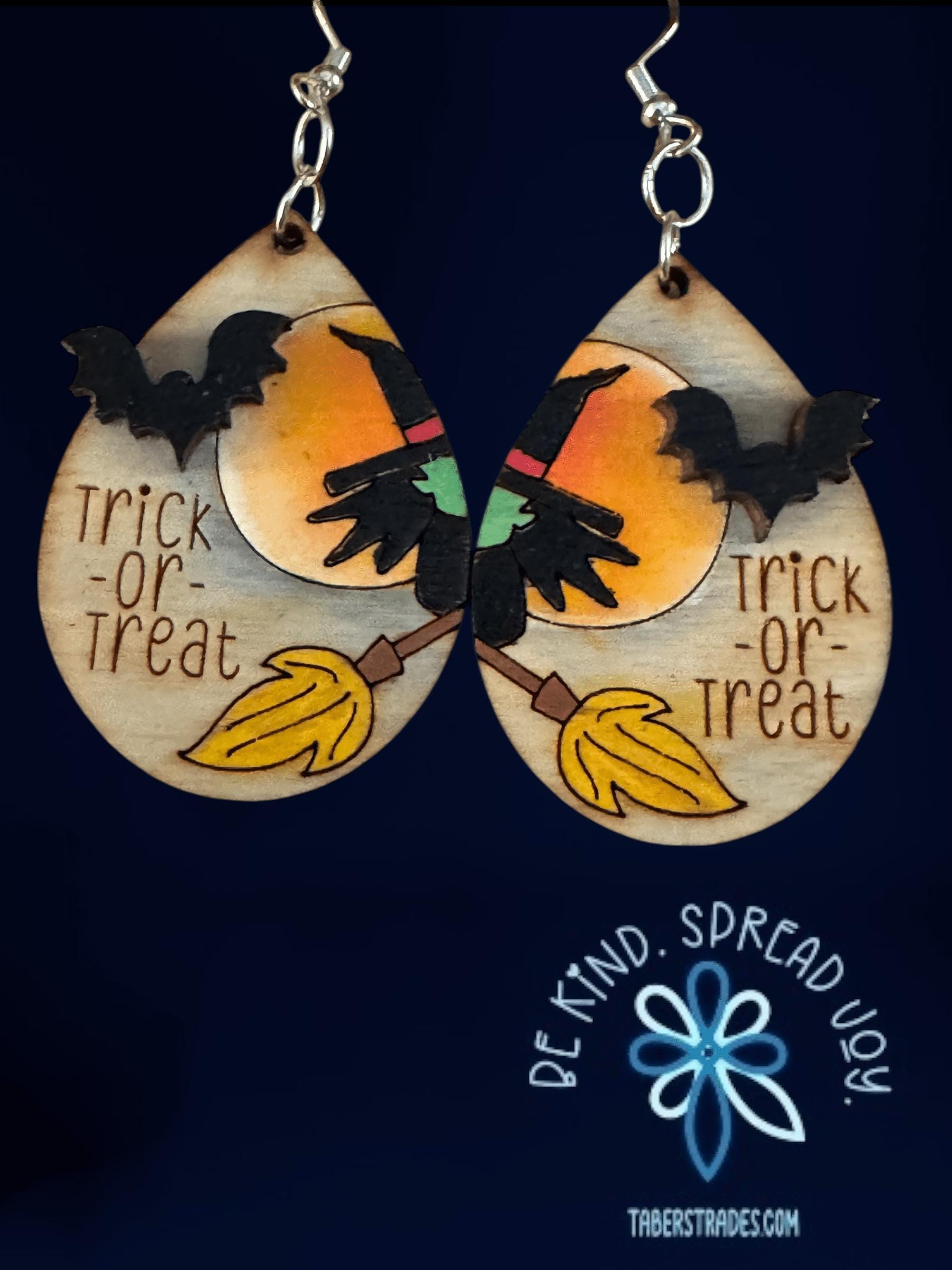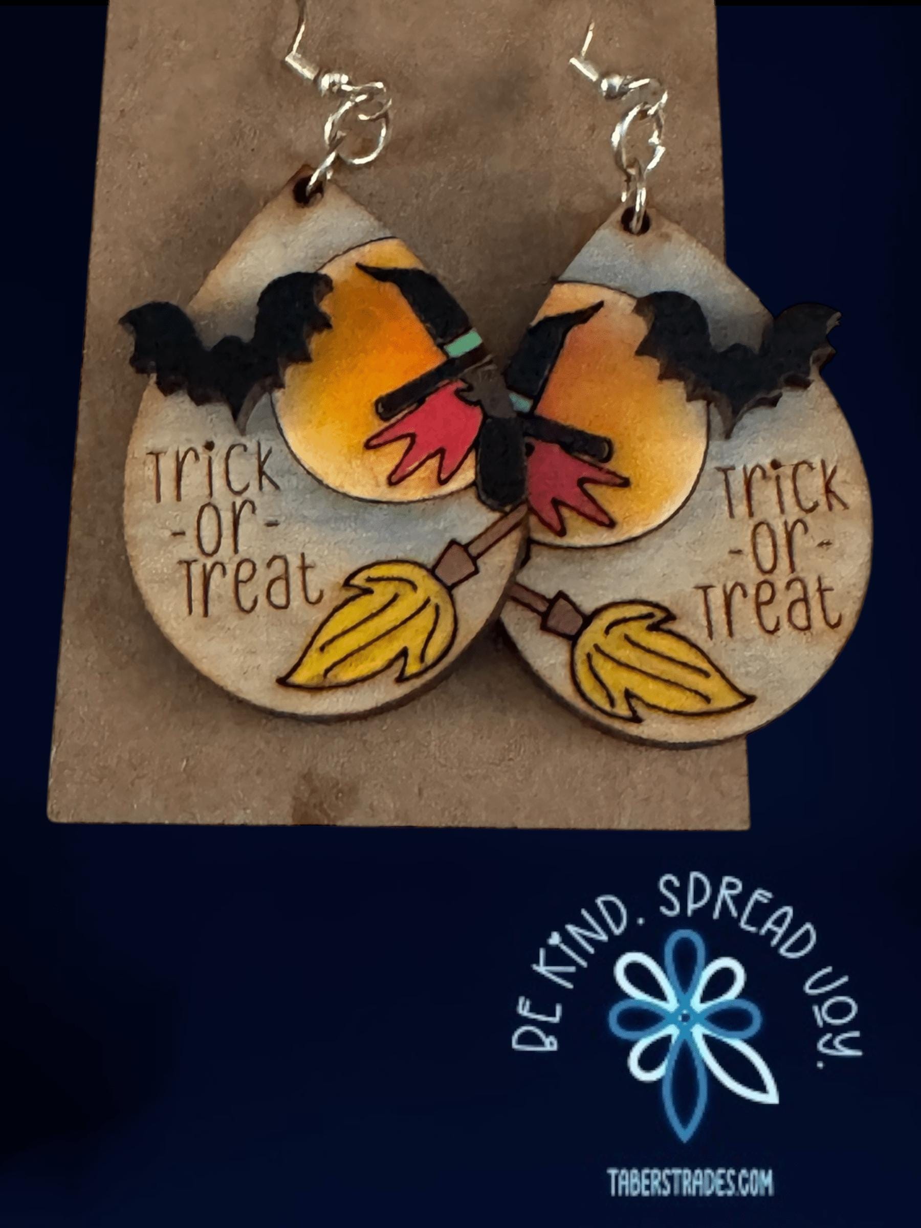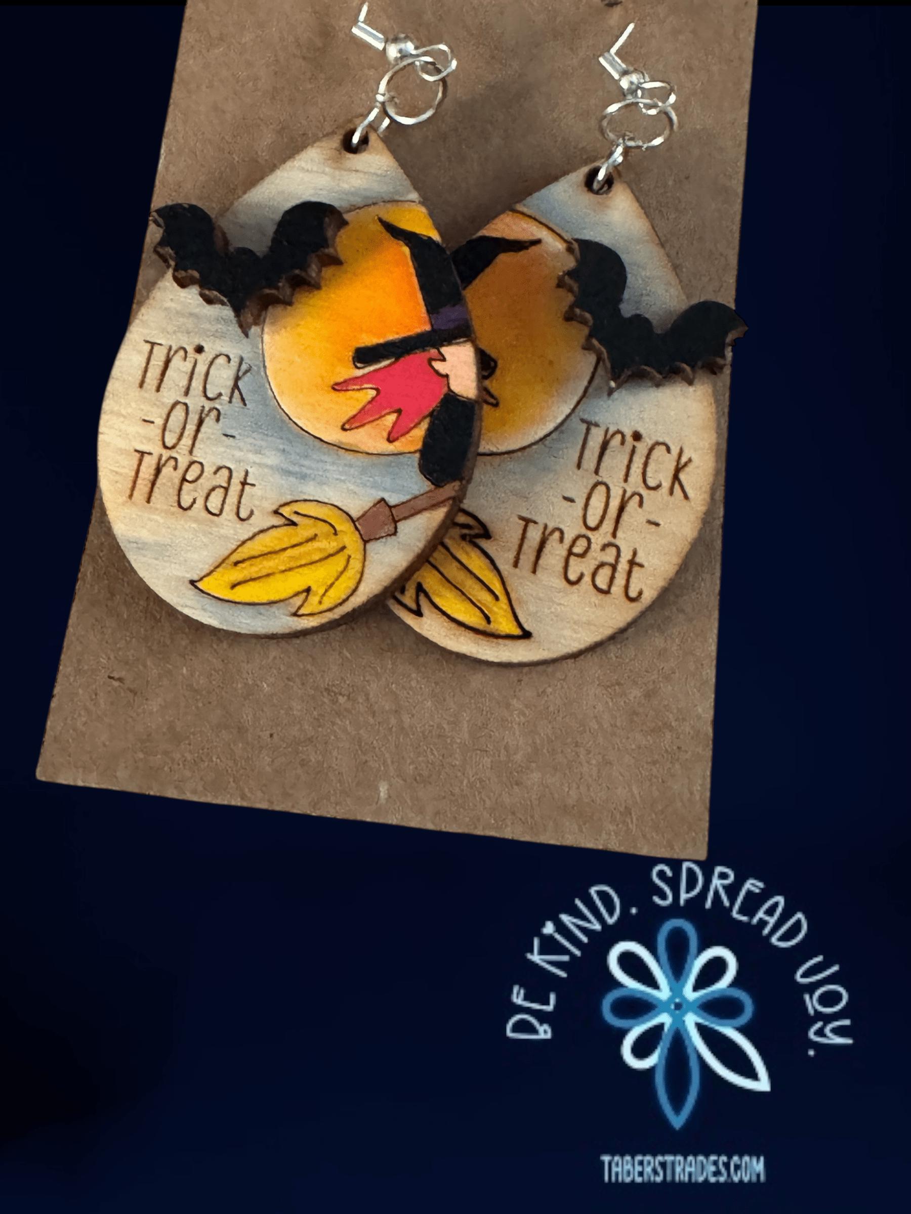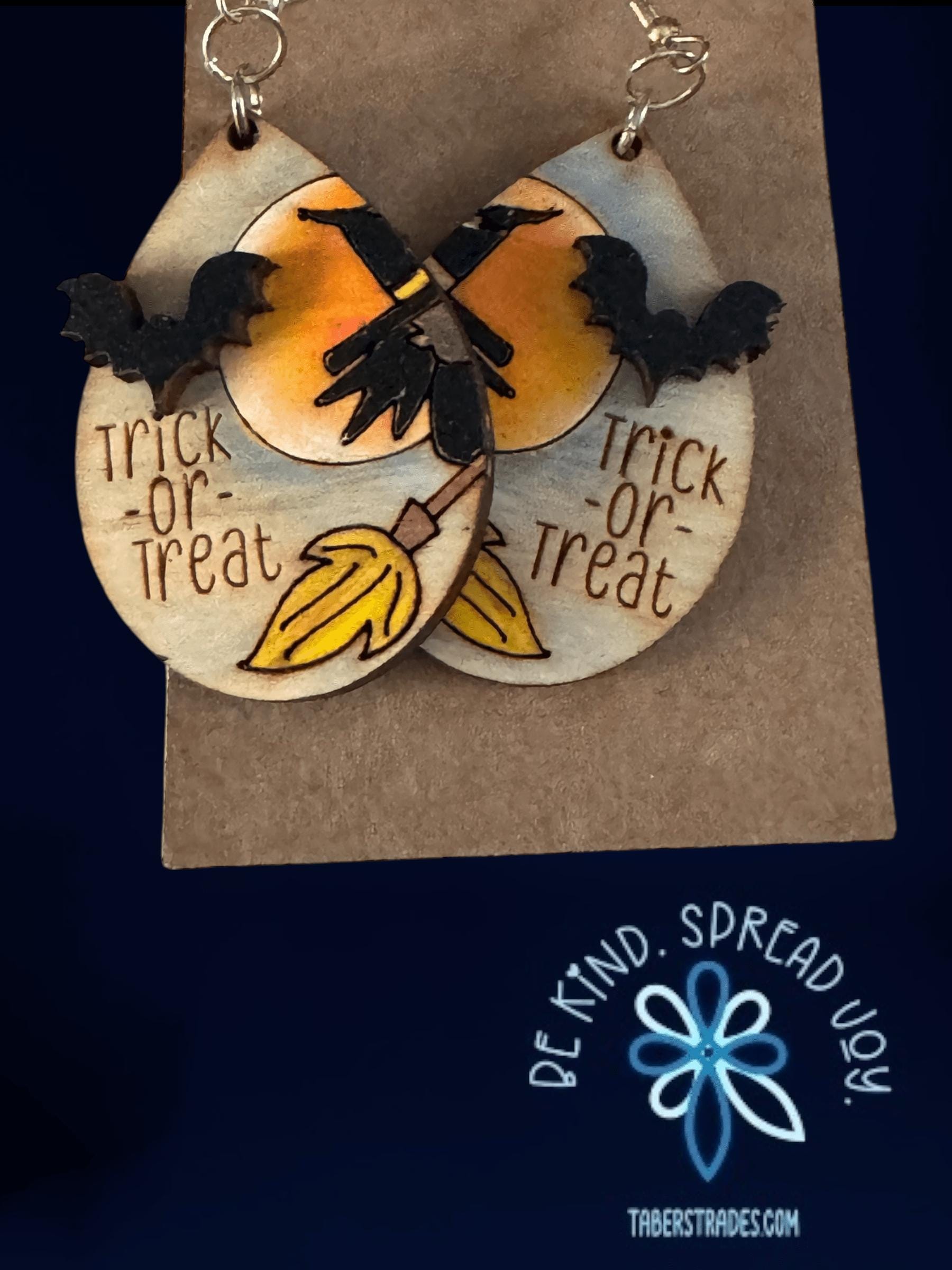 Celebrate Halloween with these charming Witch on a Broom Earrings, engraved with the festive phrase "Trick or Treat." Lightweight and eye-catching, they add a playful touch to your seasonal look while showing off your holiday spirit. Perfect for parties or everyday wear during the spooky season, these earrings make a fun accessory that supports your festive style with a