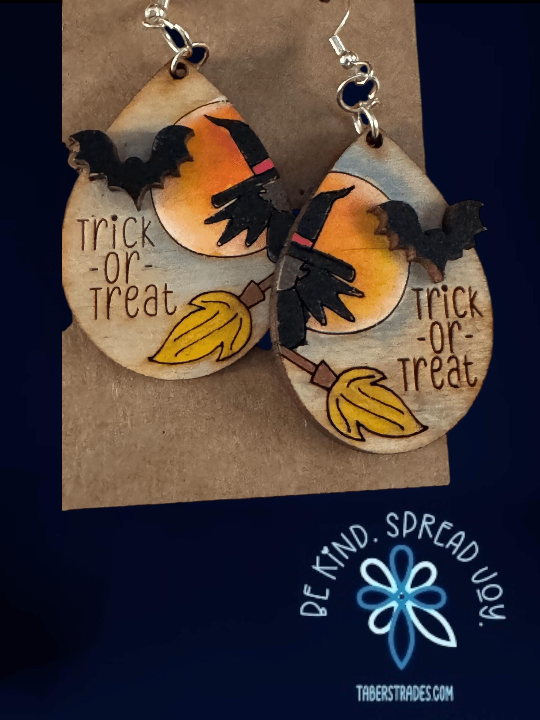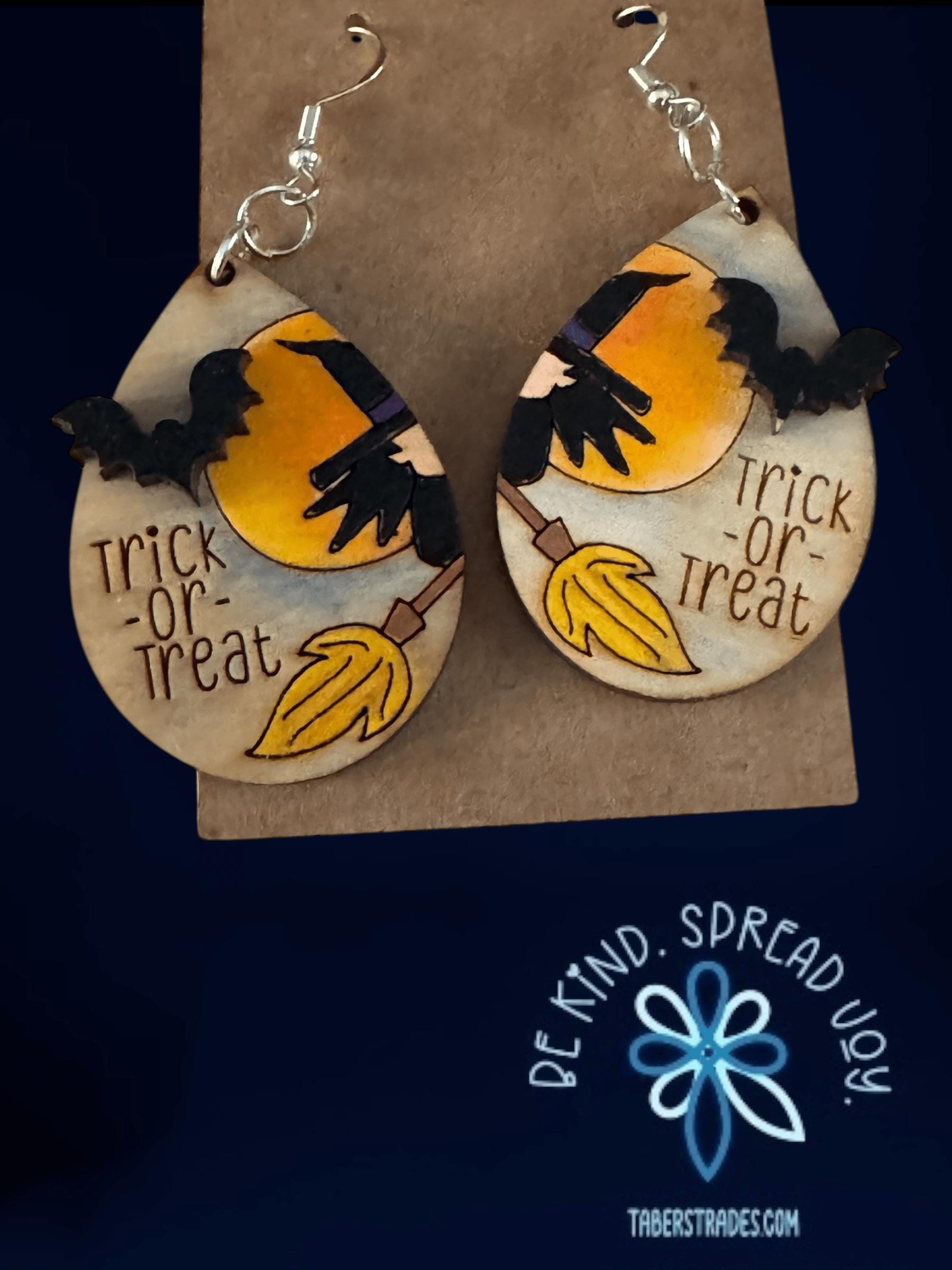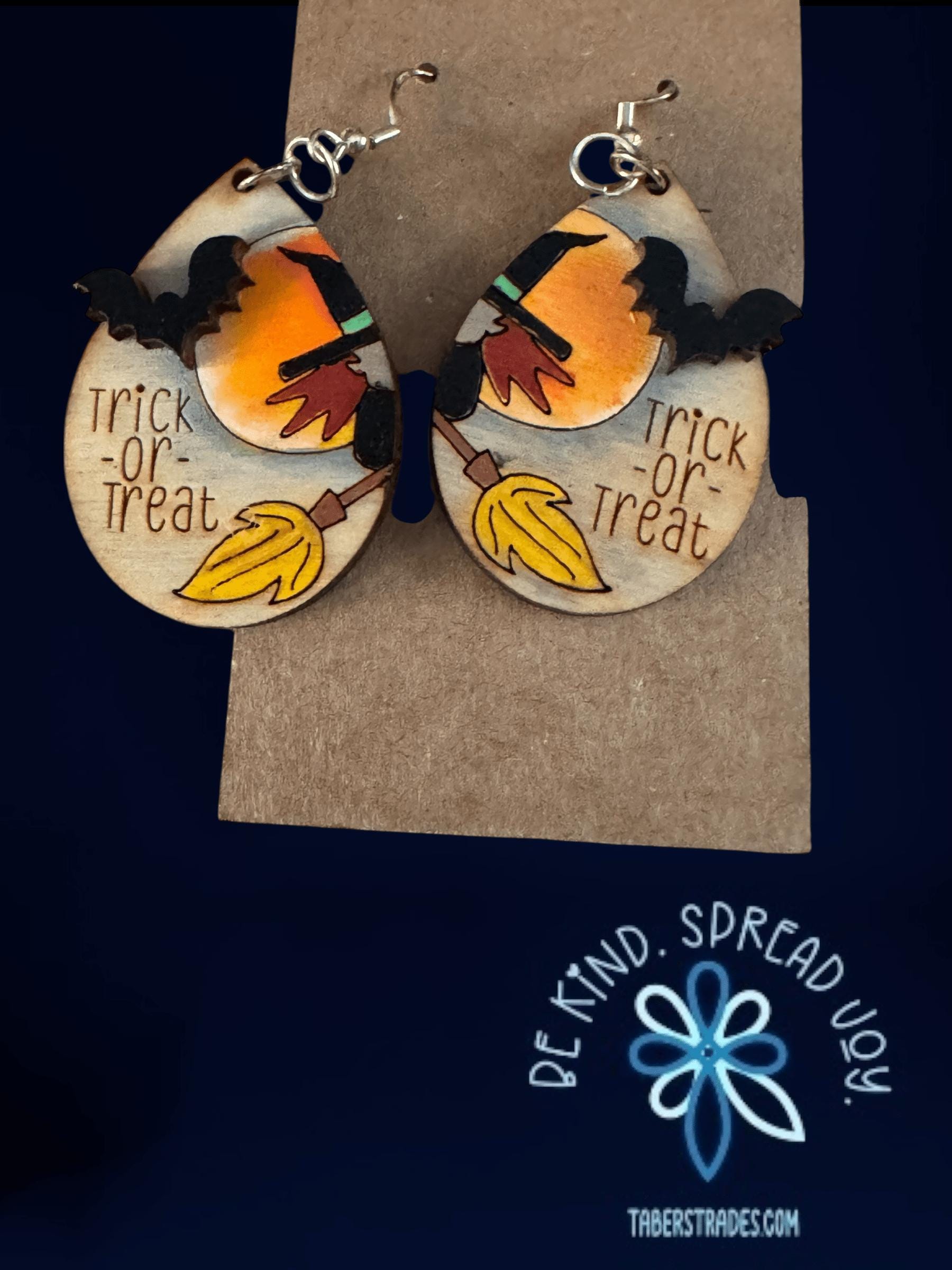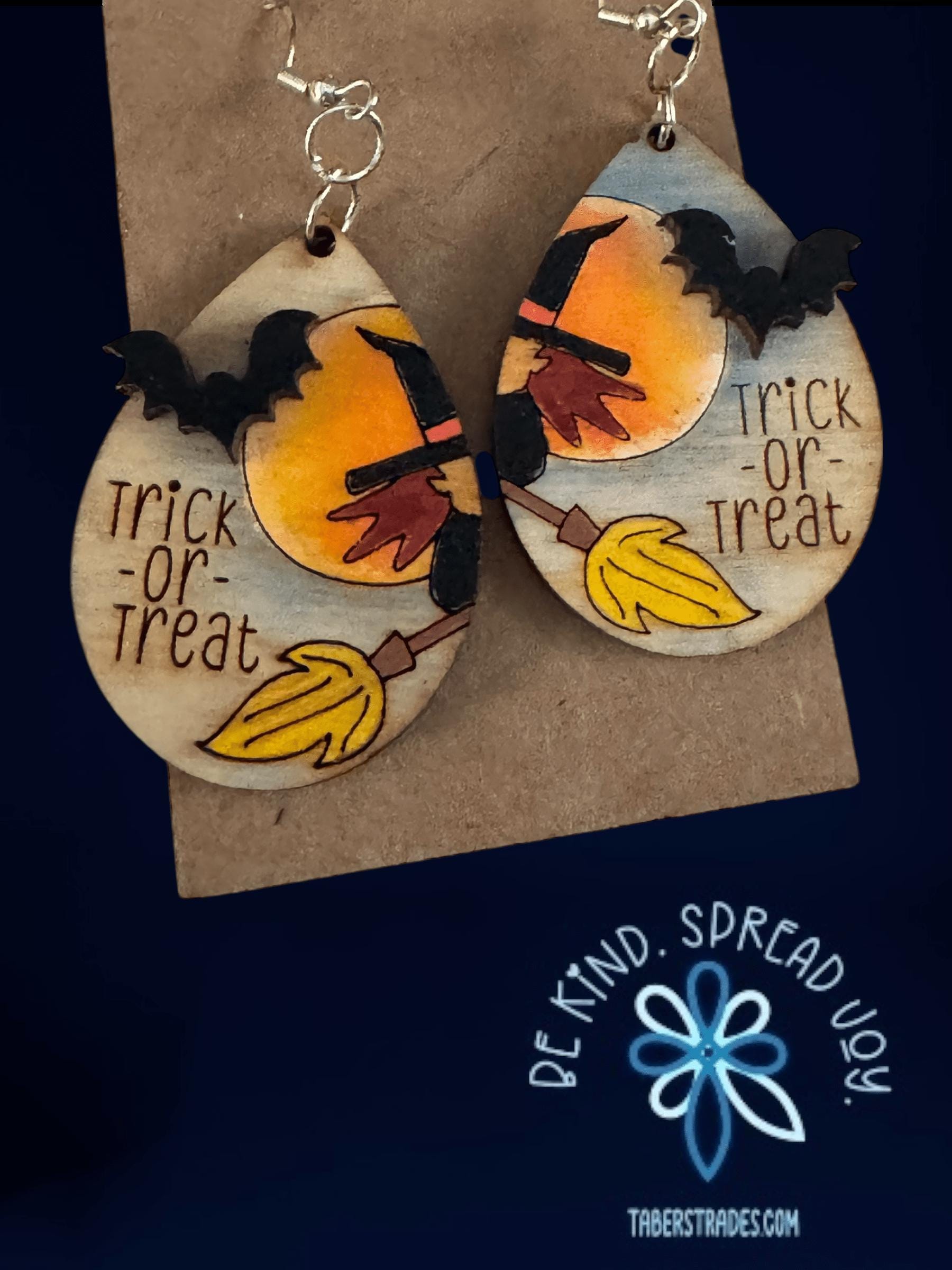 Celebrate Halloween with these charming Witch on a Broom Earrings, engraved with the festive phrase "Trick or Treat." Lightweight and eye-catching, they add a playful touch to your seasonal look while showing off your holiday spirit. Perfect for parties or everyday wear during the spooky season, these earrings make a fun accessory that supports your festive style with a