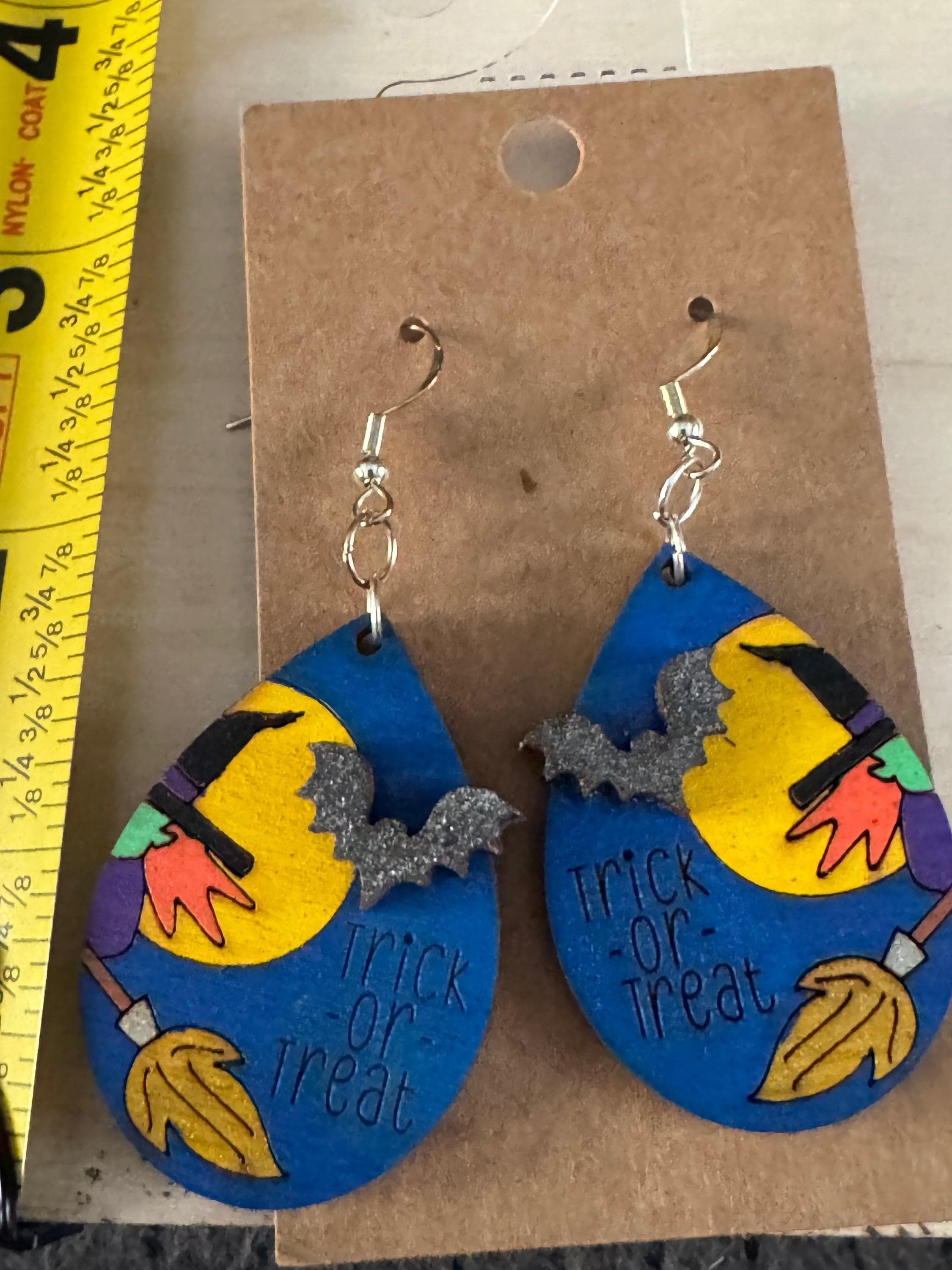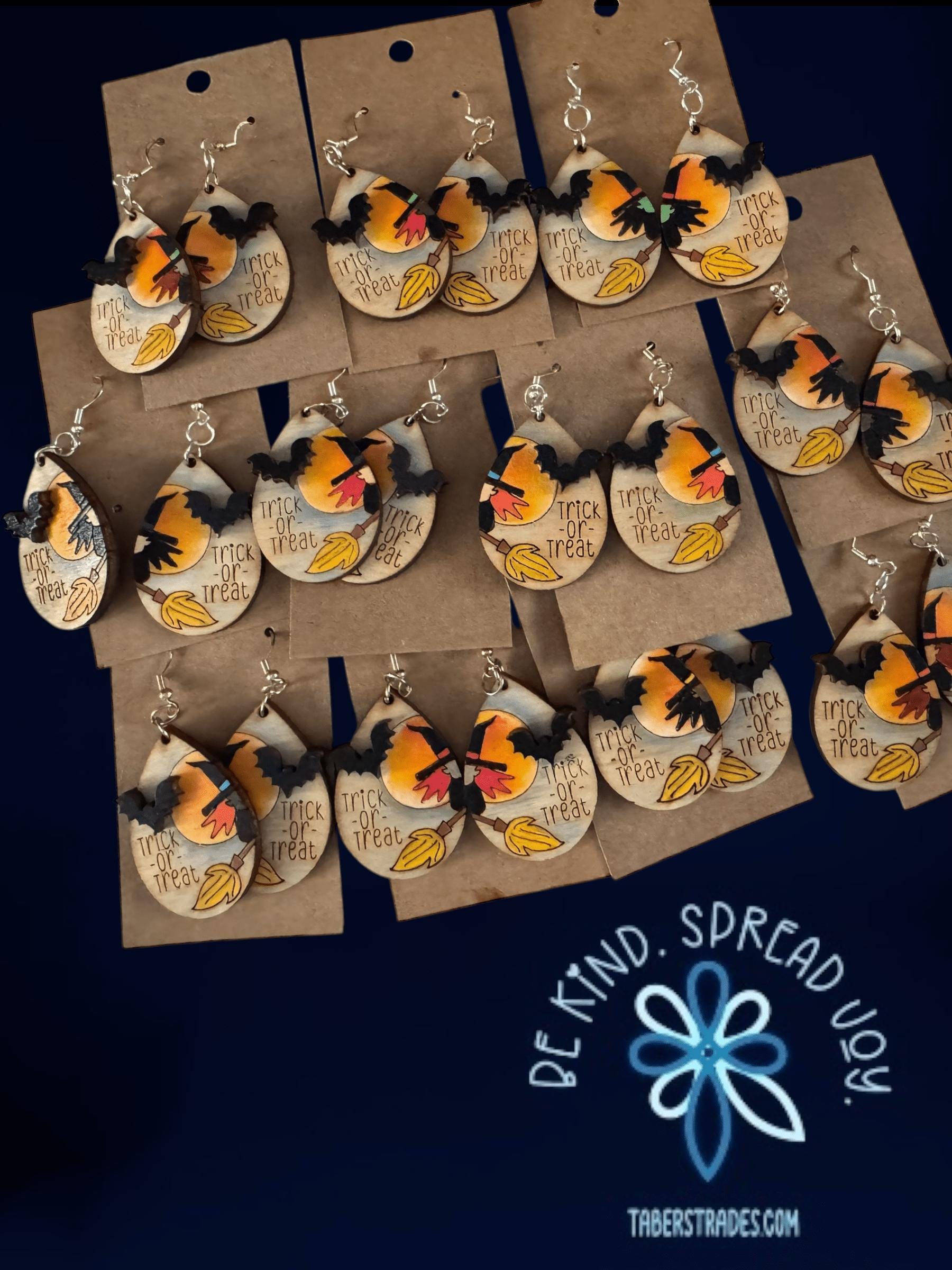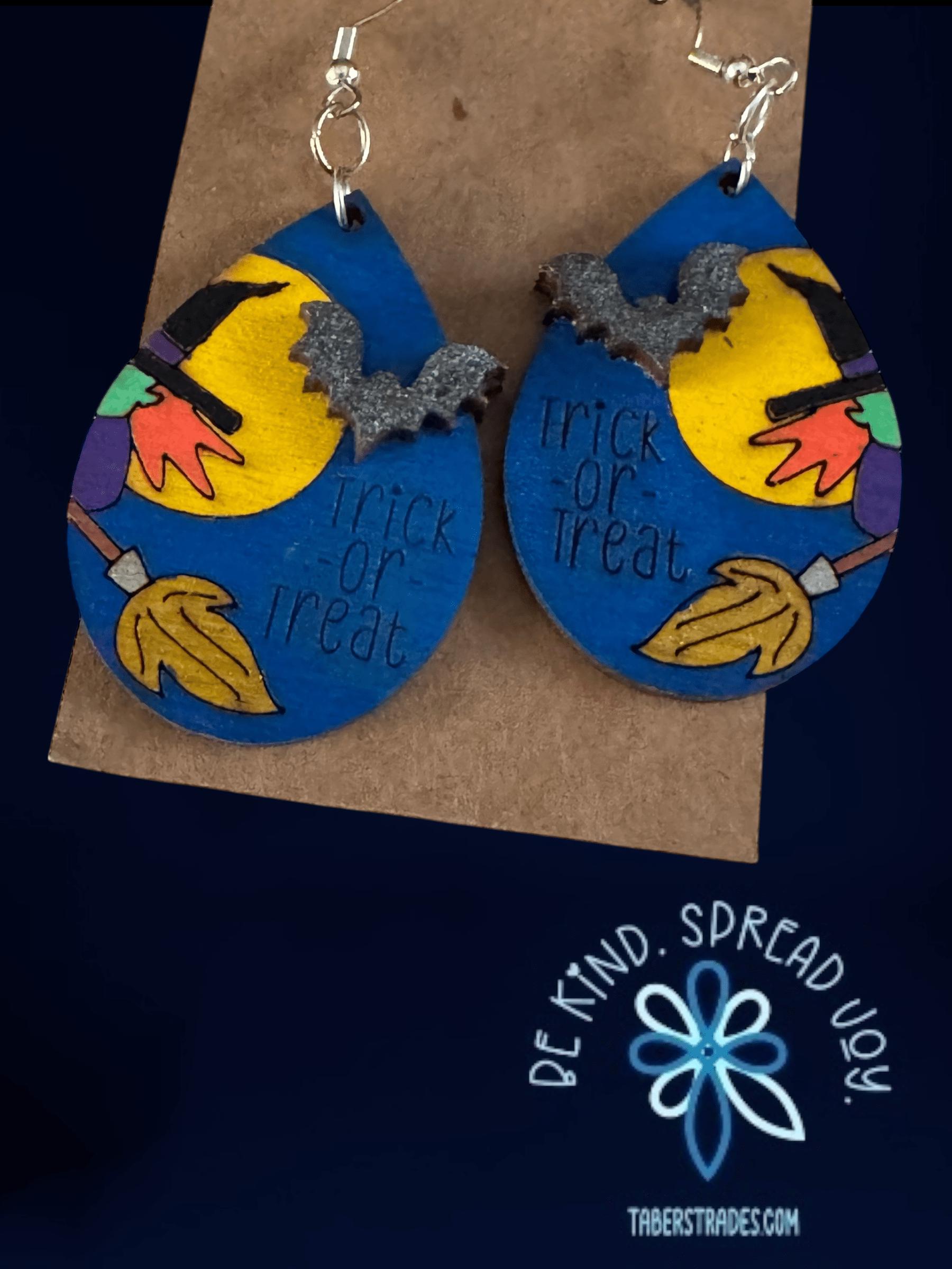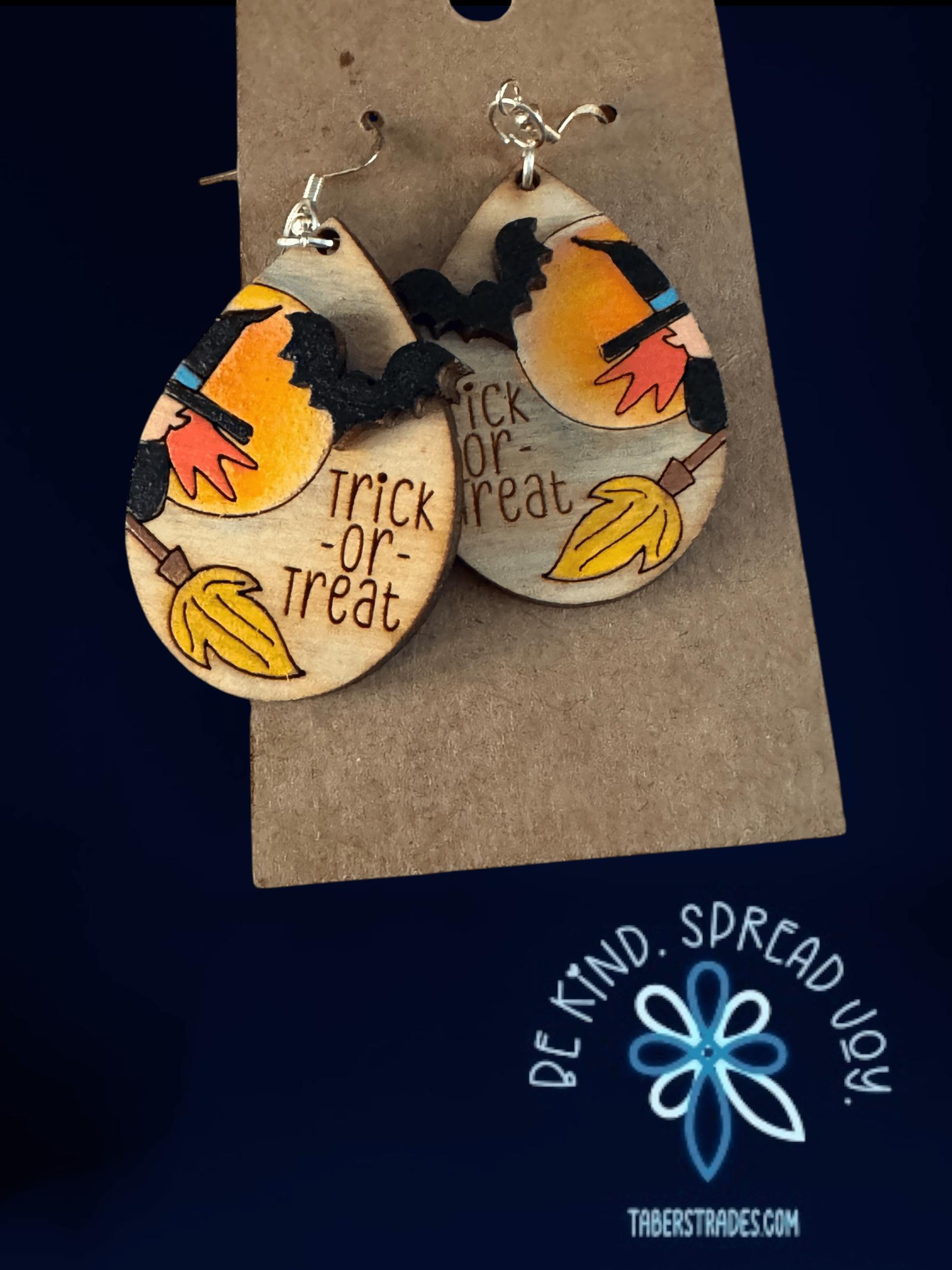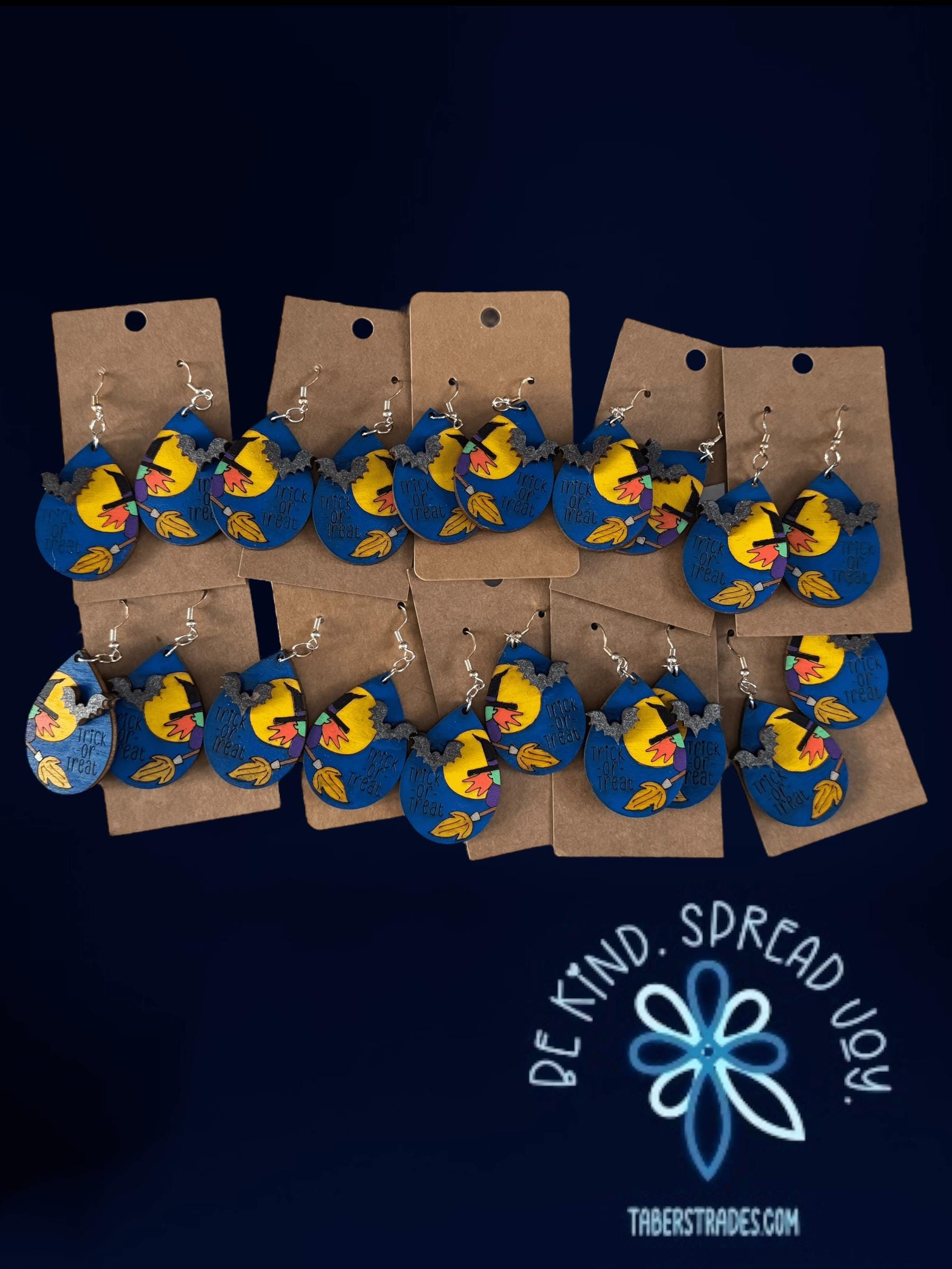 Celebrate Halloween with these charming Witch on a Broom Earrings, engraved with the festive phrase "Trick or Treat." Lightweight and eye-catching, they add a playful touch to your seasonal look while showing off your holiday spirit. Perfect for parties or everyday wear during the spooky season, these earrings make a fun accessory that supports your festive style with a