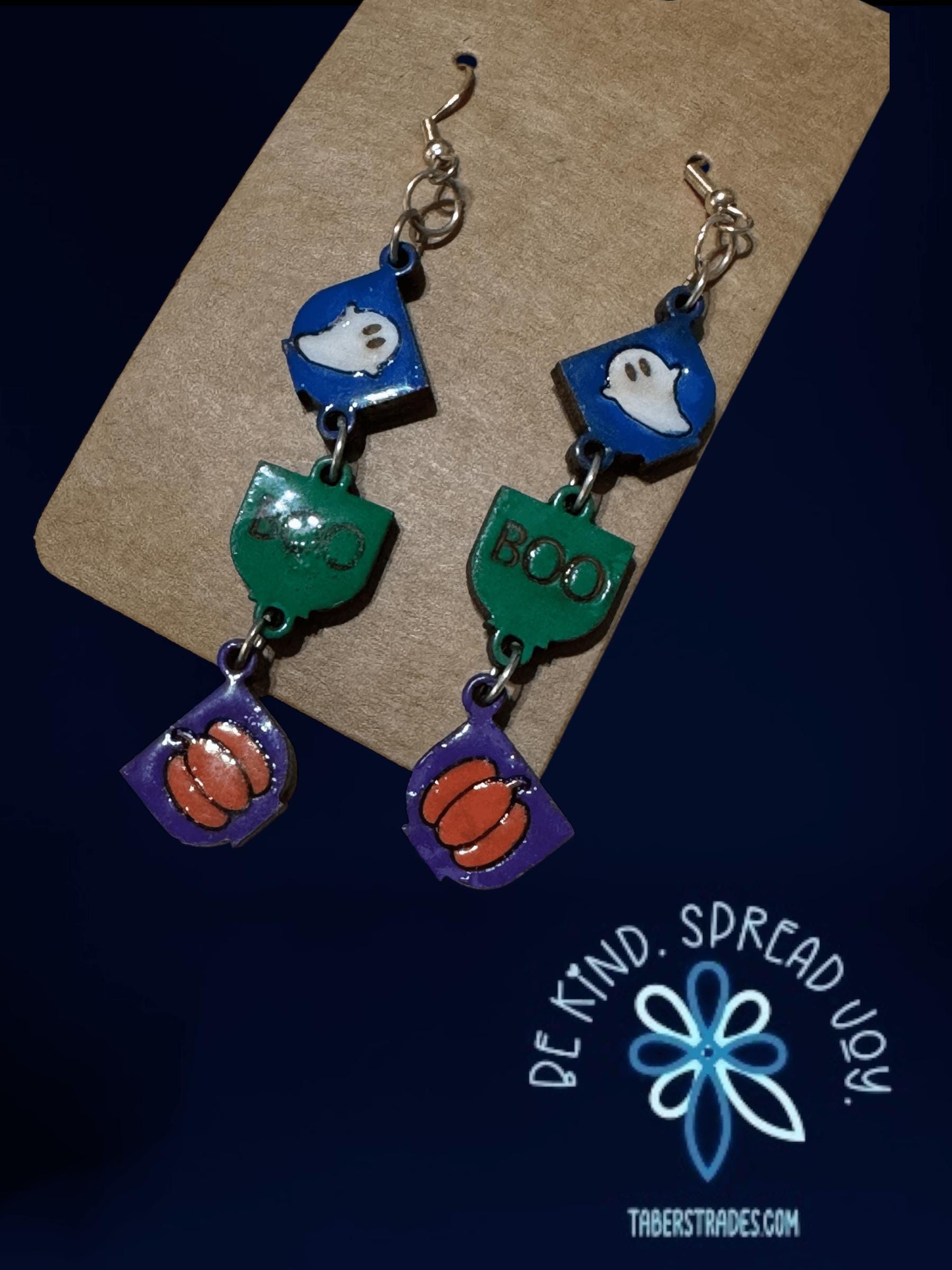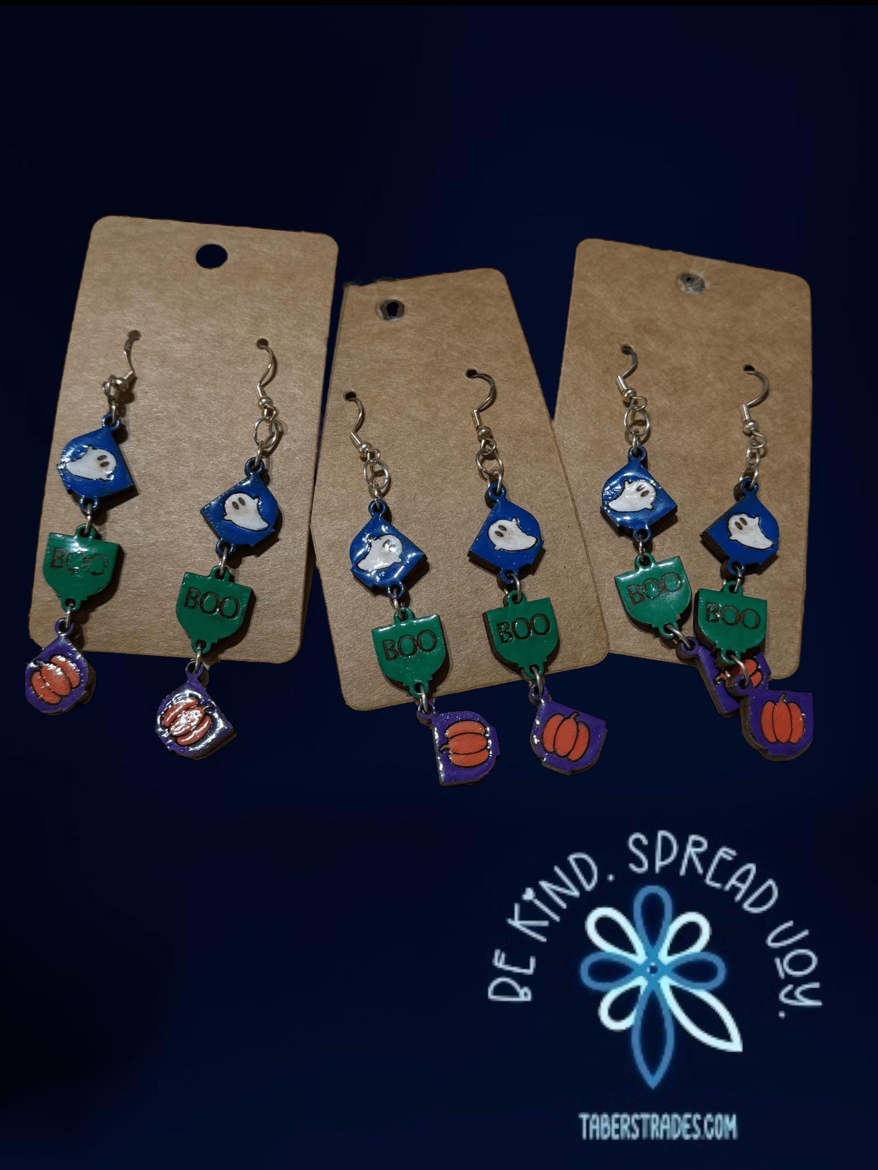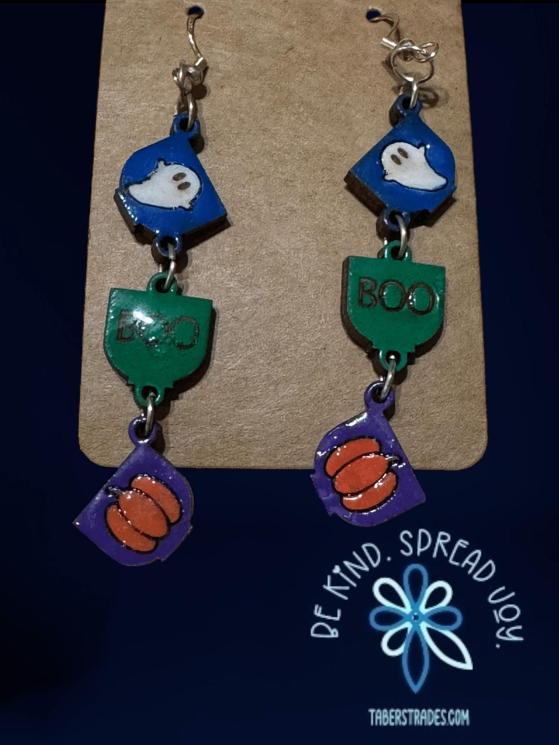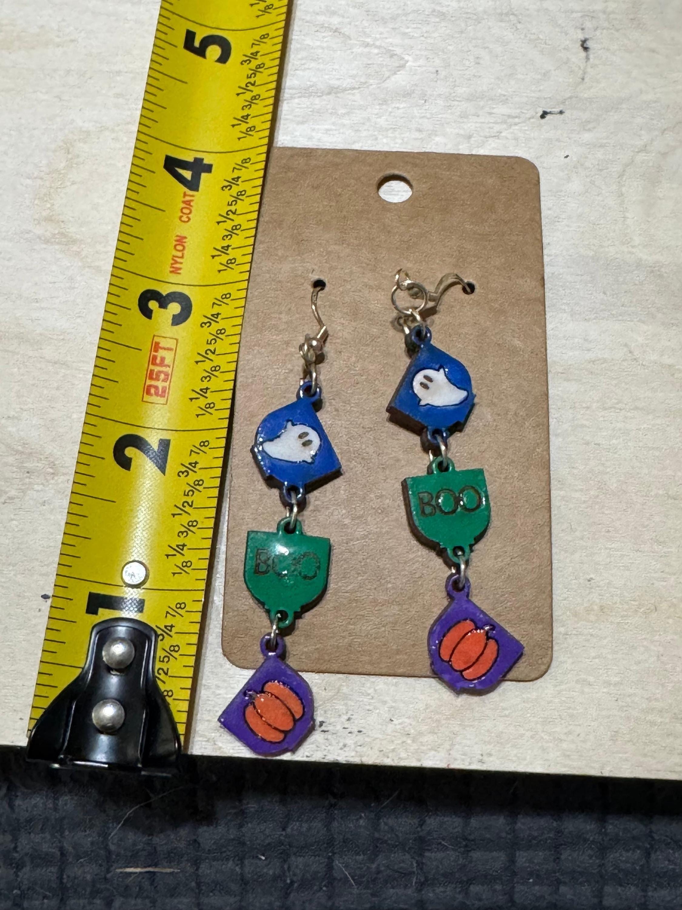 Celebrate the spooky season with these Halloween Long Dangle Earrings featuring a charming ghost, a playful "Boo," and a classic pumpkin design. Lightweight and eye-catching, they add festive flair to any outfit while being comfortable for all-day wear. Perfect for Halloween parties, trick-or-treating, or simply showing your seasonal spirit with style.