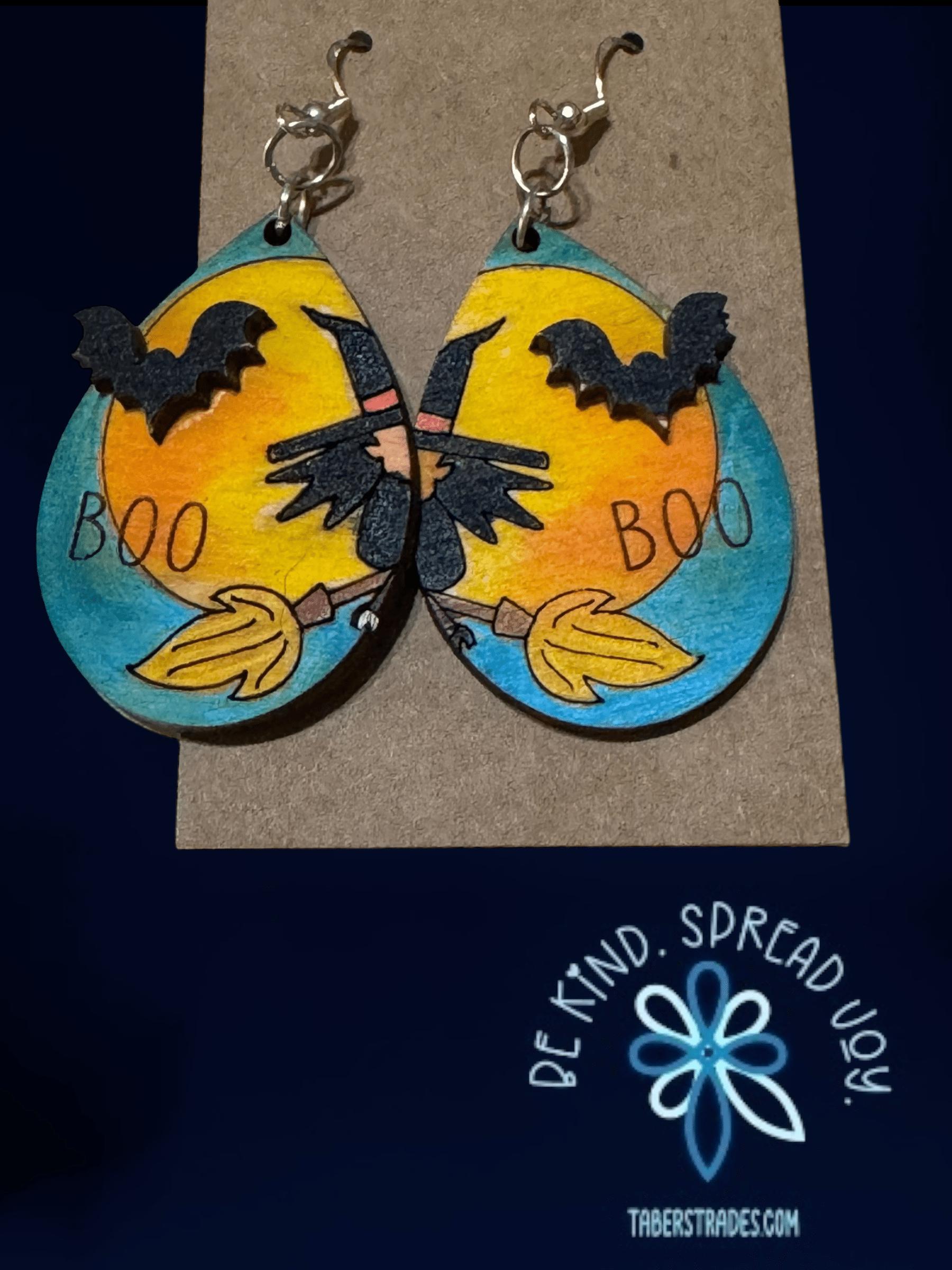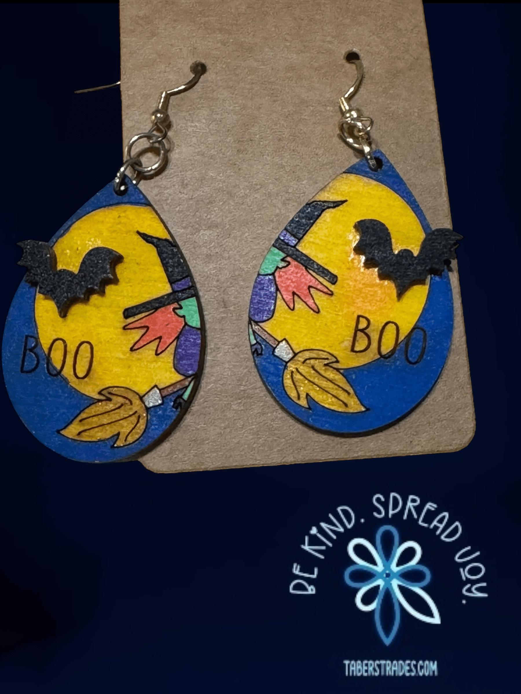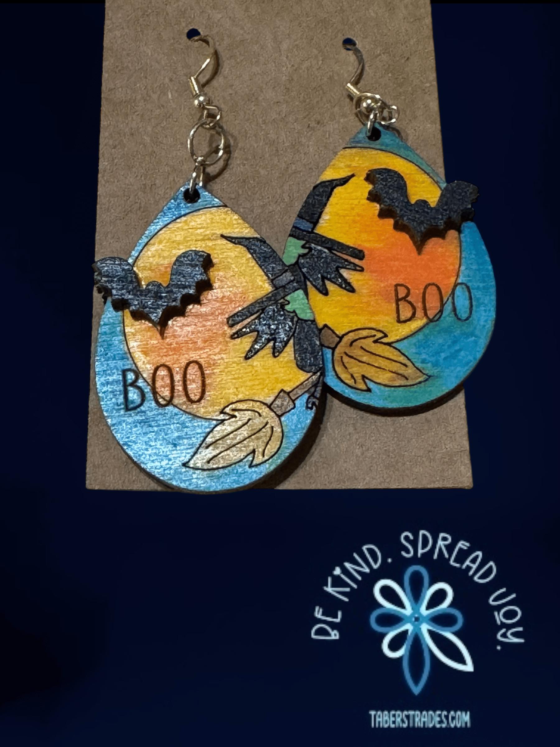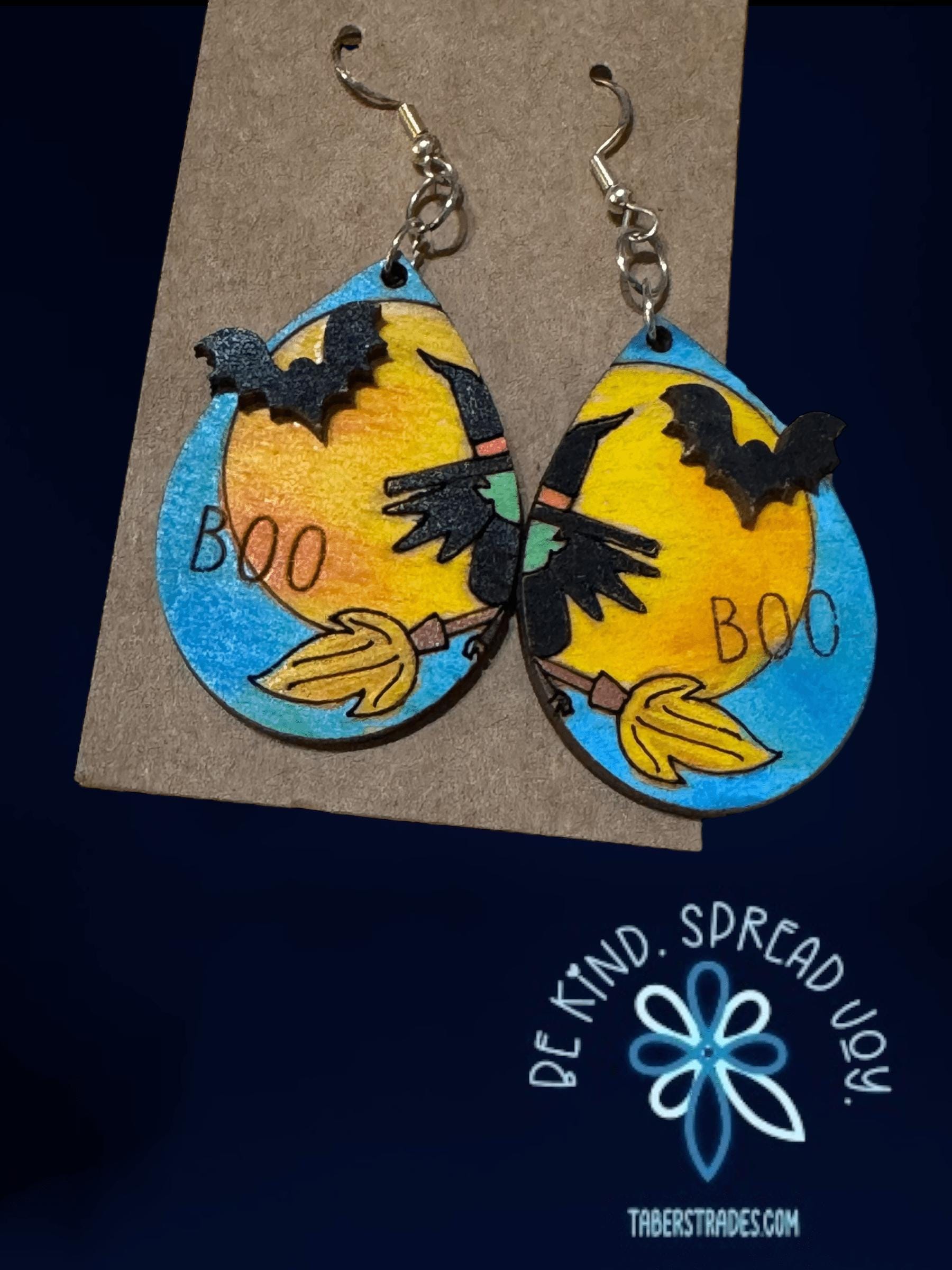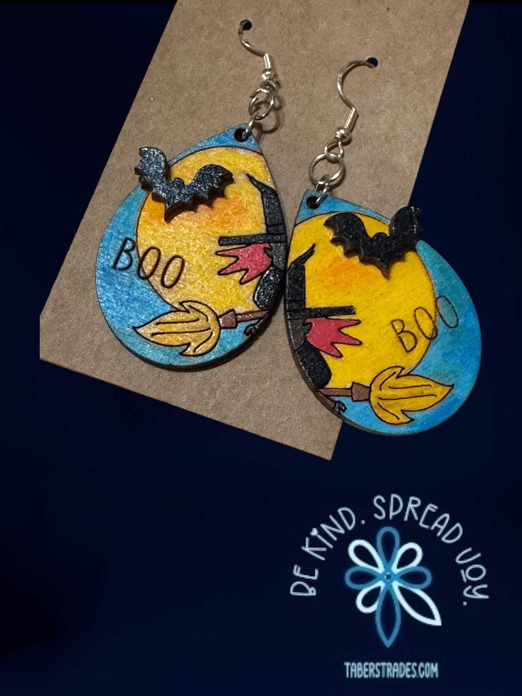 Add a spooky yet playful touch to your Halloween style with these Witch on a Broom Earrings, featuring the word "Boo" engraved for extra charm. Lightweight and comfortable, they are perfect for celebrating the season or adding a festive accent to any outfit. Embrace the Halloween spirit with these fun earrings that support your love for all things magical and spooky.