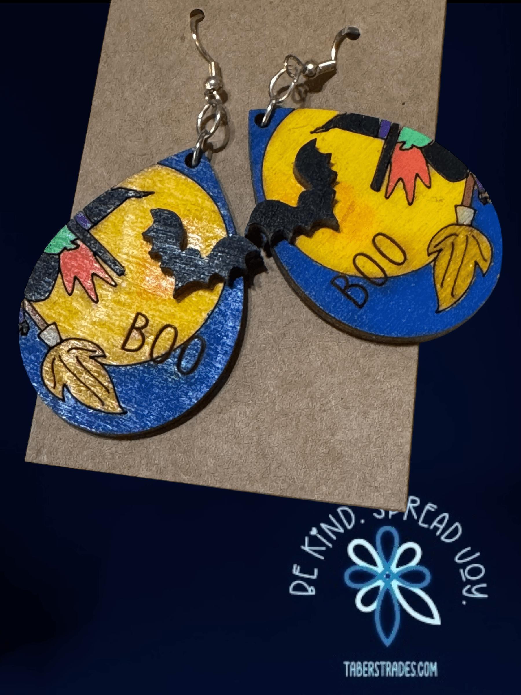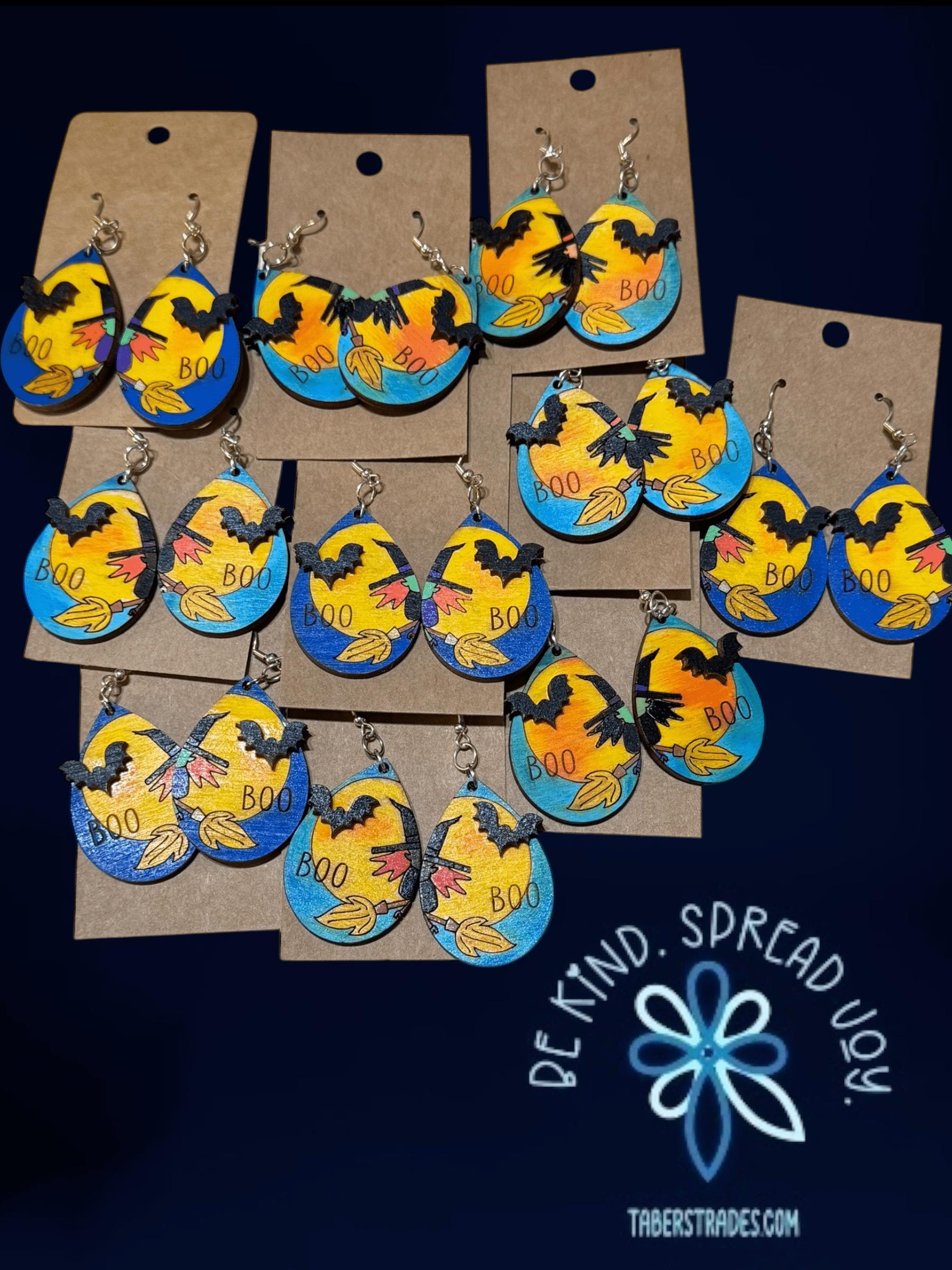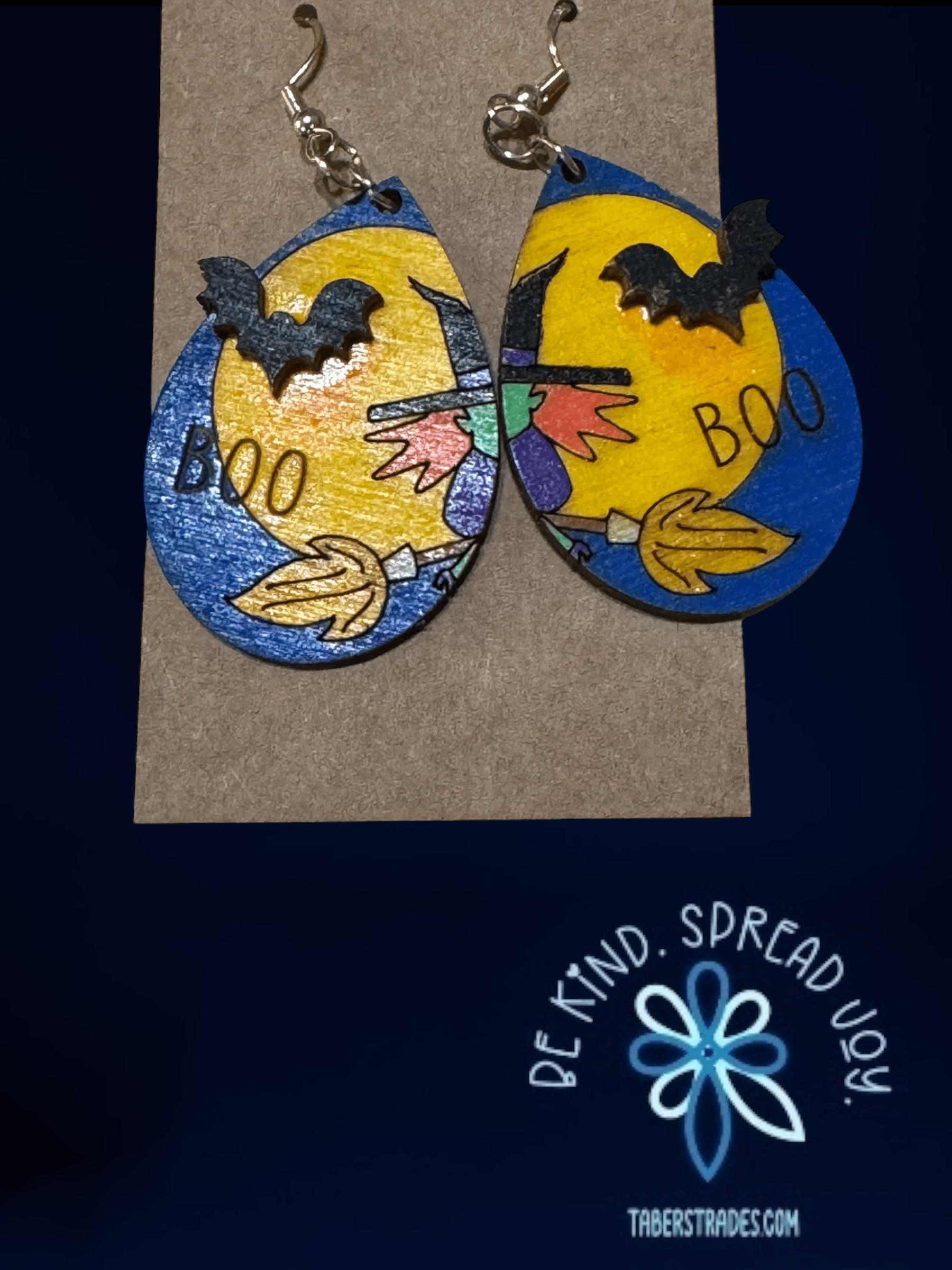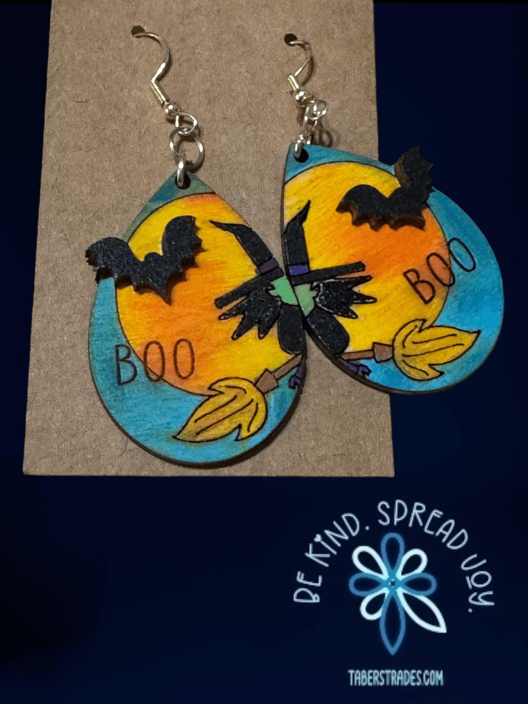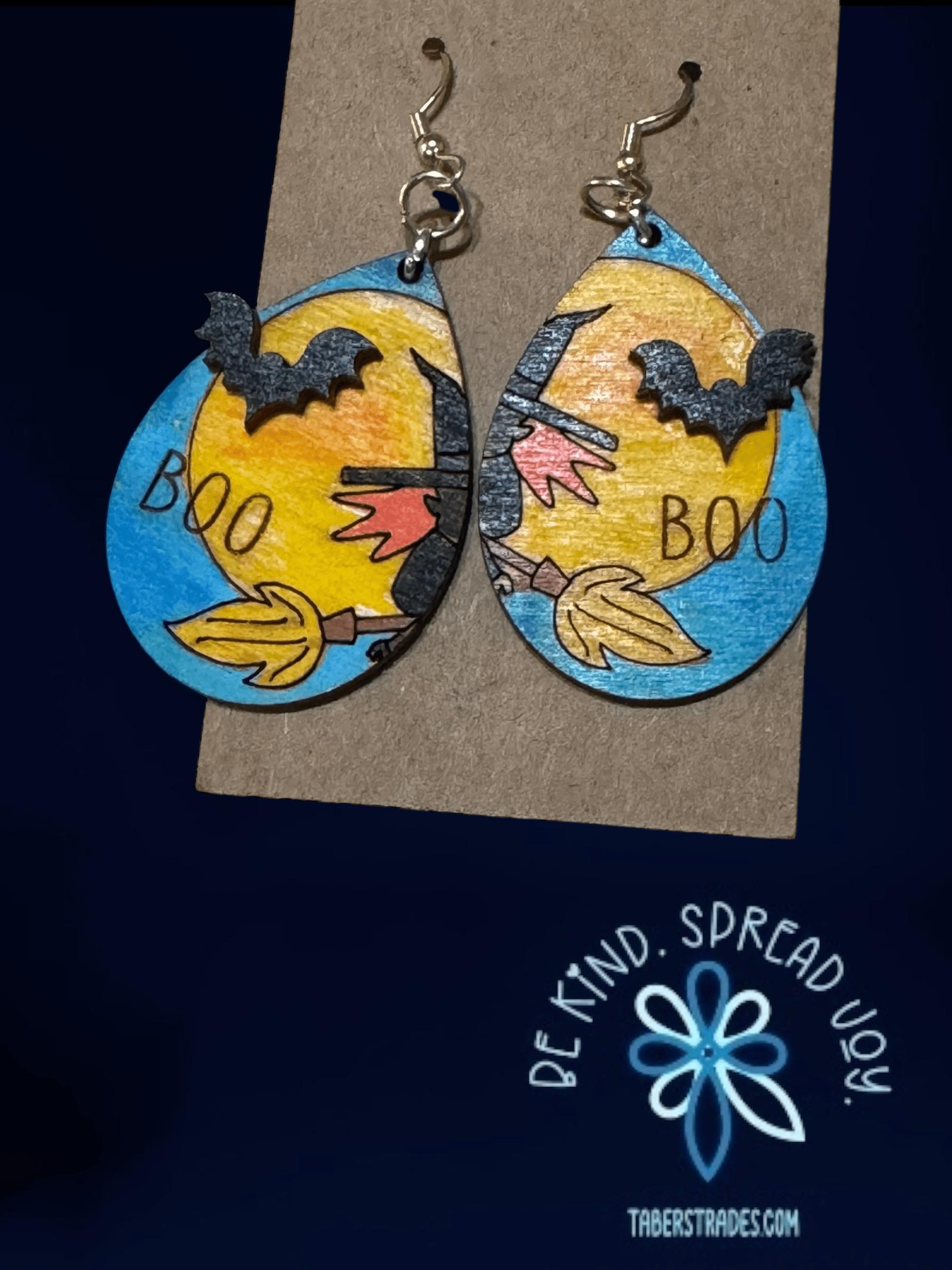 Add a spooky yet playful touch to your Halloween style with these Witch on a Broom Earrings, featuring the word "Boo" engraved for extra charm. Lightweight and comfortable, they are perfect for celebrating the season or adding a festive accent to any outfit. Embrace the Halloween spirit with these fun earrings that support your love for all things magical and spooky.