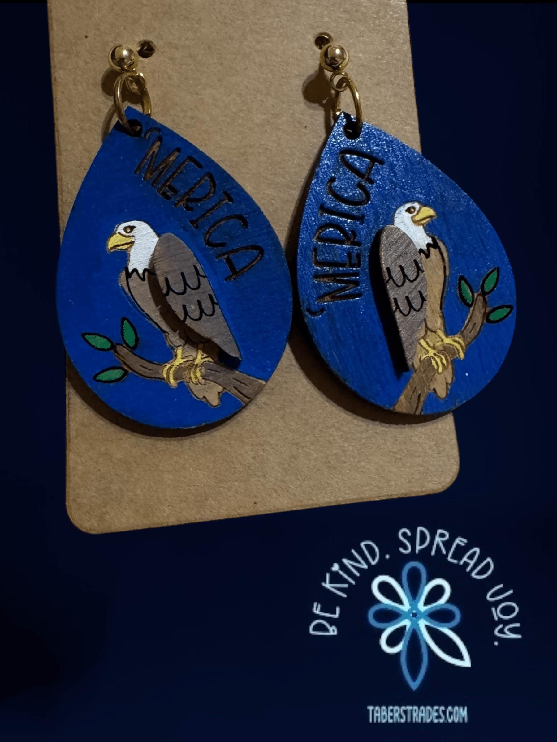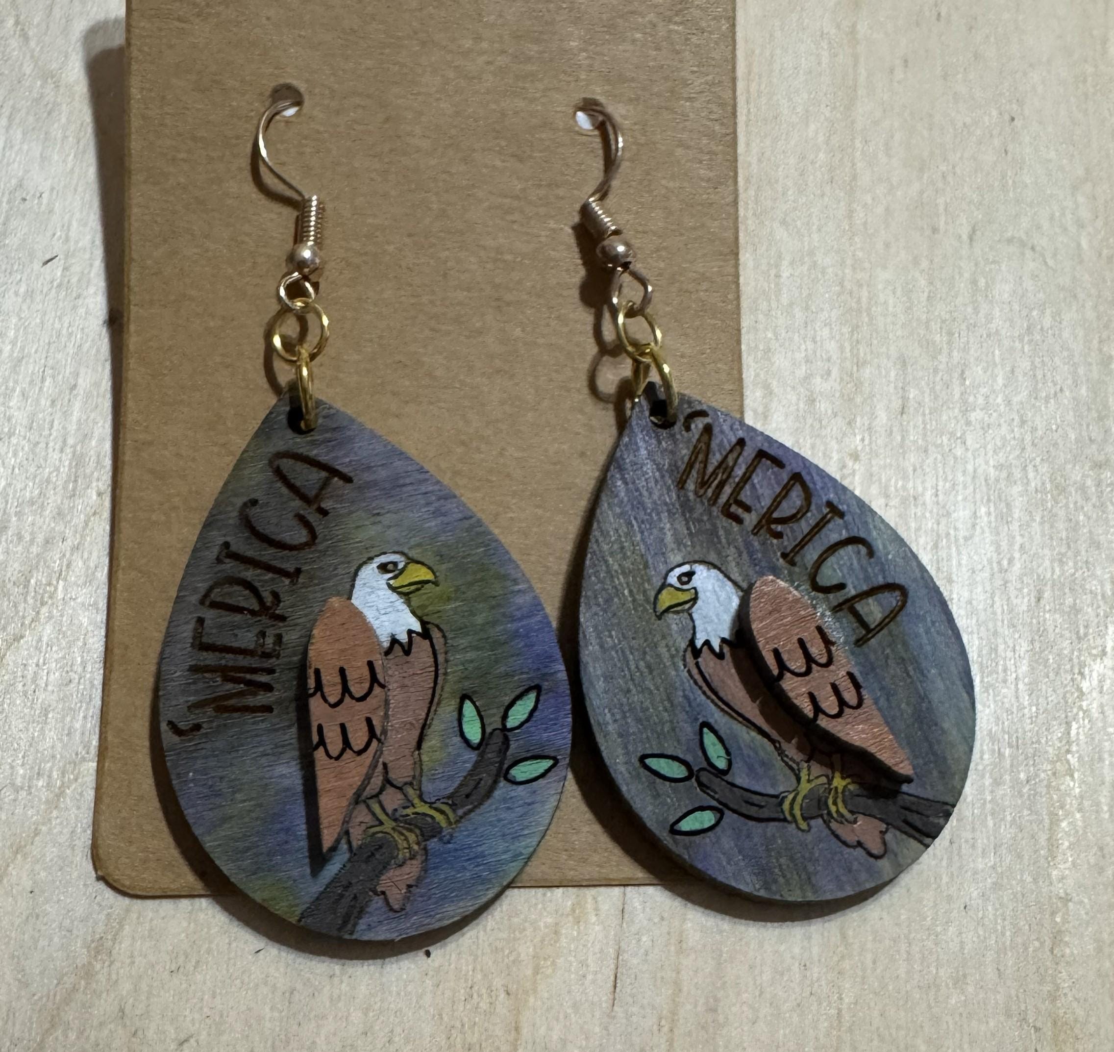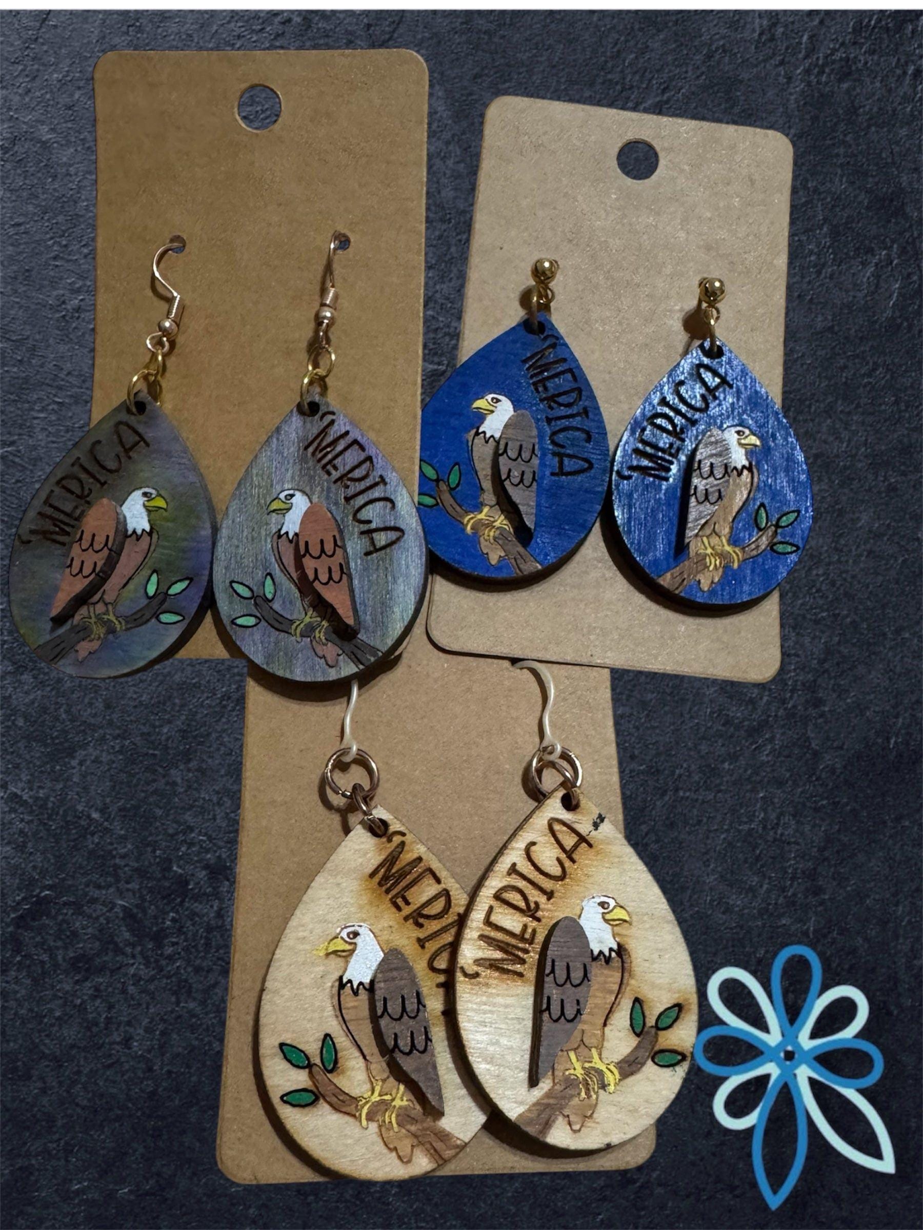 Celebrate your patriotic spirit with these Eagle * Merica * America * Independence Day Earrings. Featuring a bold eagle design paired with an engraved "merica," these earrings capture the essence of American pride. Perfect for Independence Day or whenever you want to showcase your love for the USA, they offer a stylish way to honor freedom and heritage. Lightweight and easy to wear, these earrings make a meaningful accessory for any occasion that calls for a touch of patriotism.