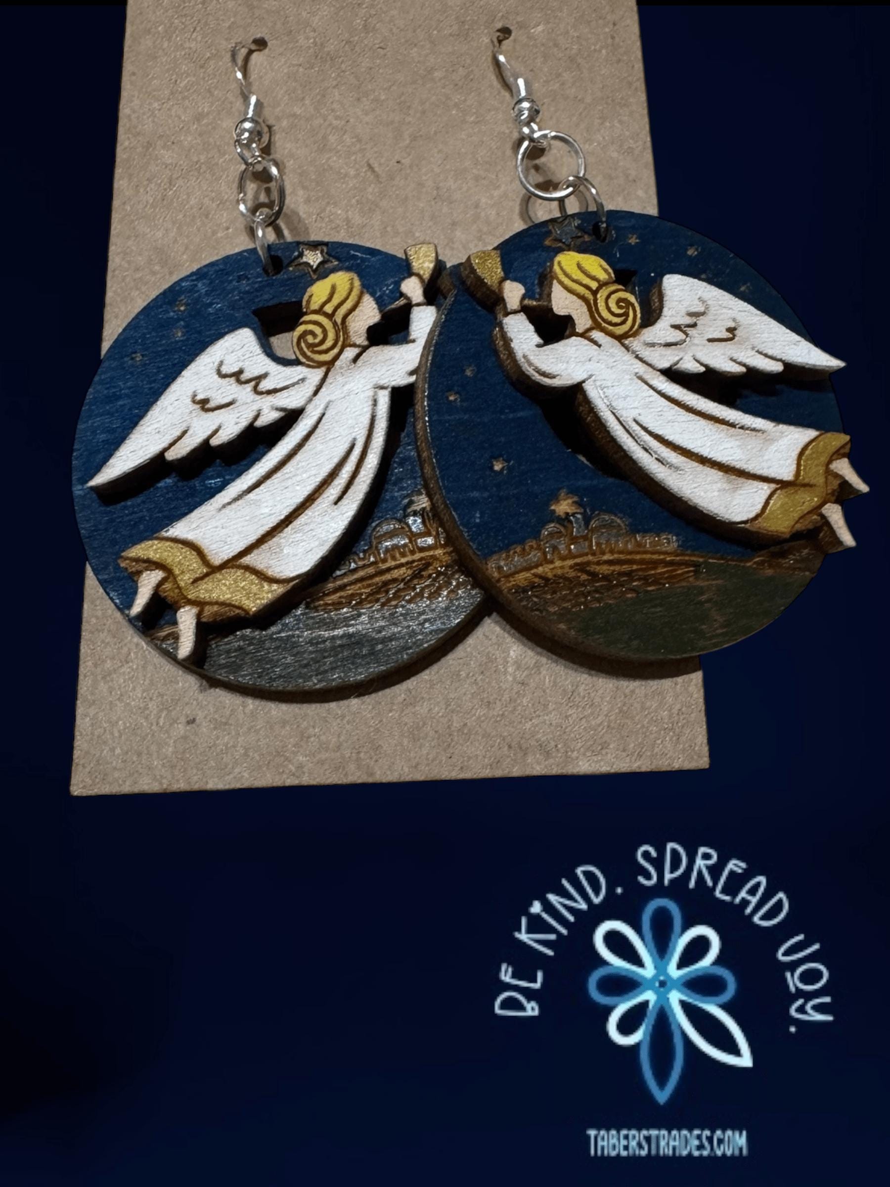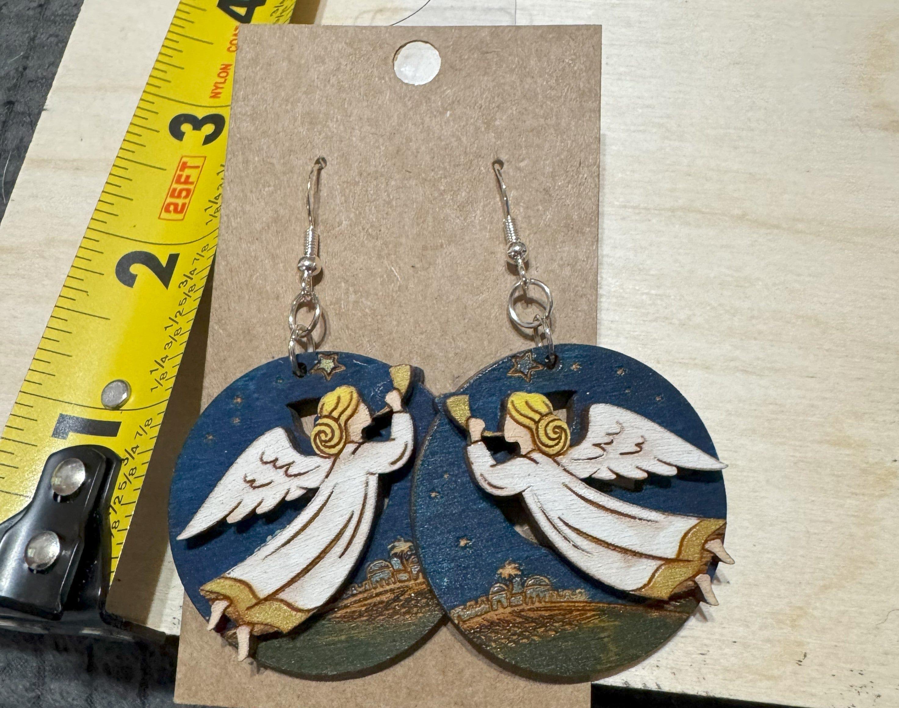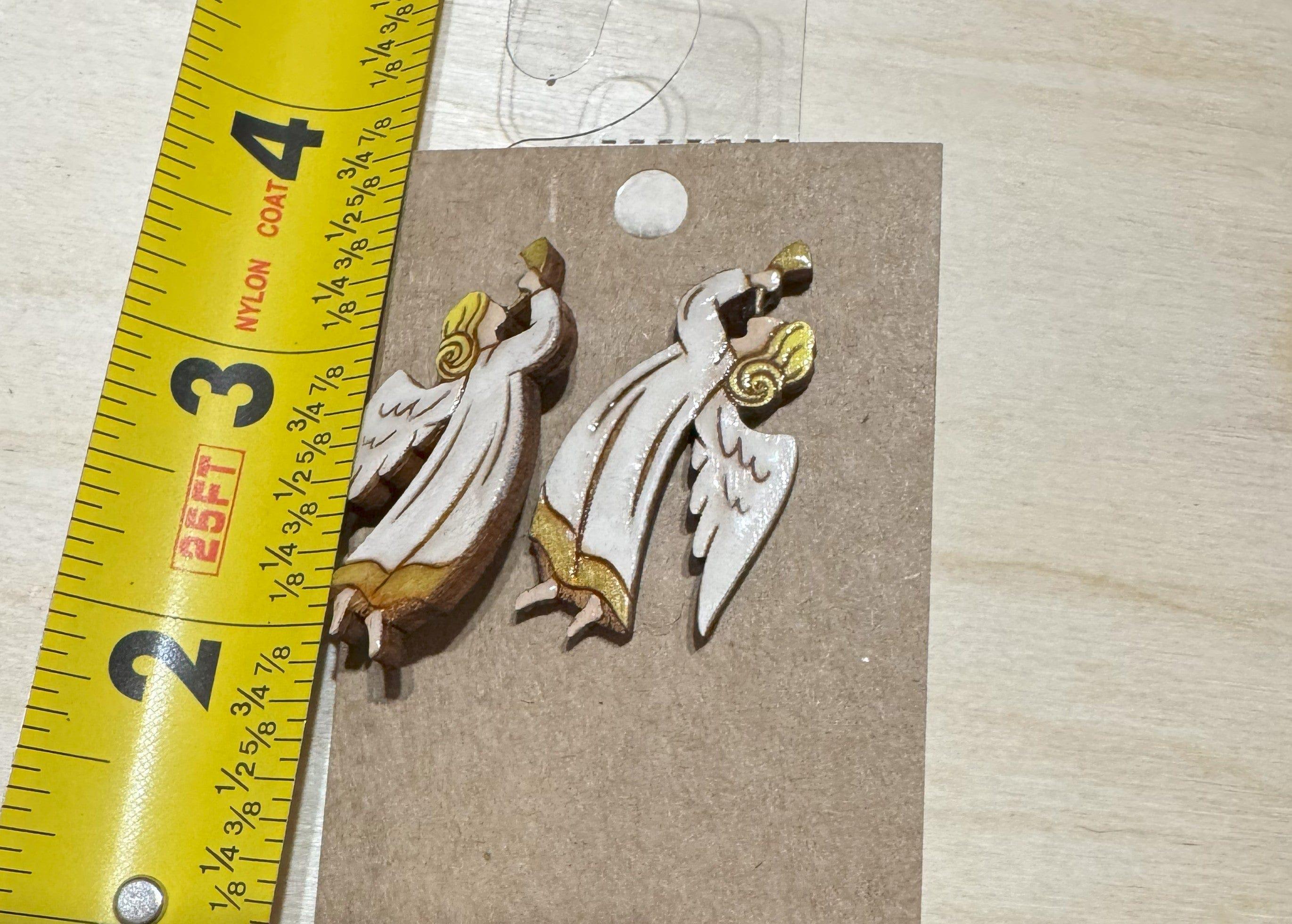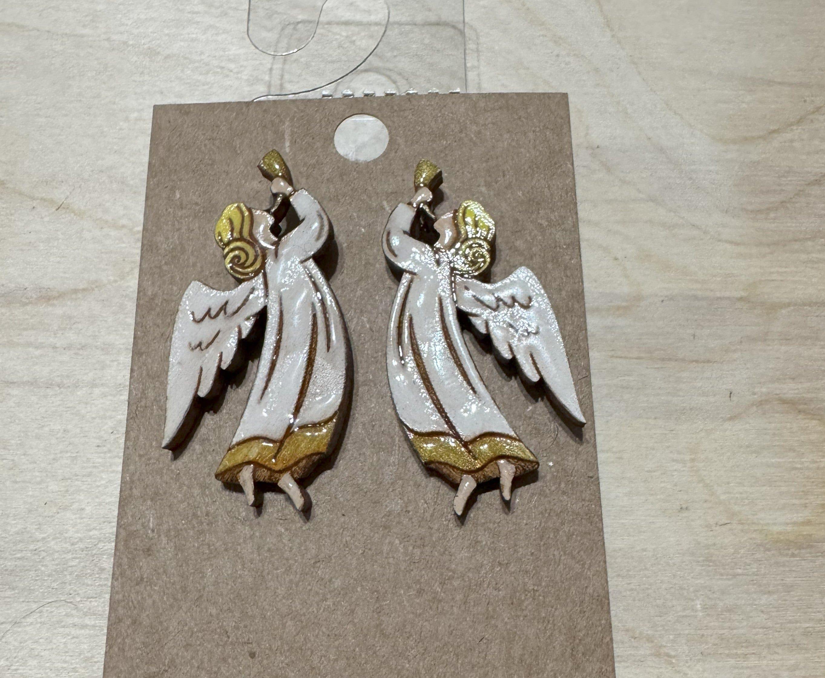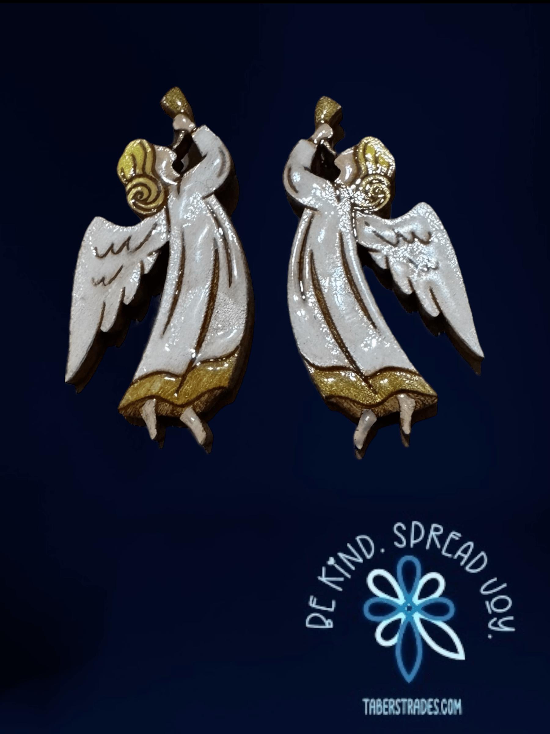 Delight in the charm of these hand-painted wooden earrings featuring angels playing trumpets. Each pair is carefully crafted to bring a unique, artistic touch to your look. Lightweight and comfortable, they add a graceful accent to any outfit. Customize your earrings to match your personal style with available options, making them a perfect, meaningful gift or a special treat for yourself.