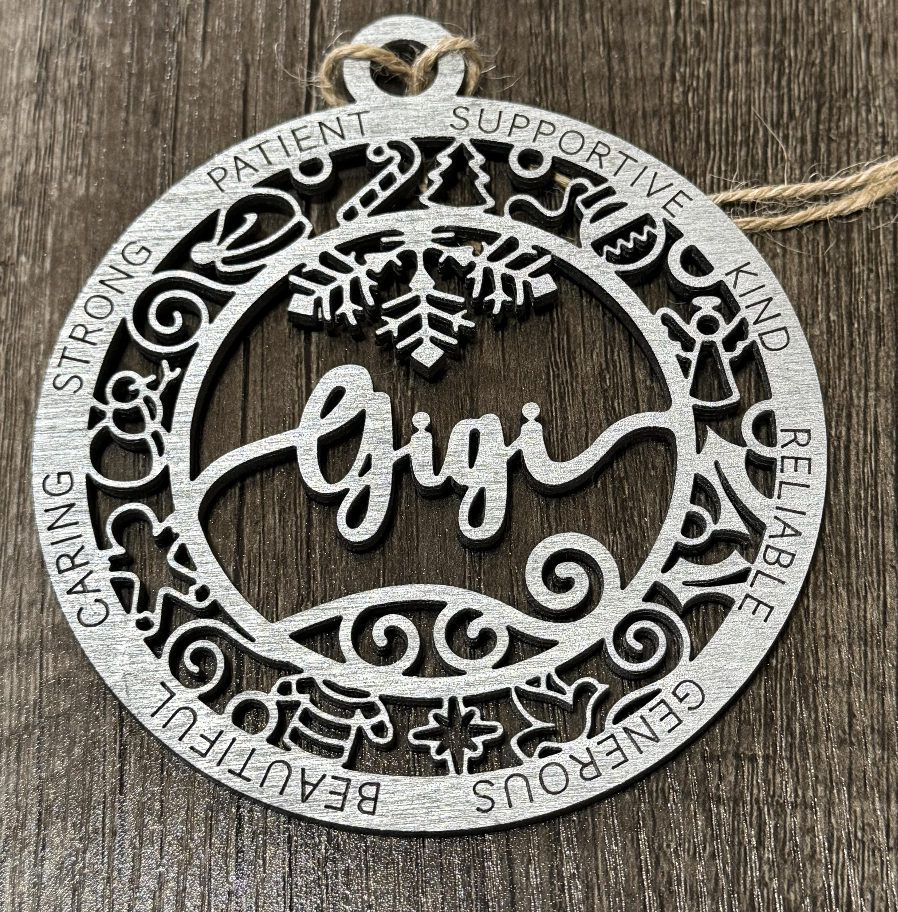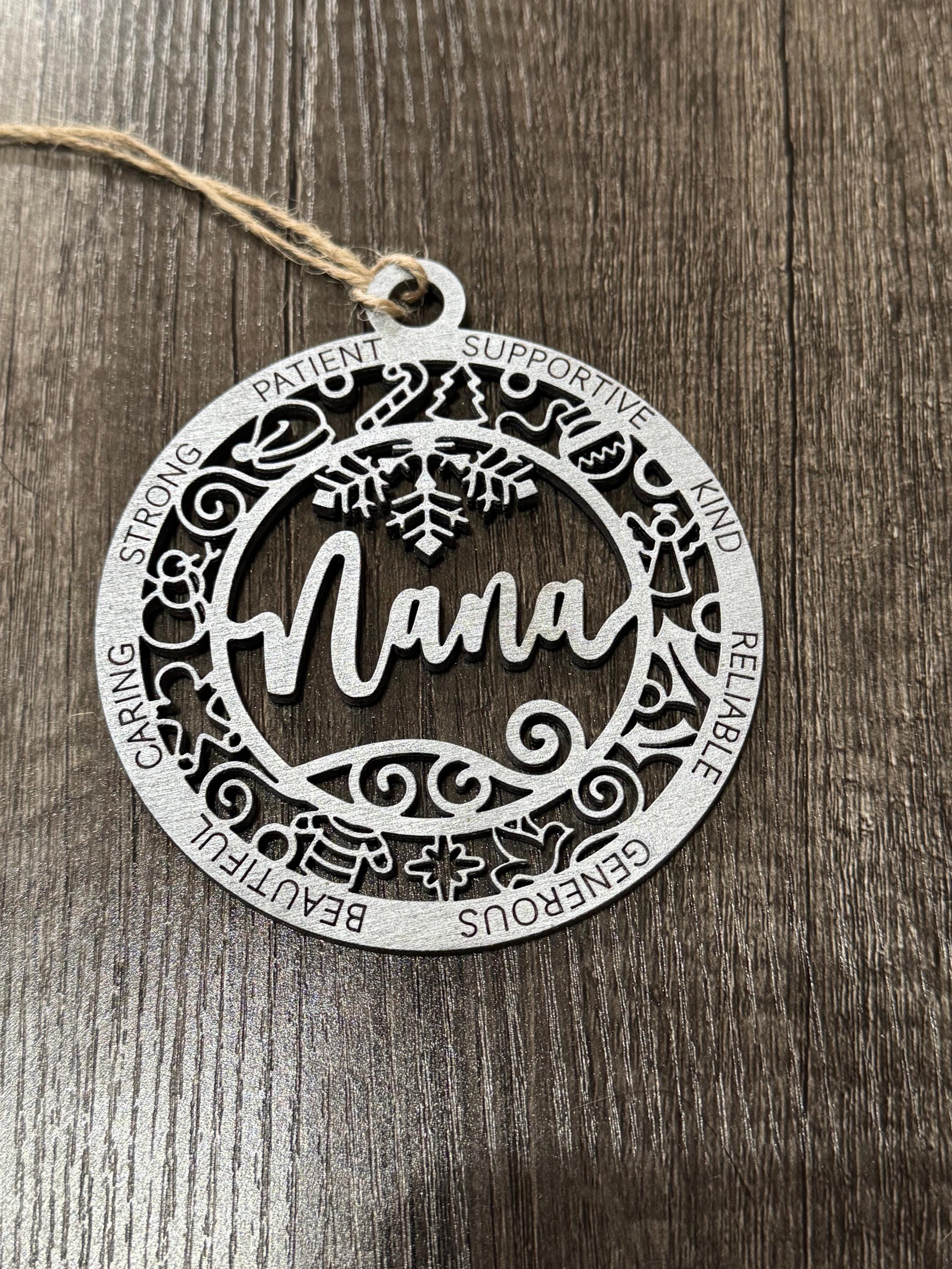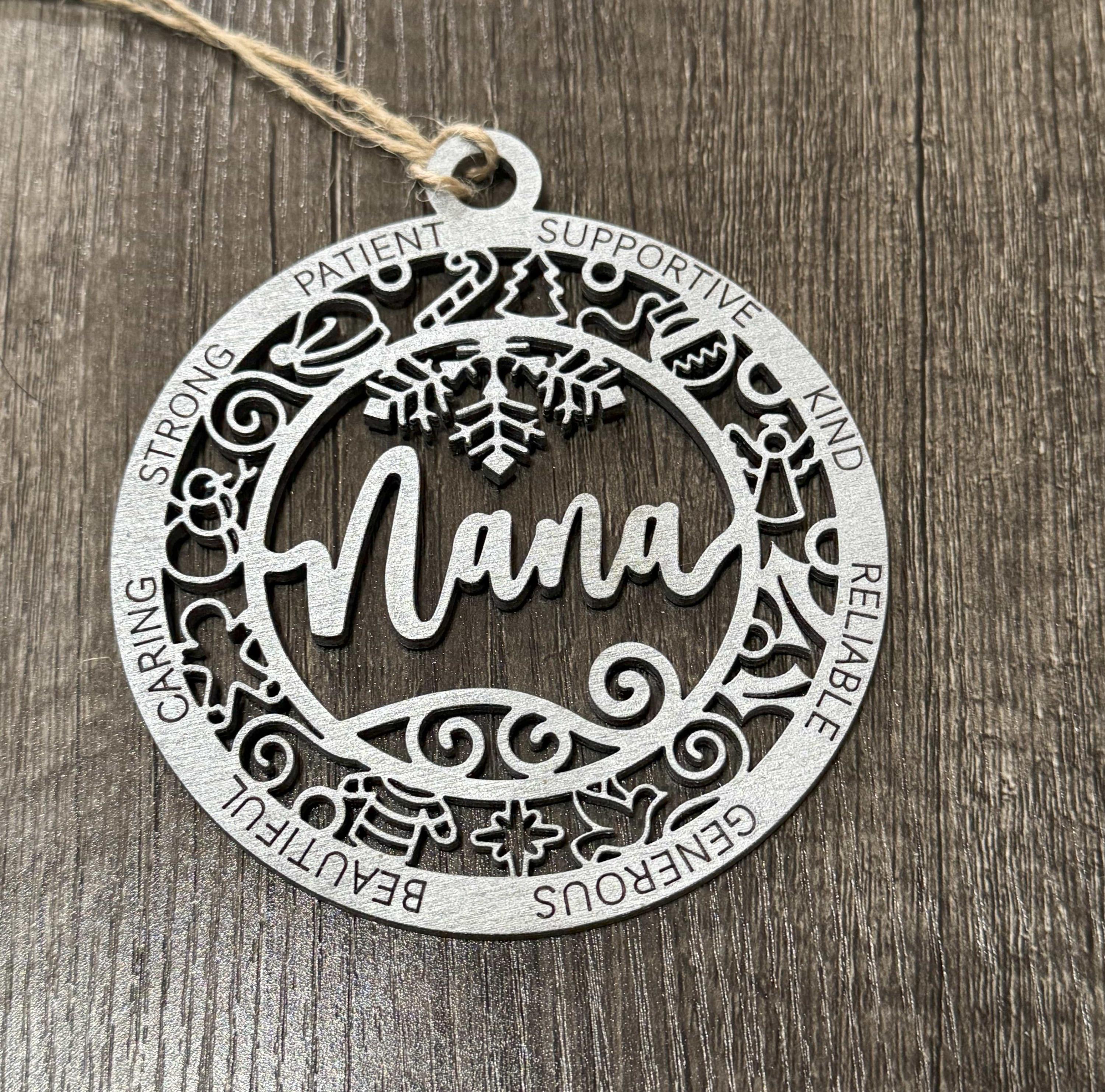 Crafted from wood and beautifully painted silver, it brings a warm, personal touch to your holiday decor. Perfect for honoring the cherished Nana in your life, this ornament adds a heartfelt sparkle to any Christmas tree.