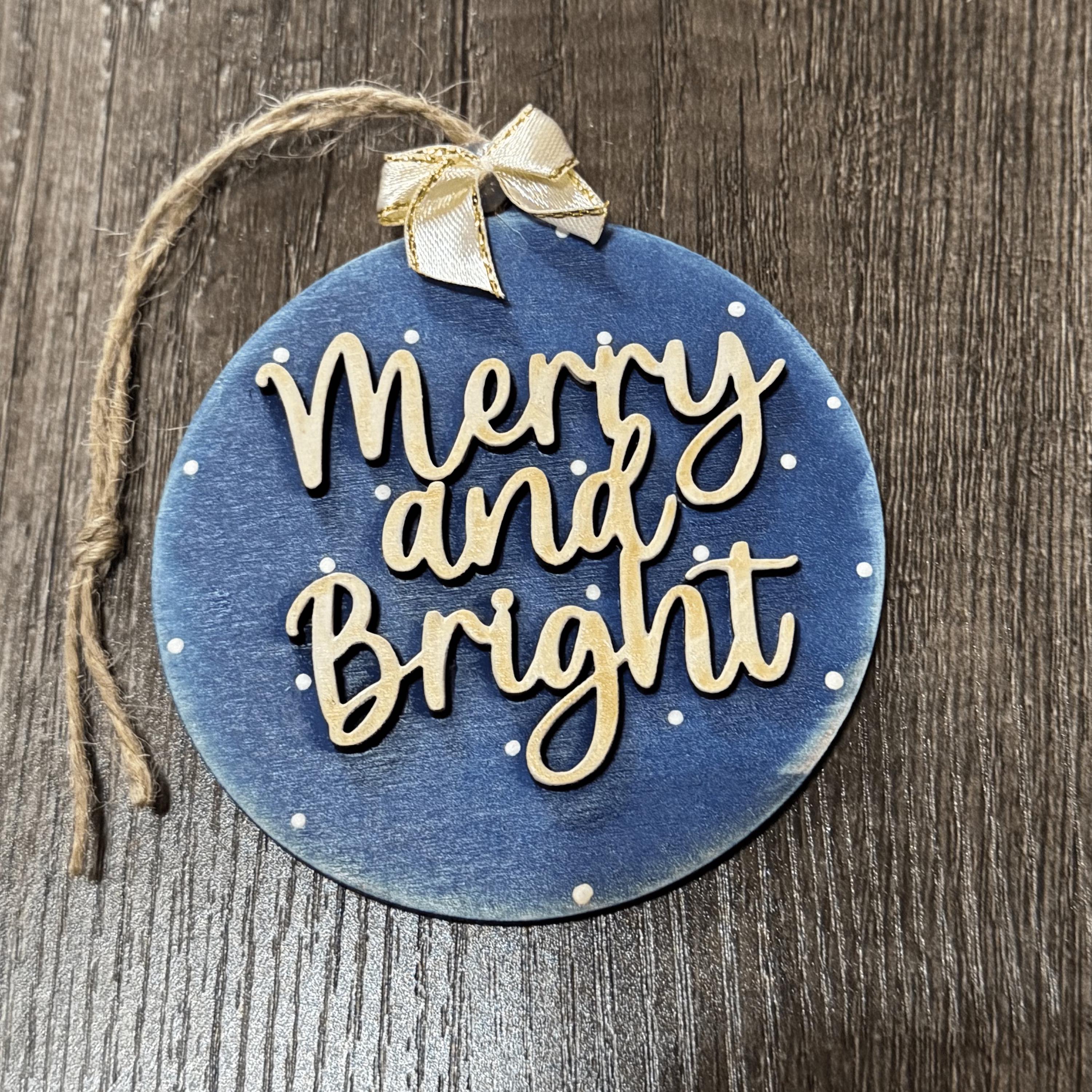 Hand-painted in blue with cream text and dots.
