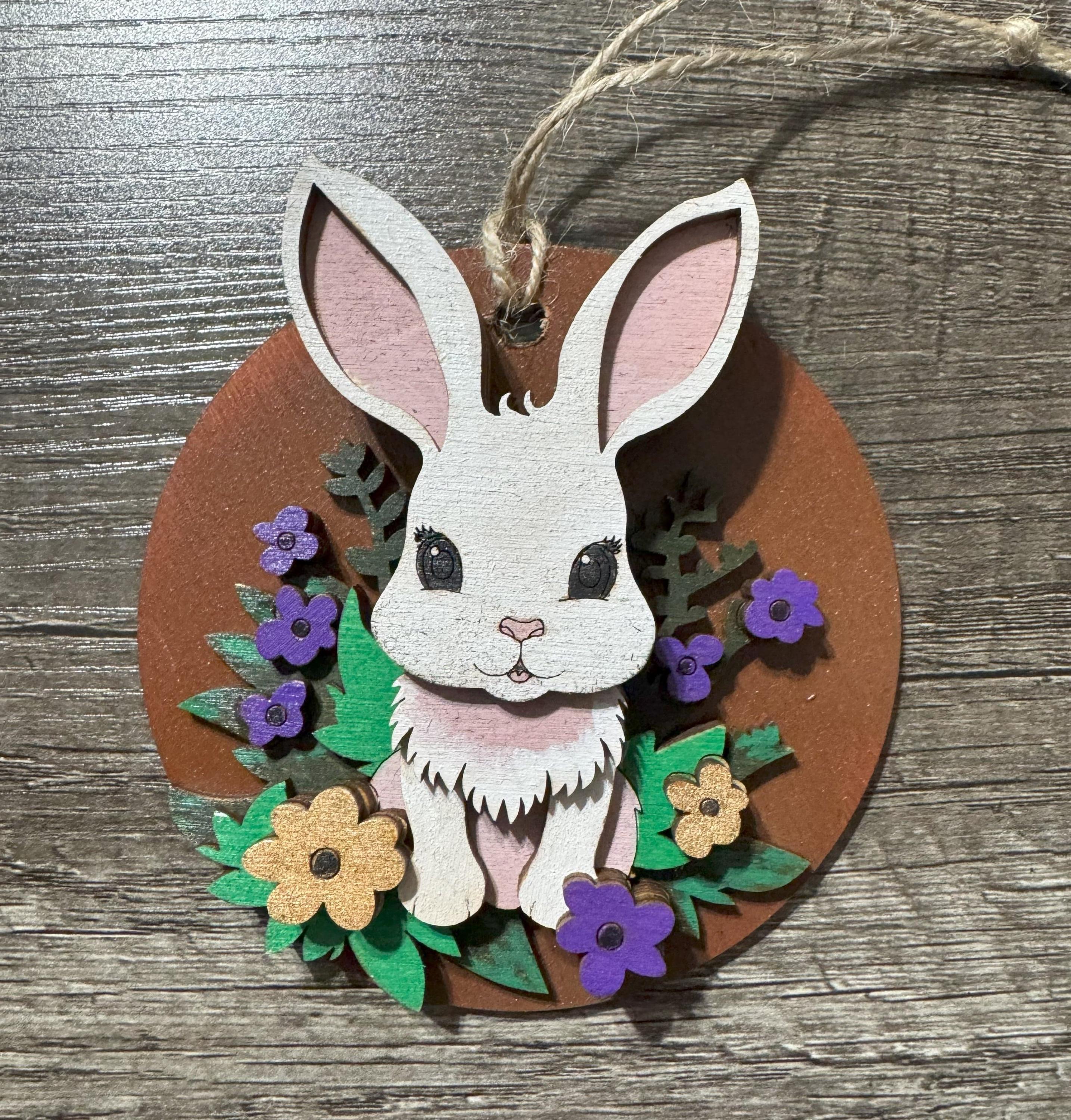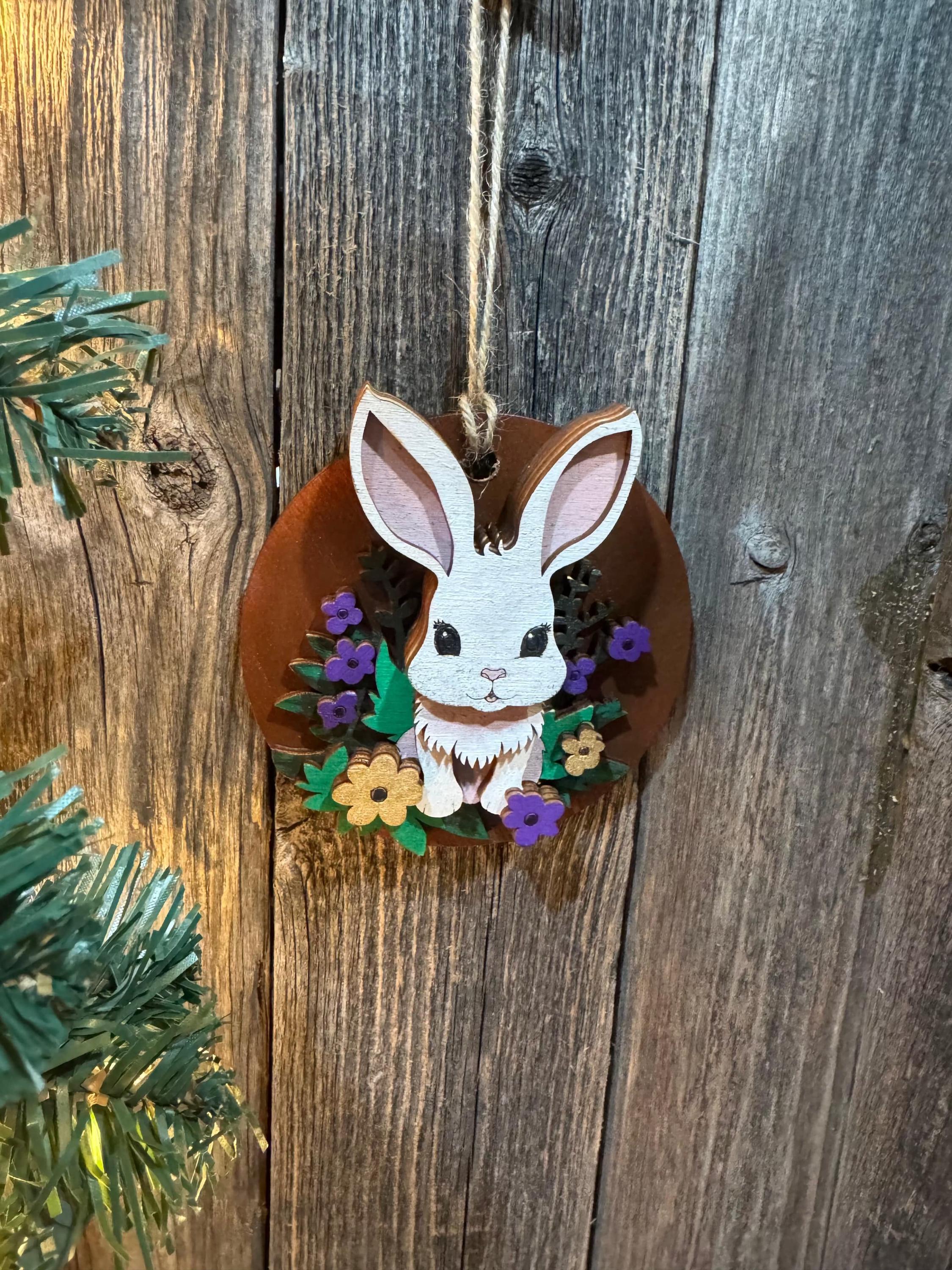 Enhance your holiday decor with this beautifully crafted layered wood ornament featuring a charming bunny rabbit surrounded by delicate flowers. Its natural wood texture and detailed design bring a warm, rustic feel to any space. Perfect for adding a cozy, heartfelt touch to your tree or as a thoughtful gift that celebrates nature and whimsy.