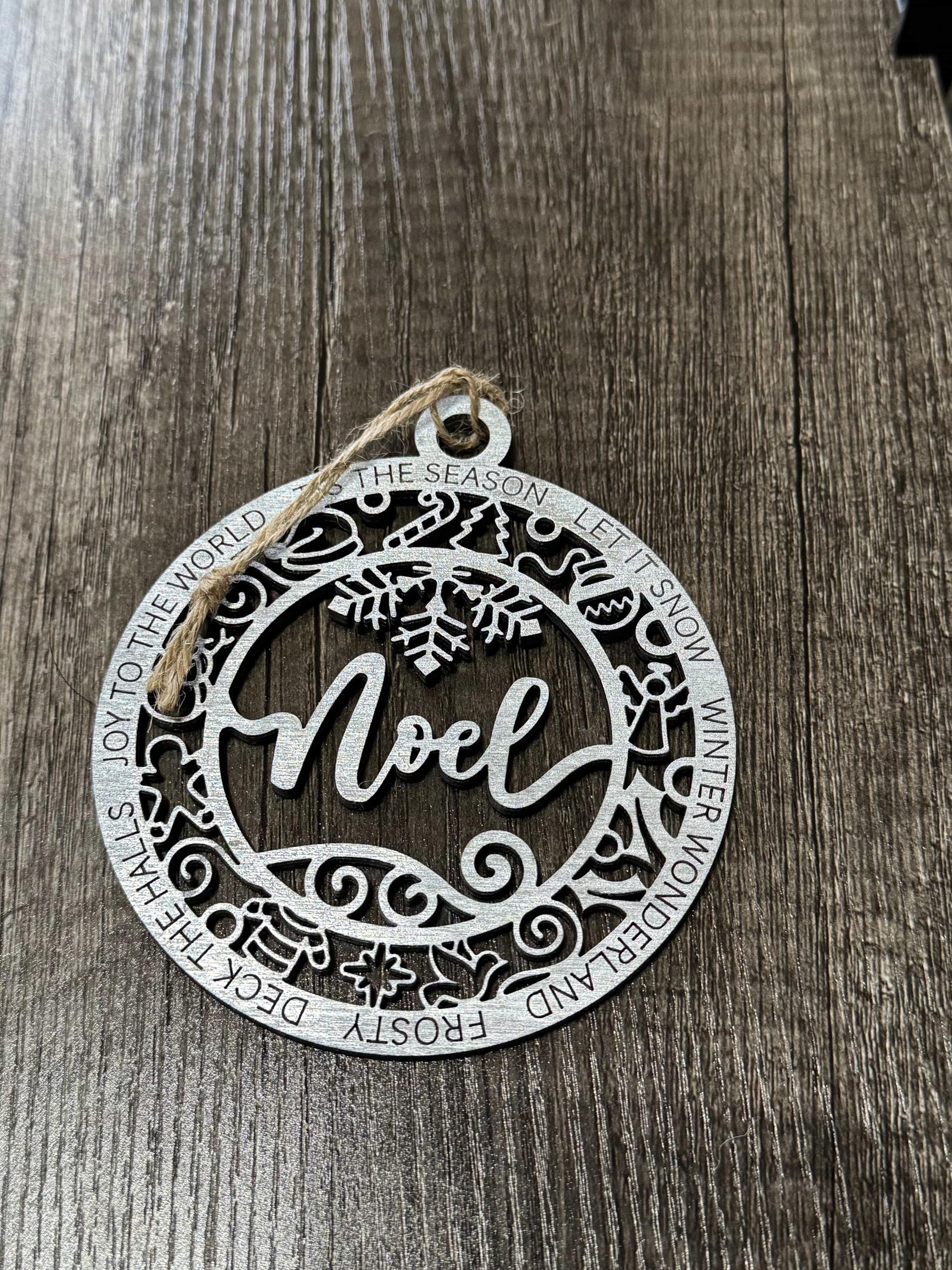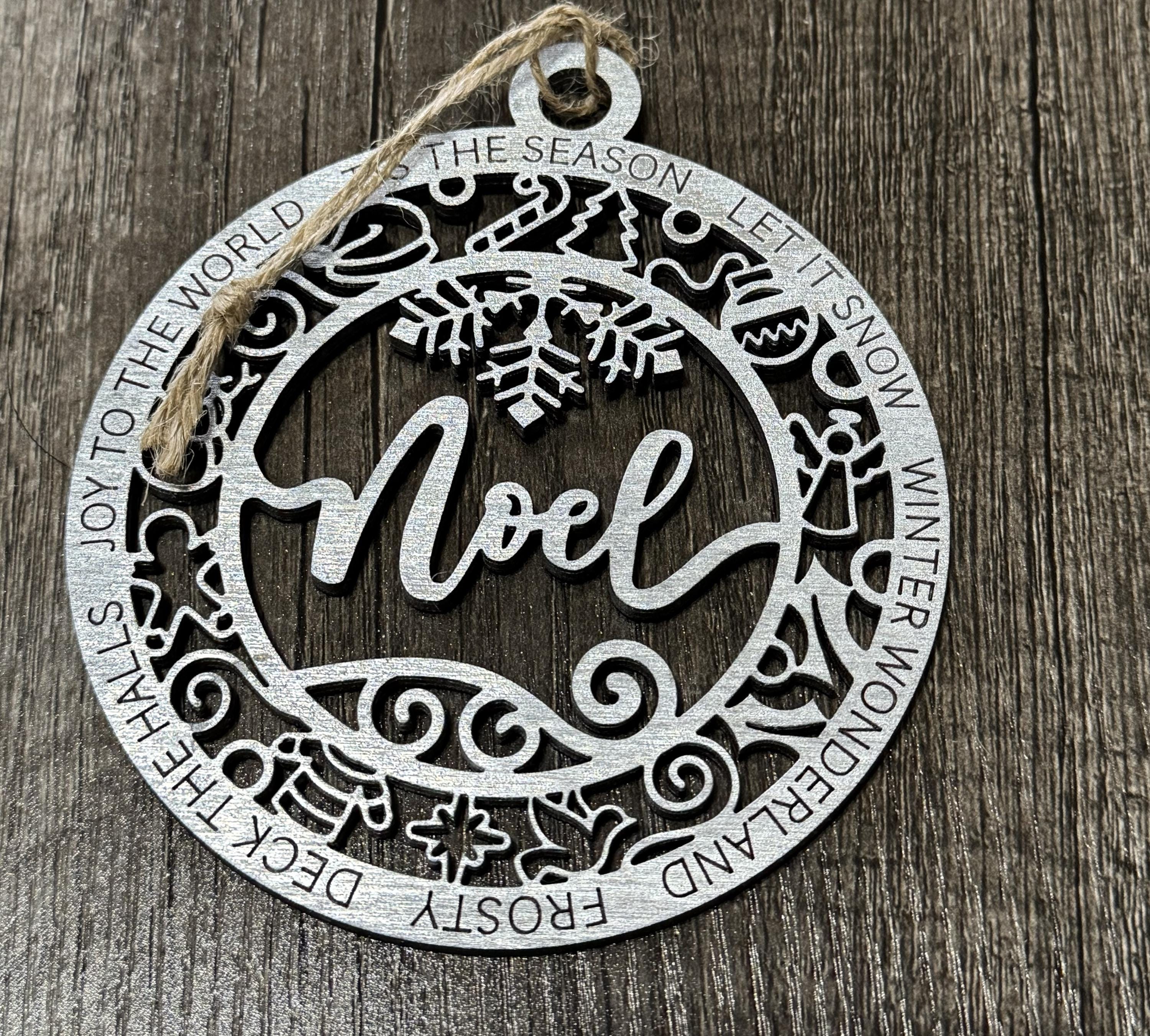 This wooden ornament features a festive silver paint finish with the word "Noel" beautifully cut out. Its simple yet elegant design makes it a charming addition to your holiday decor, offering a warm and inviting touch to your home celebrations.