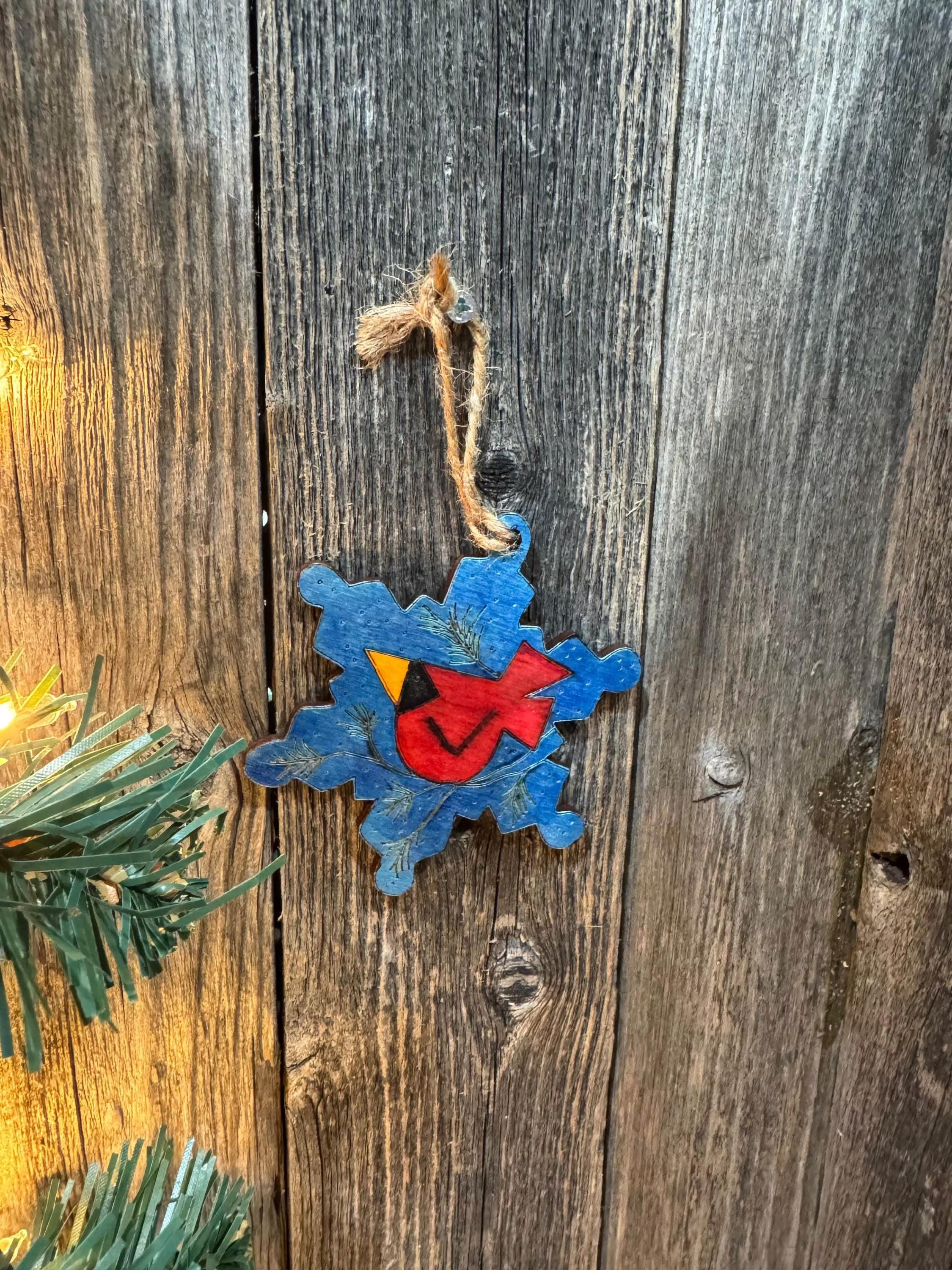 Elevate your holiday décor with this meticulously hand-painted cardinal ornament. Crafted on snowflake-shaped wood measuring 4 inches, this piece combines traditional Christmas symbolism with artisanal craftsmanship.