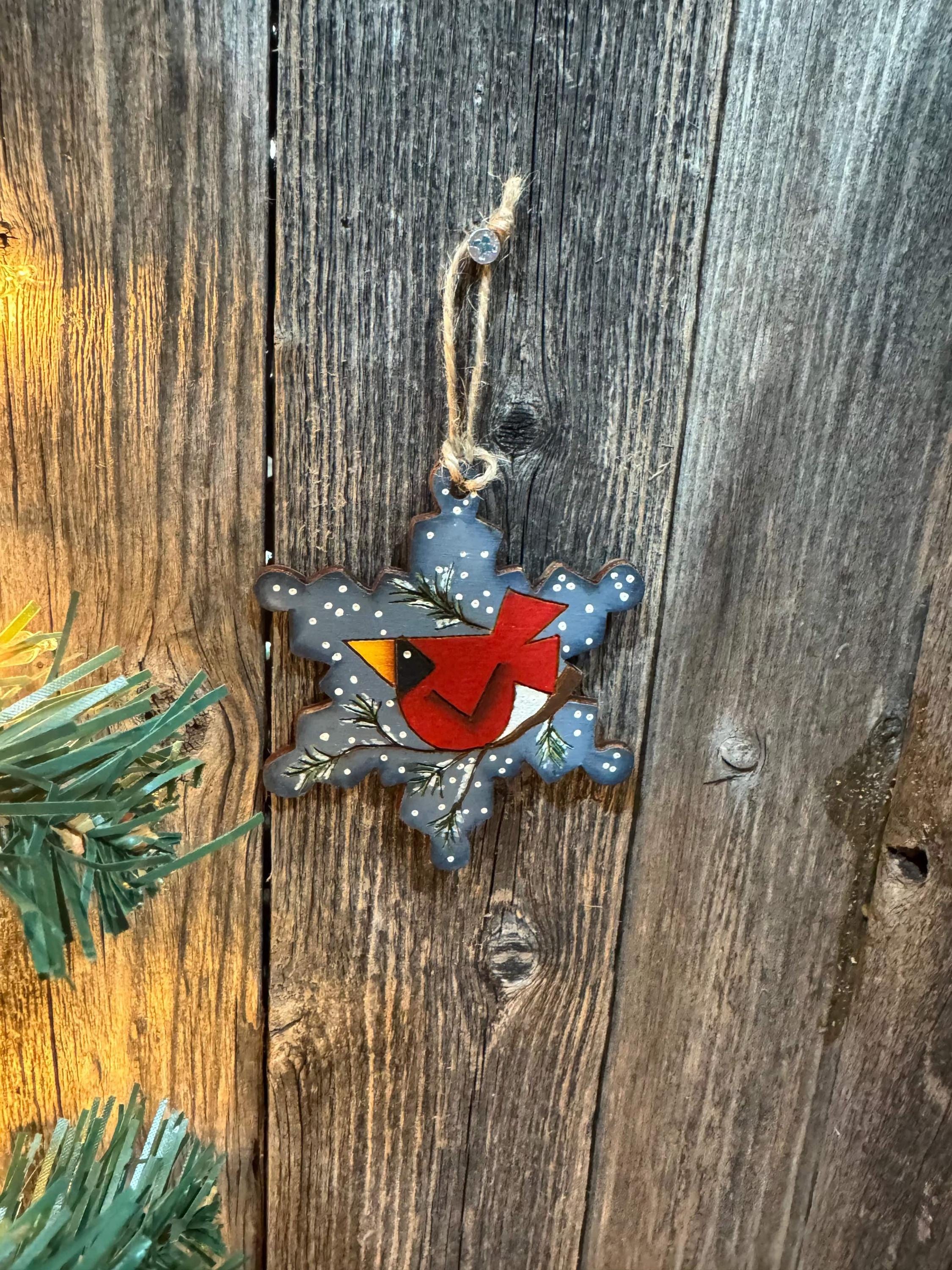 Elevate your holiday décor with this meticulously hand-painted cardinal ornament. Crafted on snowflake-shaped wood measuring 4 inches, this piece combines traditional Christmas symbolism with artisanal craftsmanship.