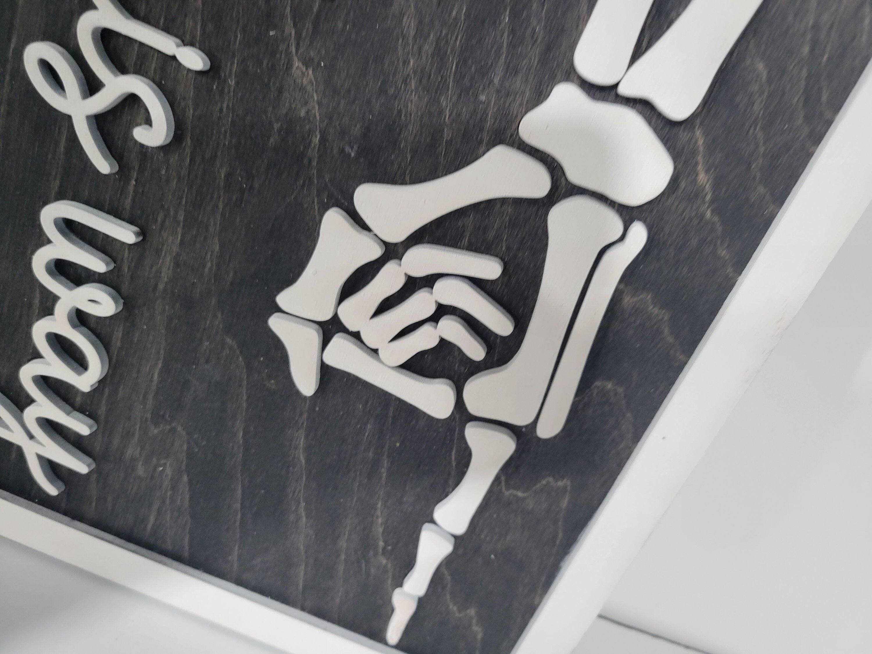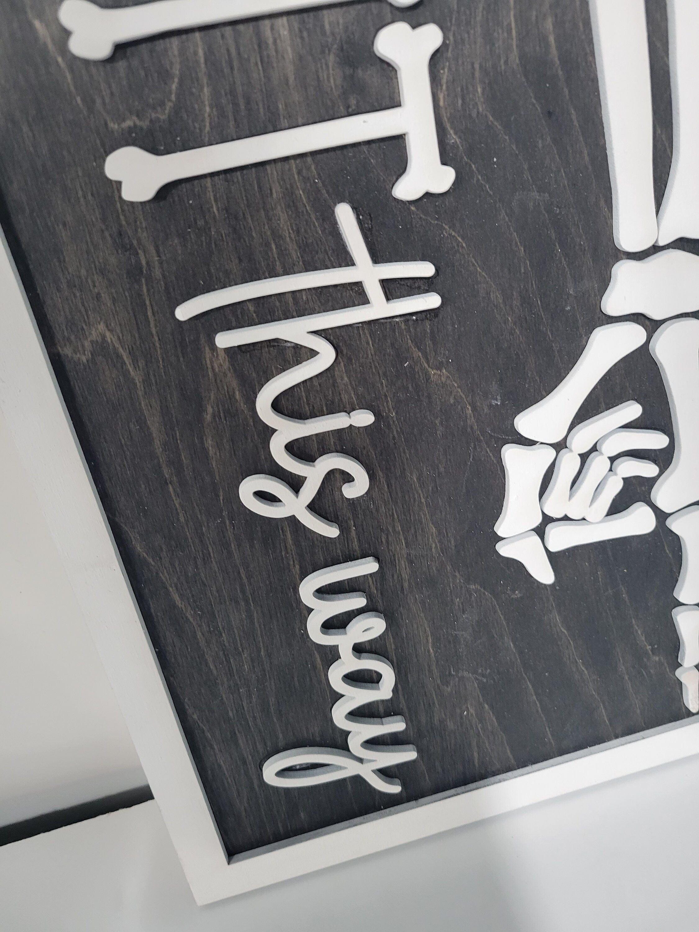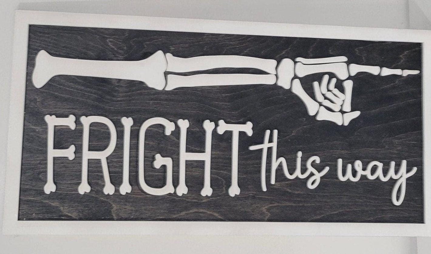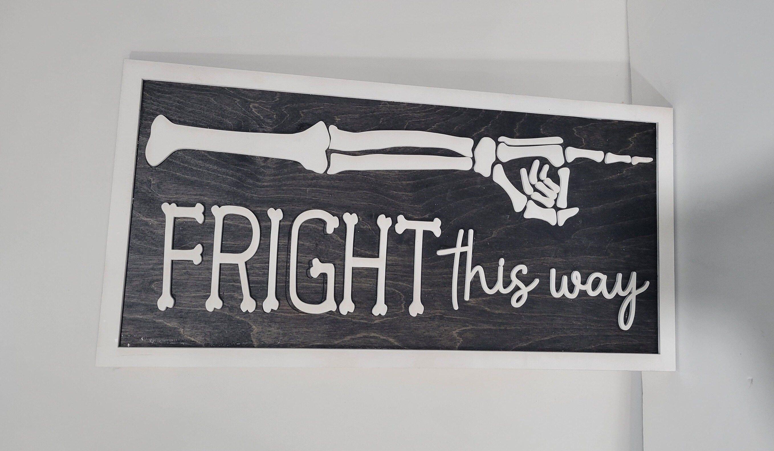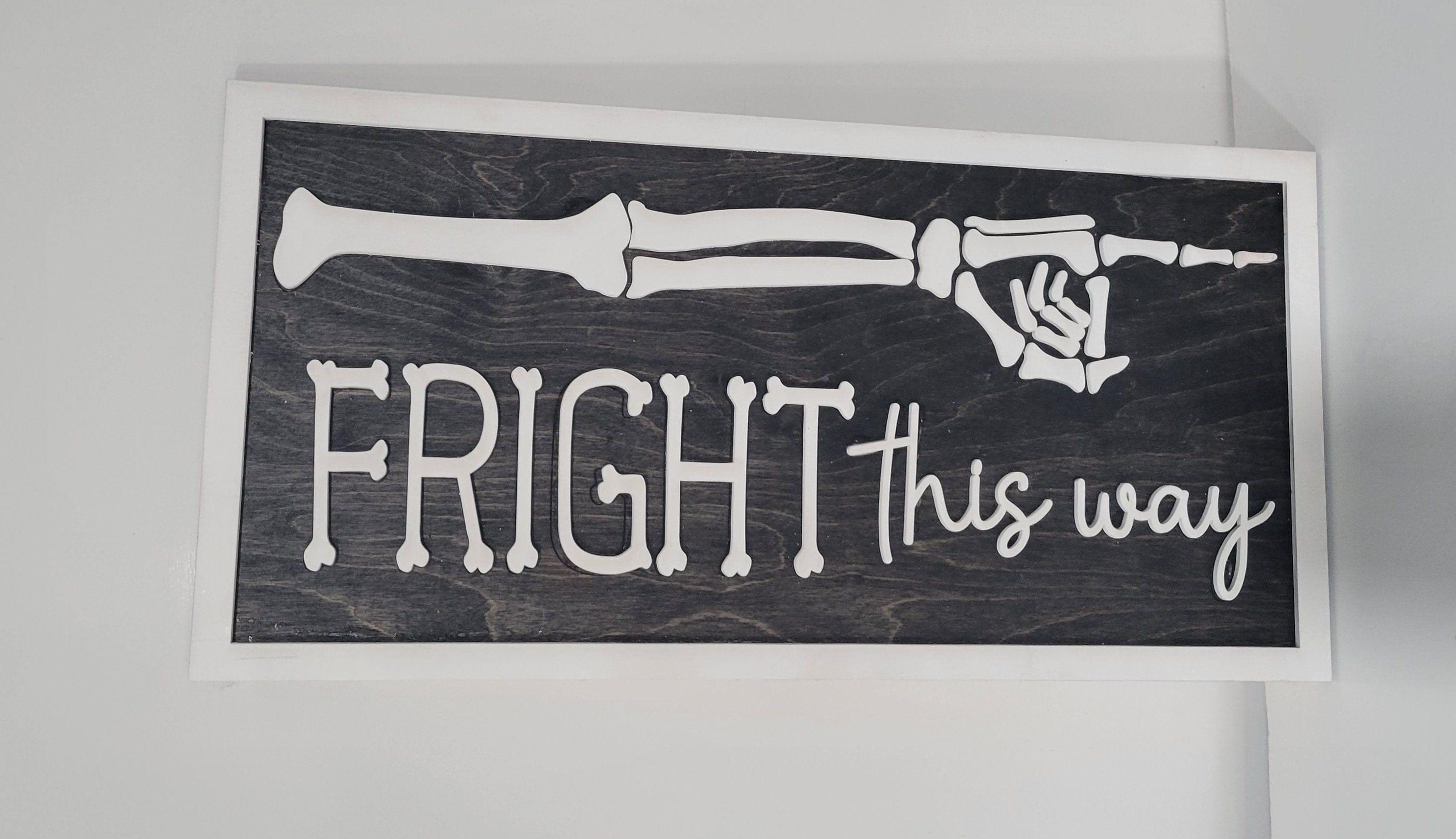 This adorable Fright This Way Sign is perfect for Halloween! The backer is made from 1/4" wood and the frame, words, and skeleton are made from 1/8" Includes wall hangers on the back Makes an awesome pair with the Peace, Love, Happiness sign. 19" long by 9.5" tall Suggested for indoor use only. Colors and wood grain may vary as each is custom-made. Color variations are available upon request.