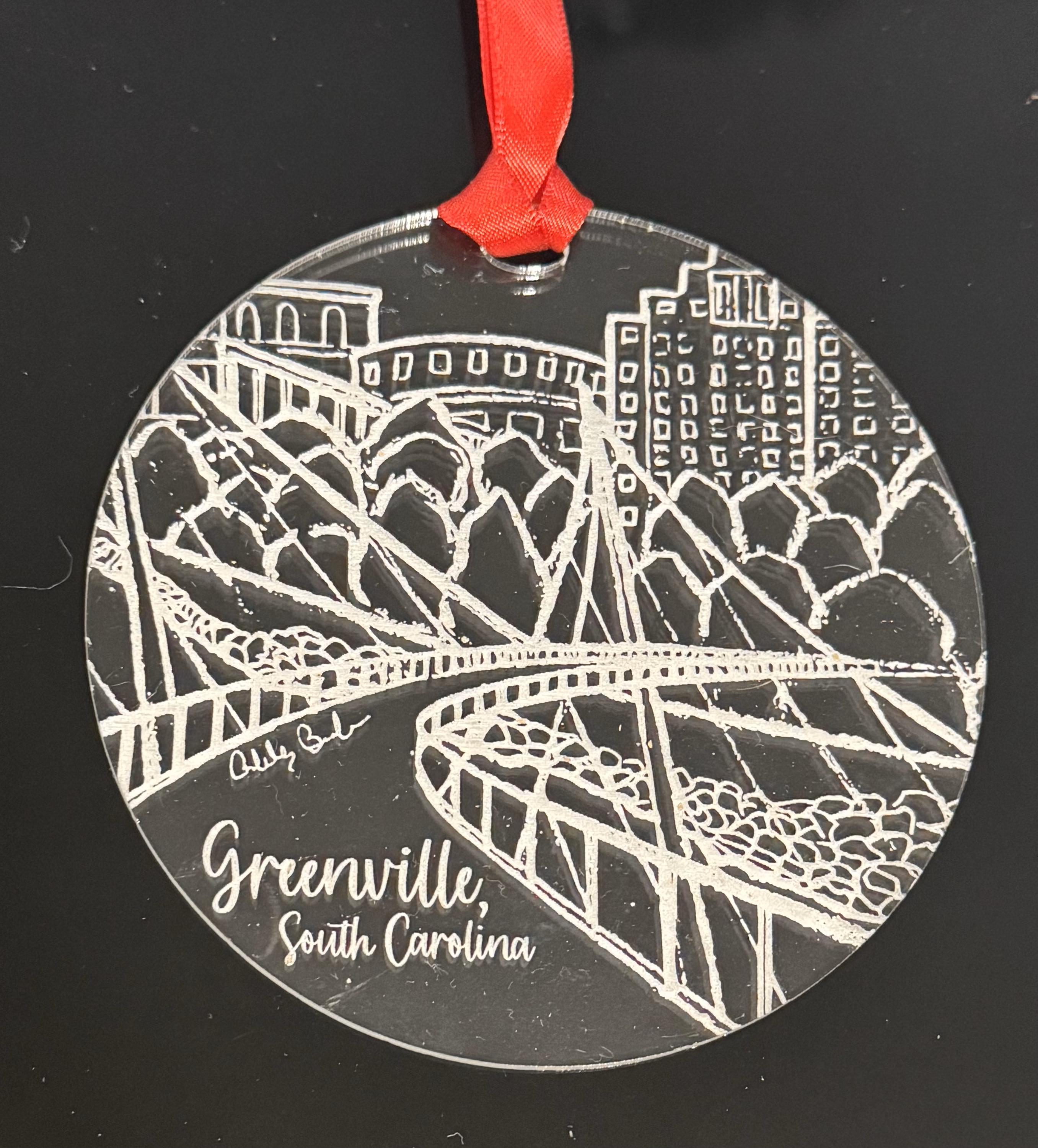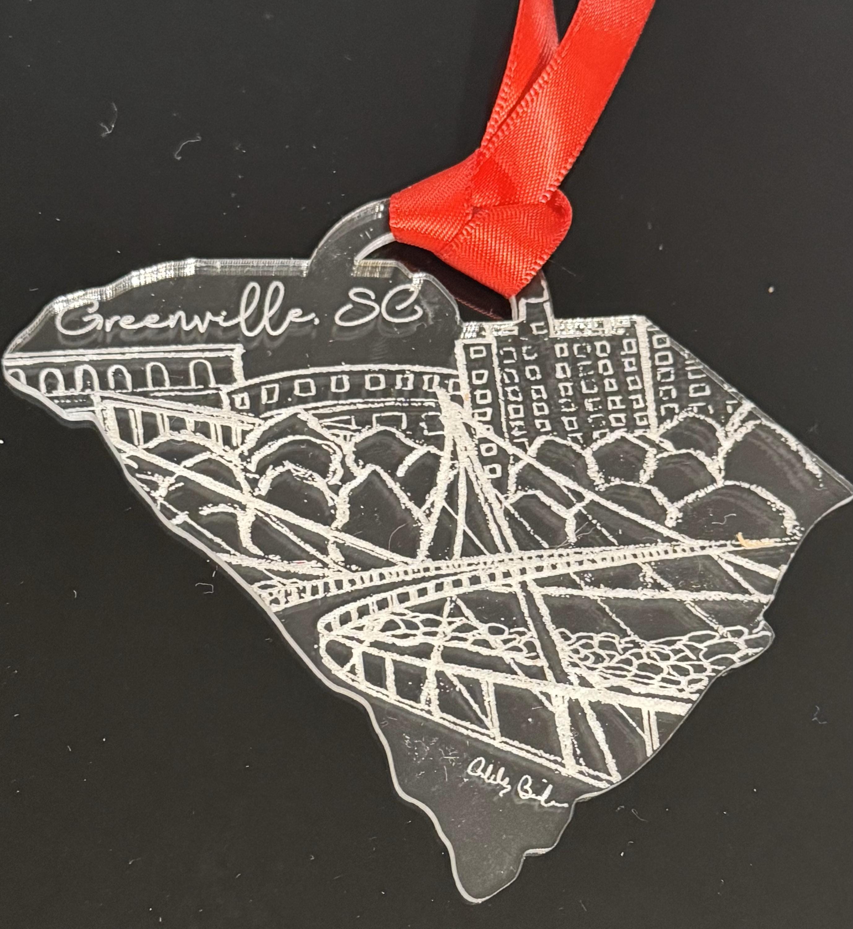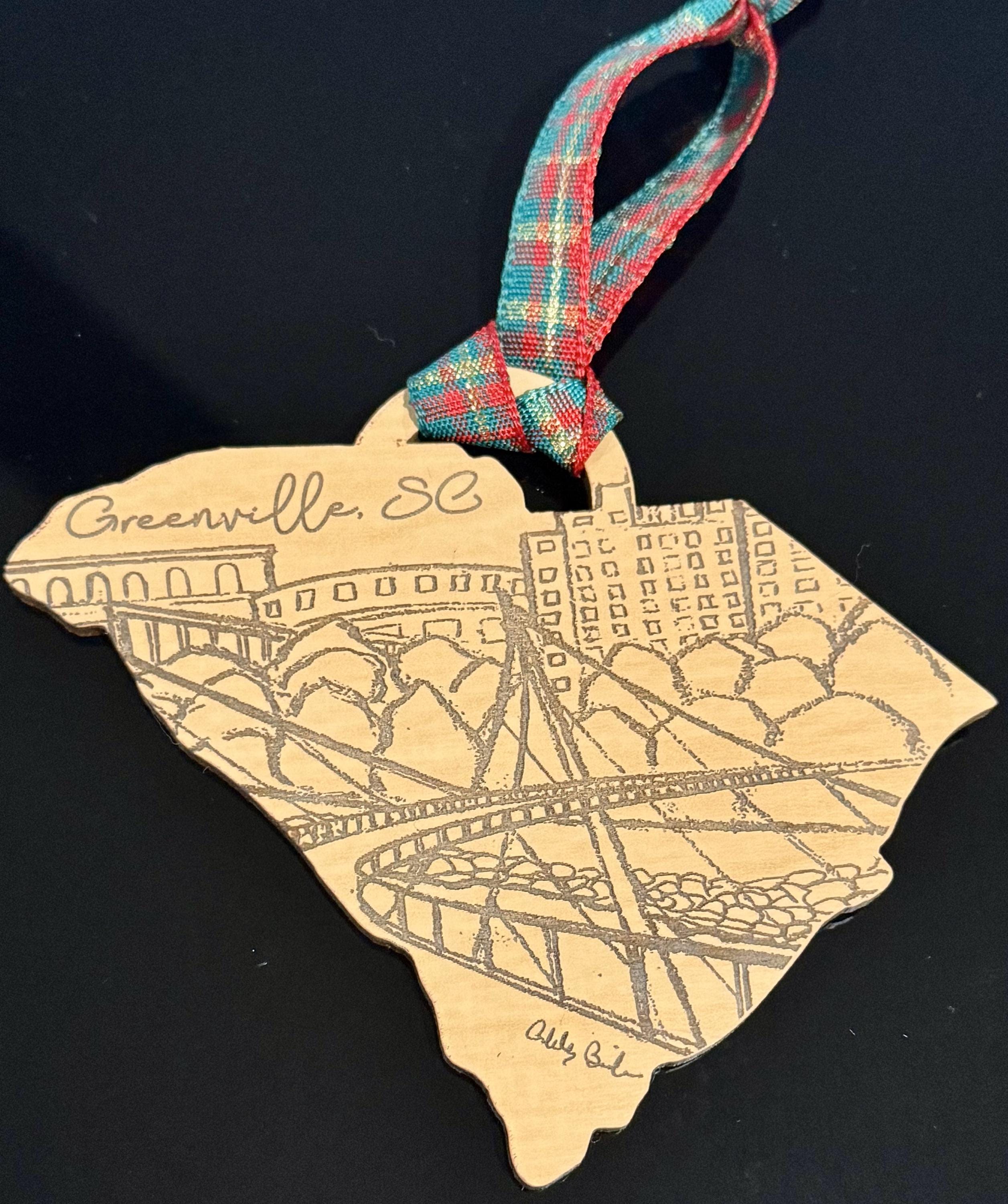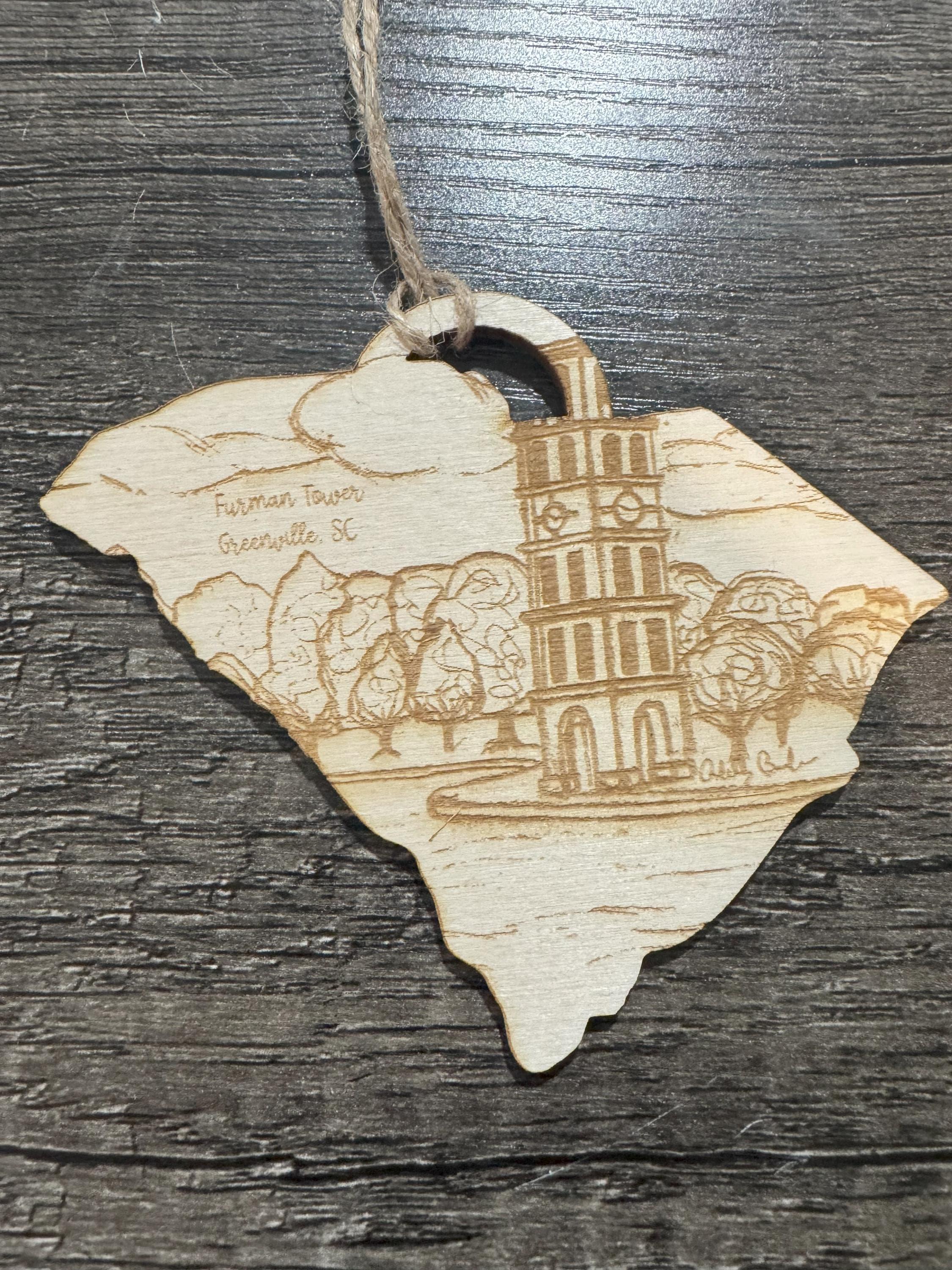 This ornament features an engraved pencil drawing of the Furman Tower in Greenville, SC, created by local artist Ashley Brickner. These ornaments make the perfect keepsake for anyone who loves our great city! There are three different versions of this beautiful ornament! You will find a listing for an acrylic version, a finished wood version (Eco Birch is a finished wood with an MDF core), and a raw wood version. Please note the Greenville version is pictured for the Eco Birch and Wood versions in the photos.