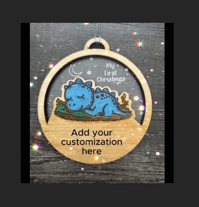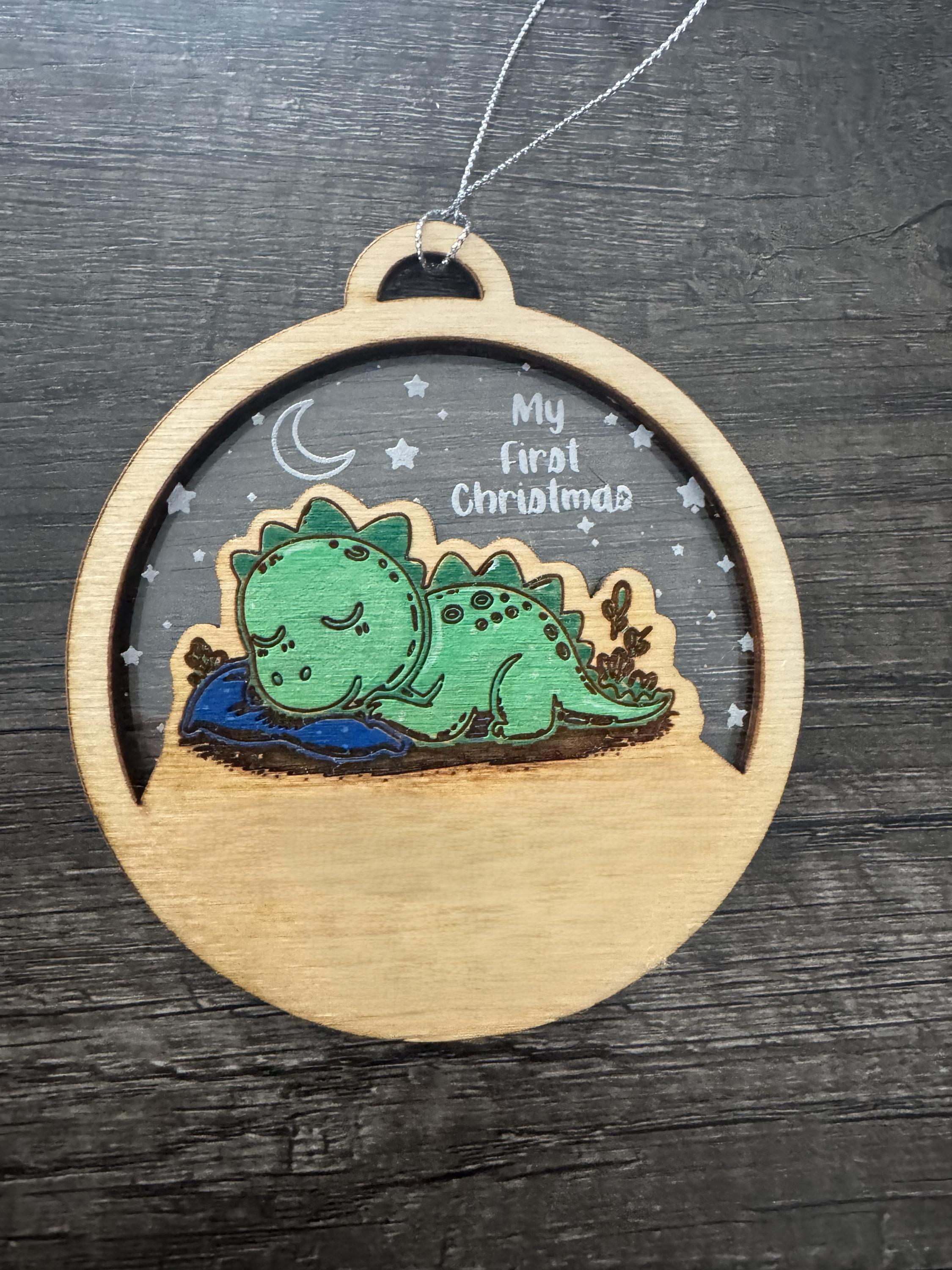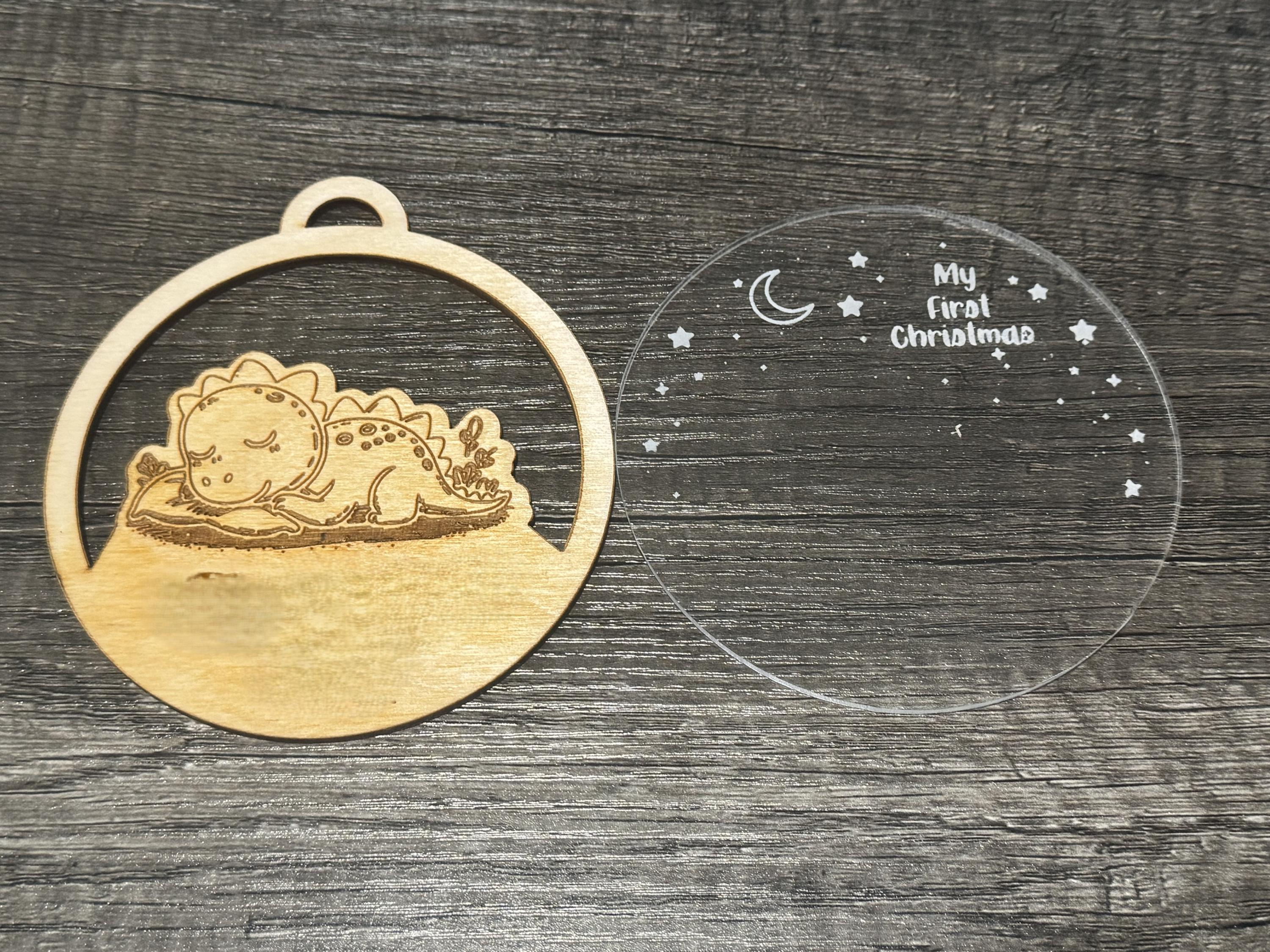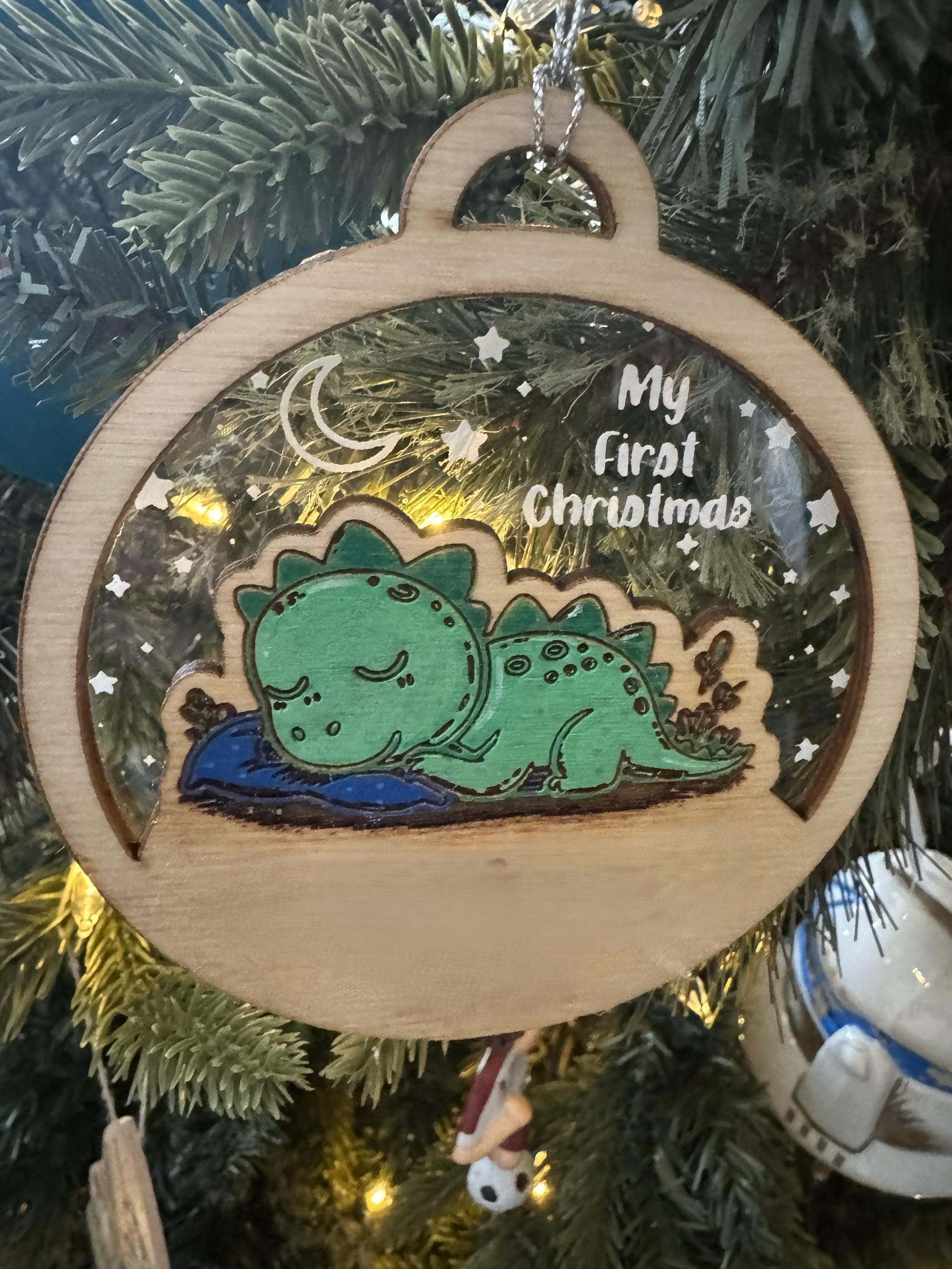 Mark the magic of a baby's first holiday season with this charming 4-inch circular ornament. Crafted with a wooden frame and a clear center, it features an adorable illustration of a sleepy blue dinosaur nestled on a green pillow beneath a starry night sky. The gentle moonlight and whimsical foliage add a dreamy touch to this keepsake design.