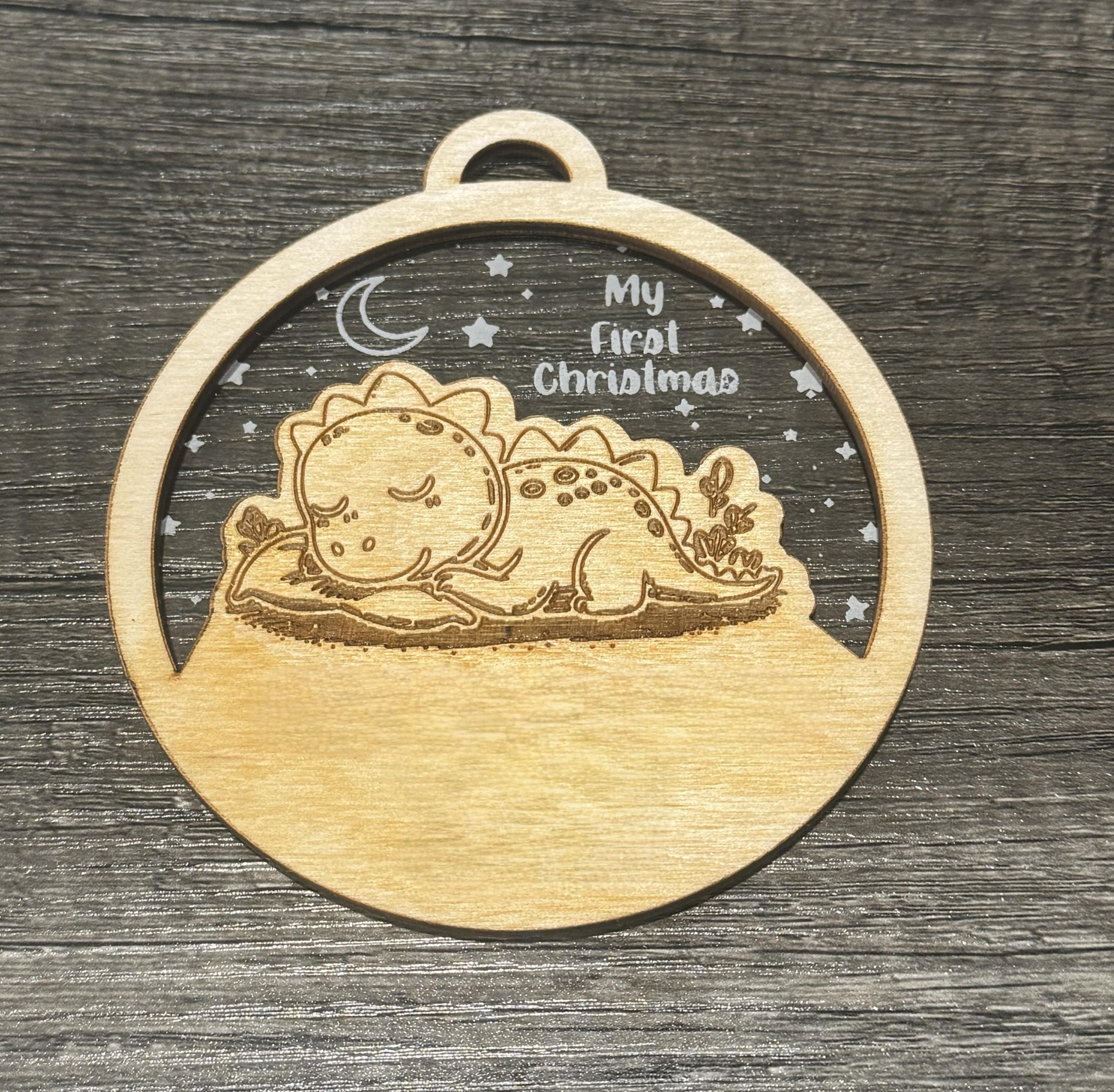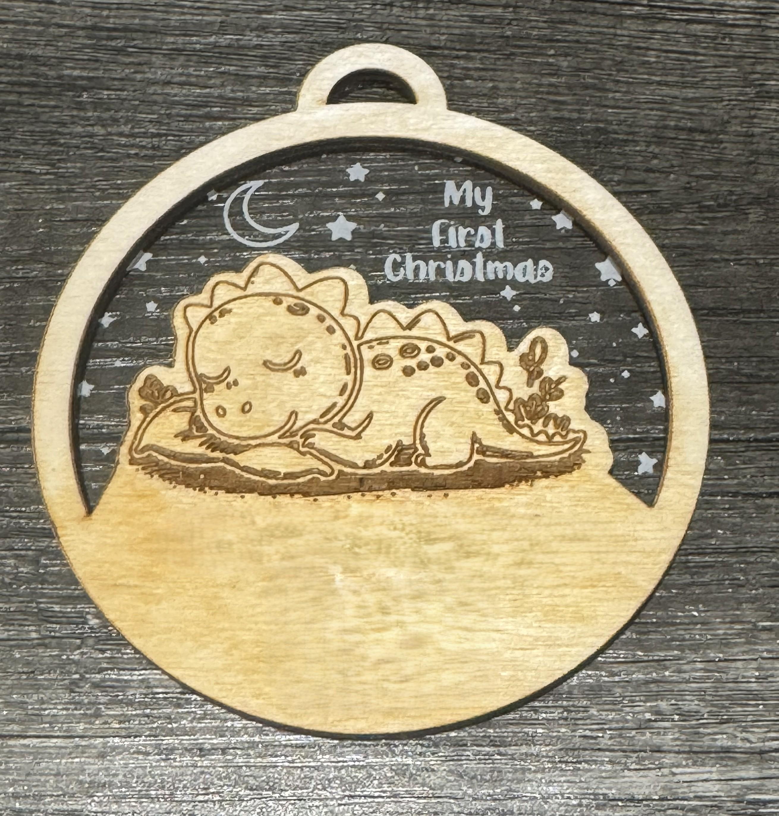Above the scene, the phrase "My First Christmas" is delicately etched, while the blank wood space leaves space for customization—perfect for adding a name, date, or special message to commemorate the occasion. A hanging string makes it easy to display on your tree, nursery, or gift wrap.