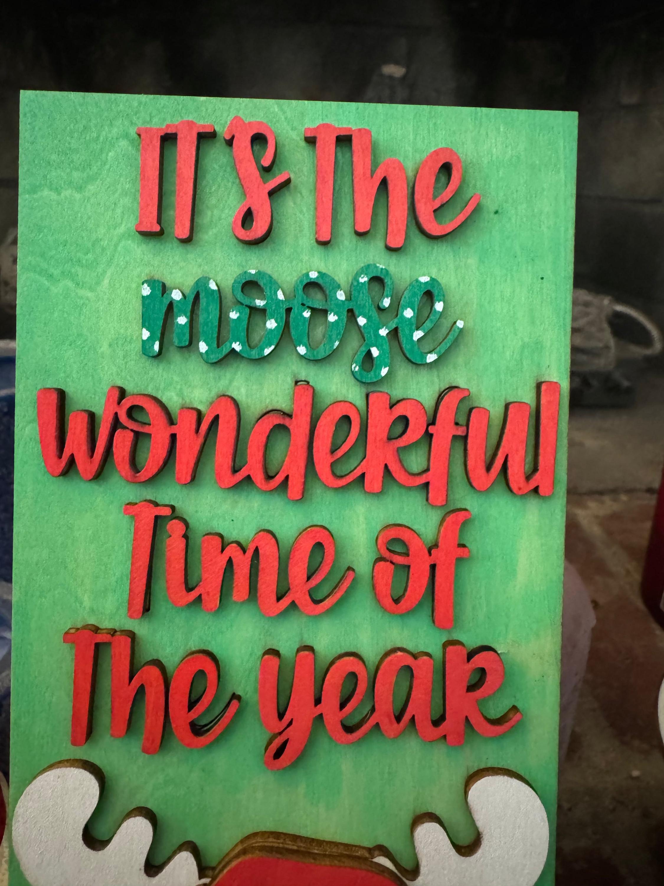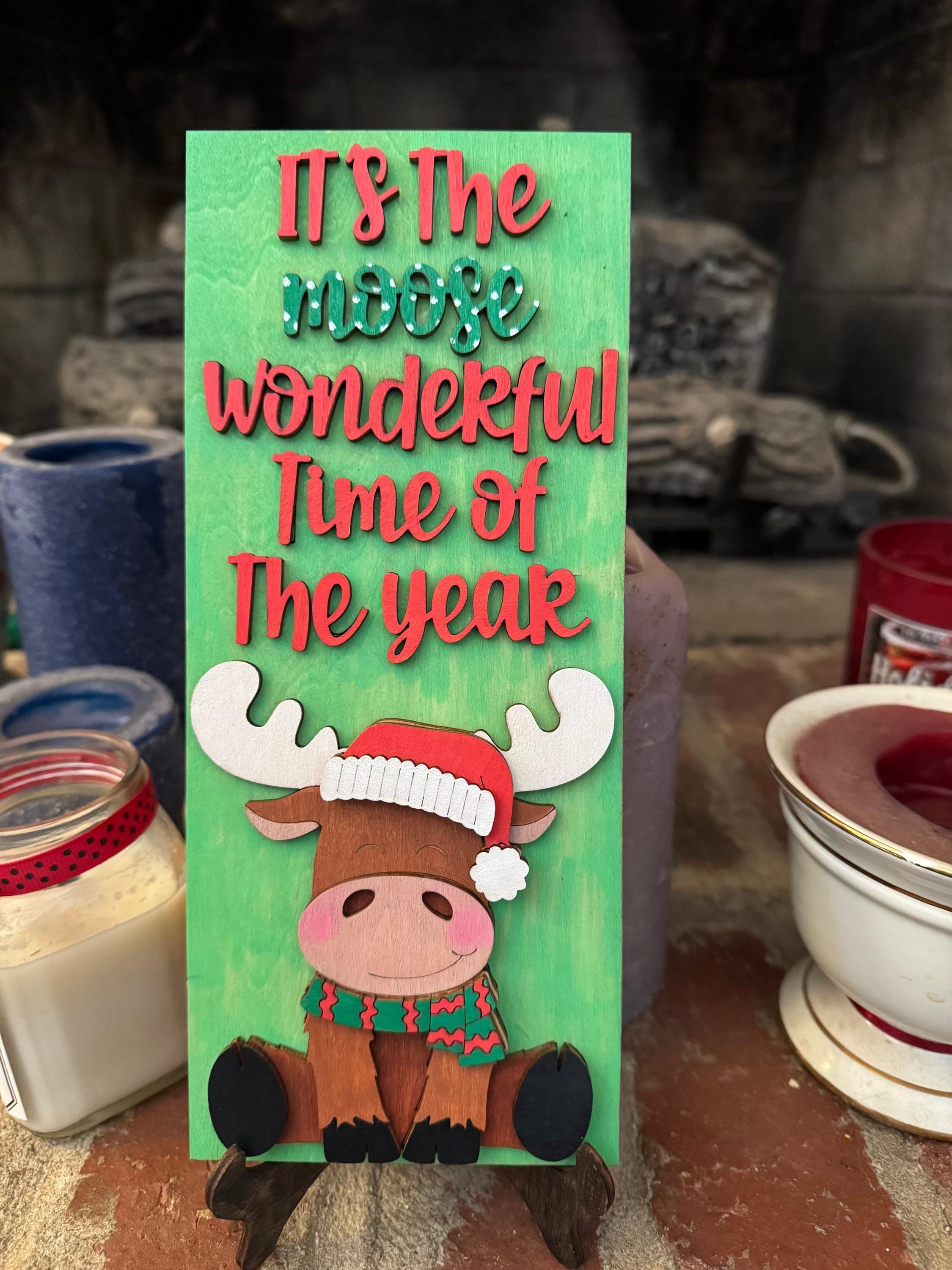 This sign showcases a cute moose in a Santa hat and scarf, paired with the playful phrase “It’s the Moose Wonderful Time of the Year.” The design adds personality and charm to any Christmas display, making it a standout piece for the season.