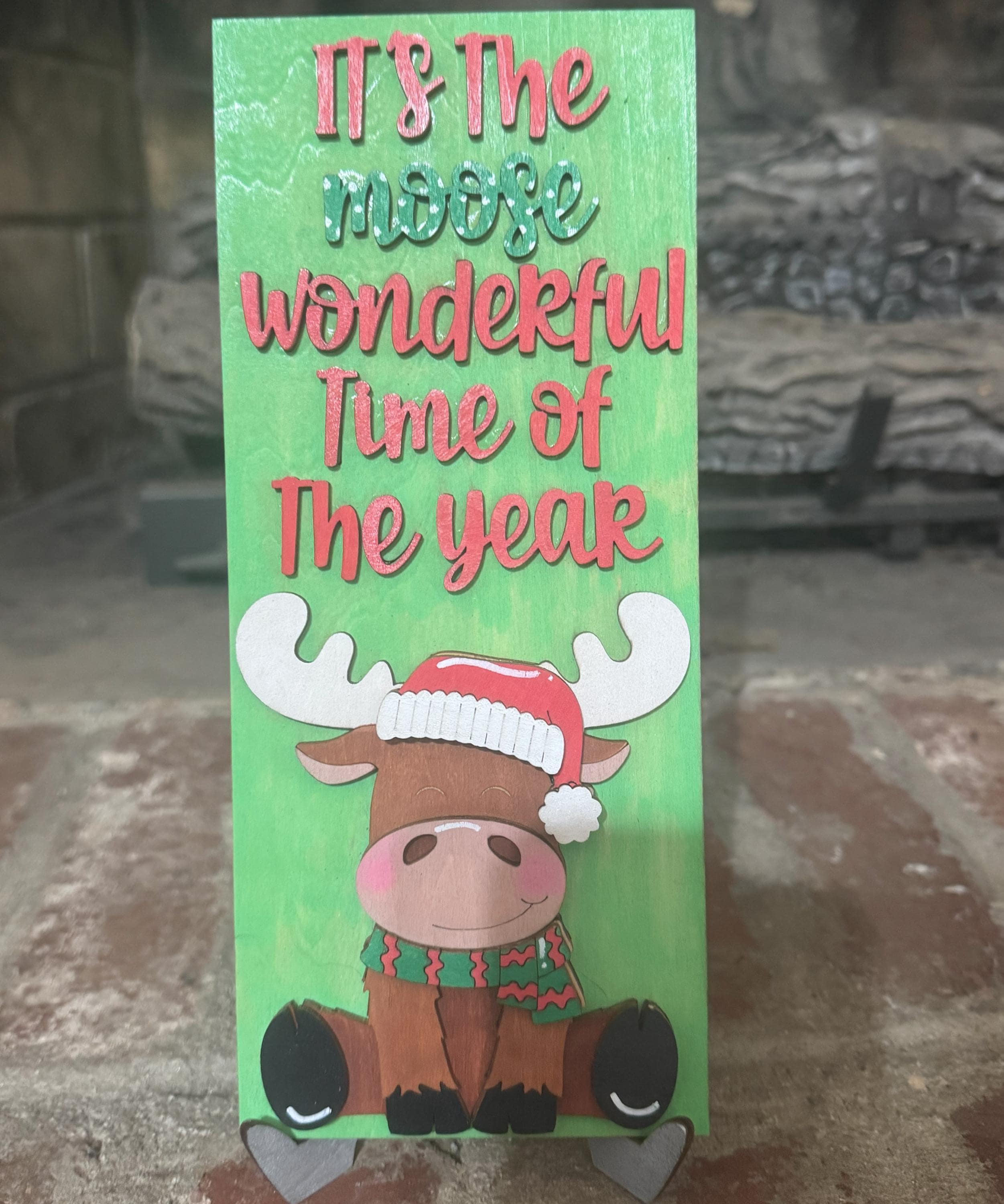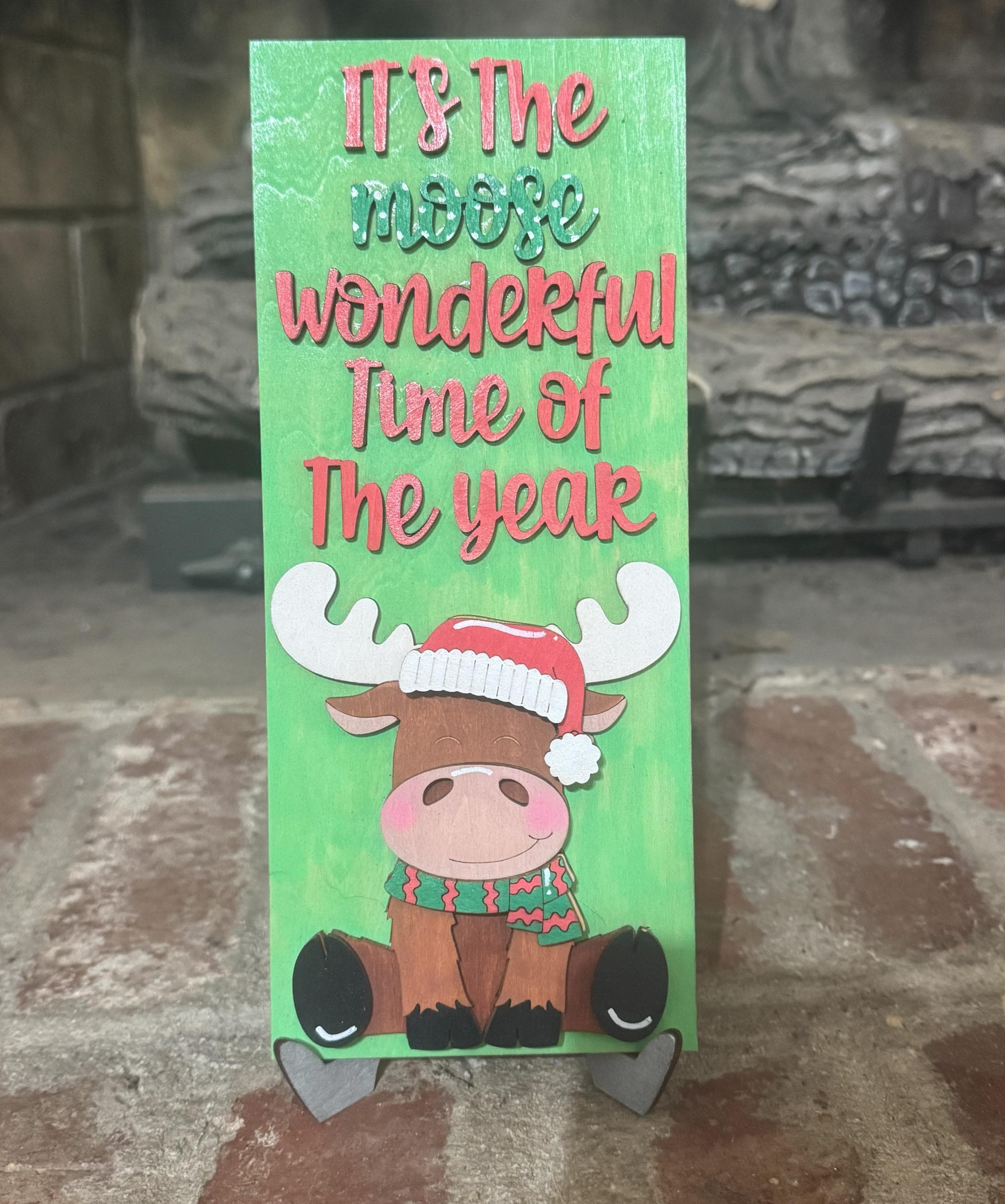 Bring a playful touch to your holiday decorating with this hand‑painted wooden Christmas sign featuring an adorable winter moose and a festive seasonal pun. It’s the perfect blend of rustic charm and cheerful whimsy — ideal for cozy homes, cabins, and anyone who loves woodland‑themed holiday decor.