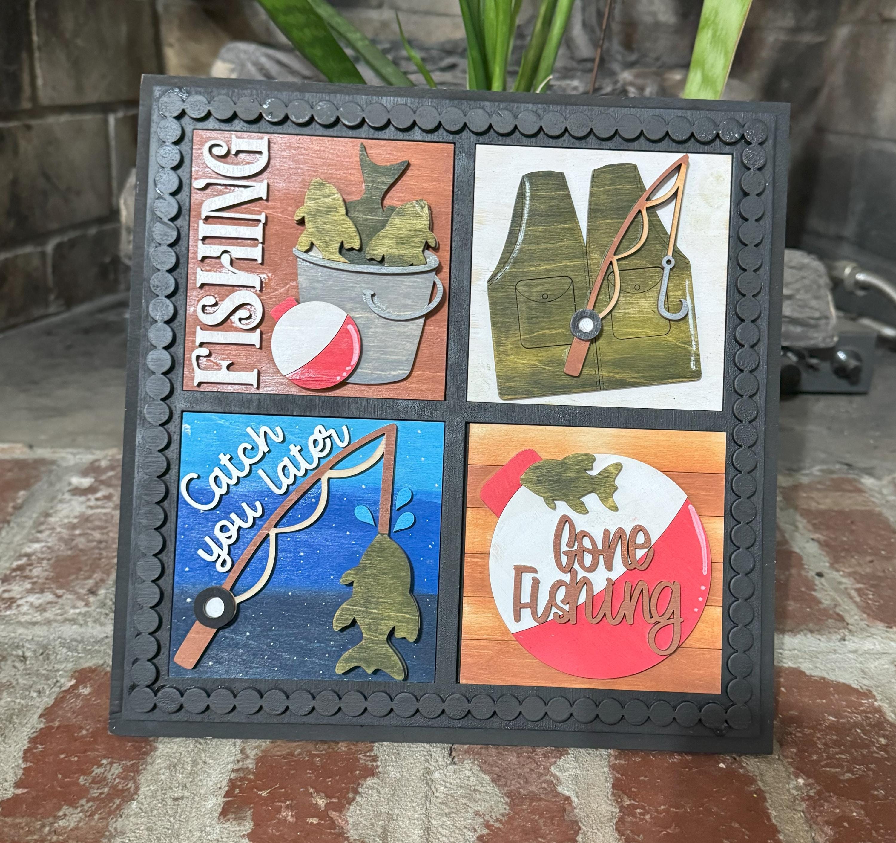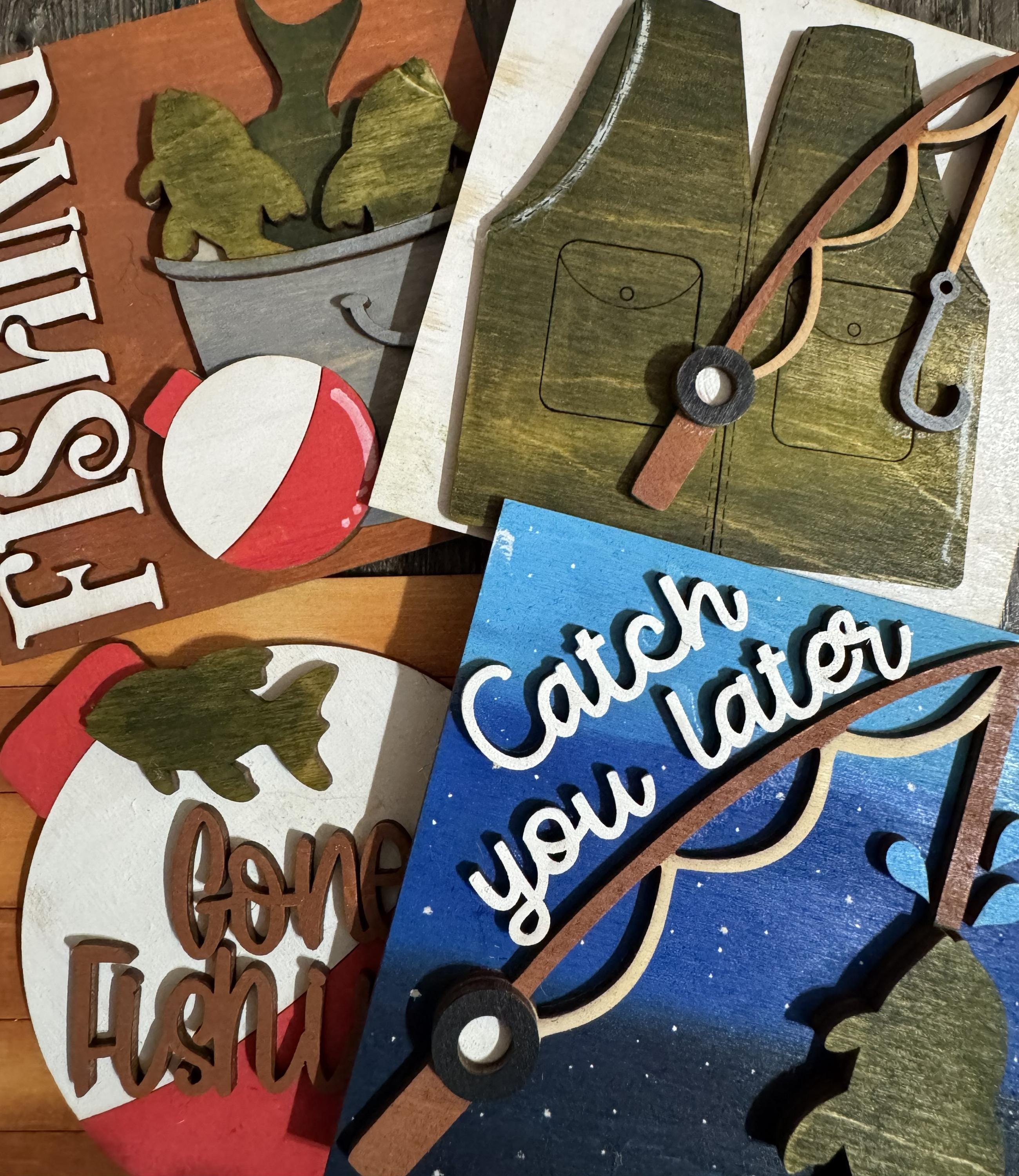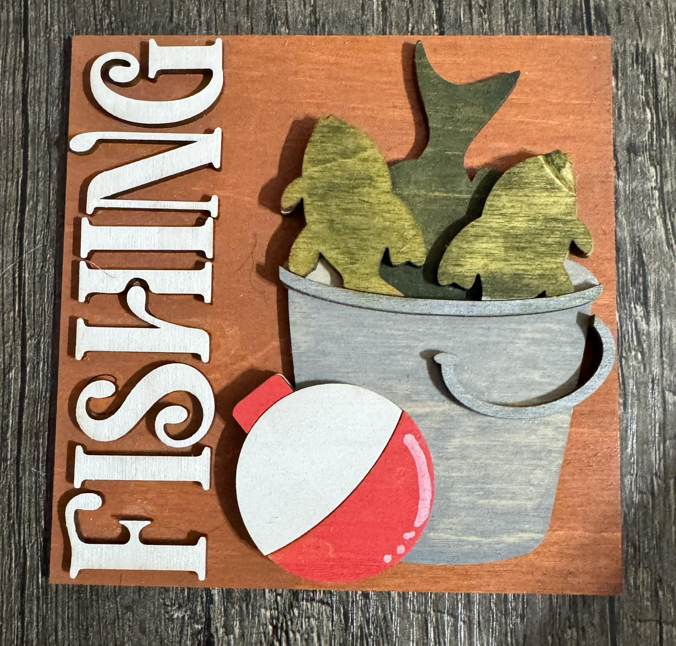 Bring rustic outdoor charm to your décor with these 4.25-inch hand‑painted wooden tiles, each designed with layered fishing‑themed details. Choose from fish, bobbers, rods, vests, and fun sayings to create a personalized display for shelves, tiered trays, cabins, man caves, or gift giving.