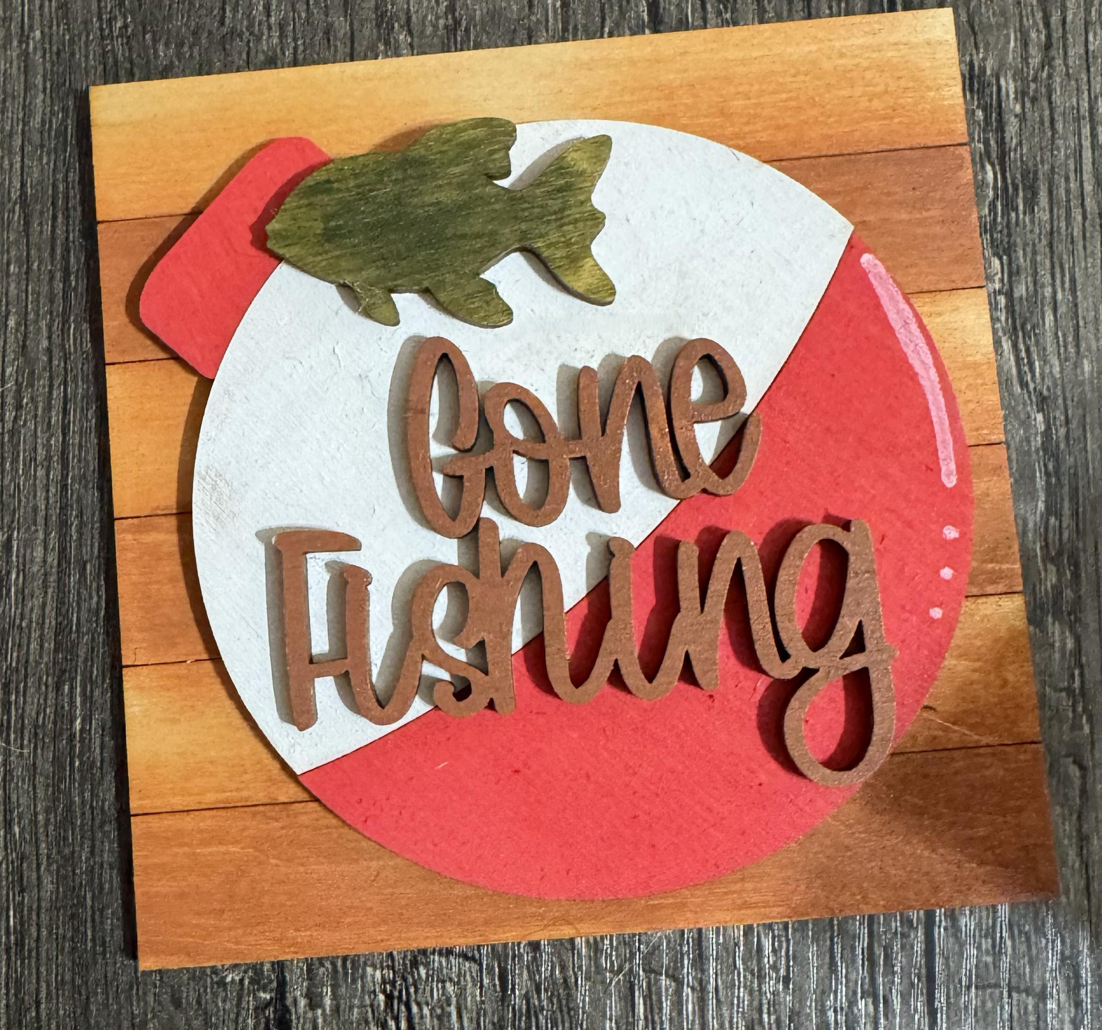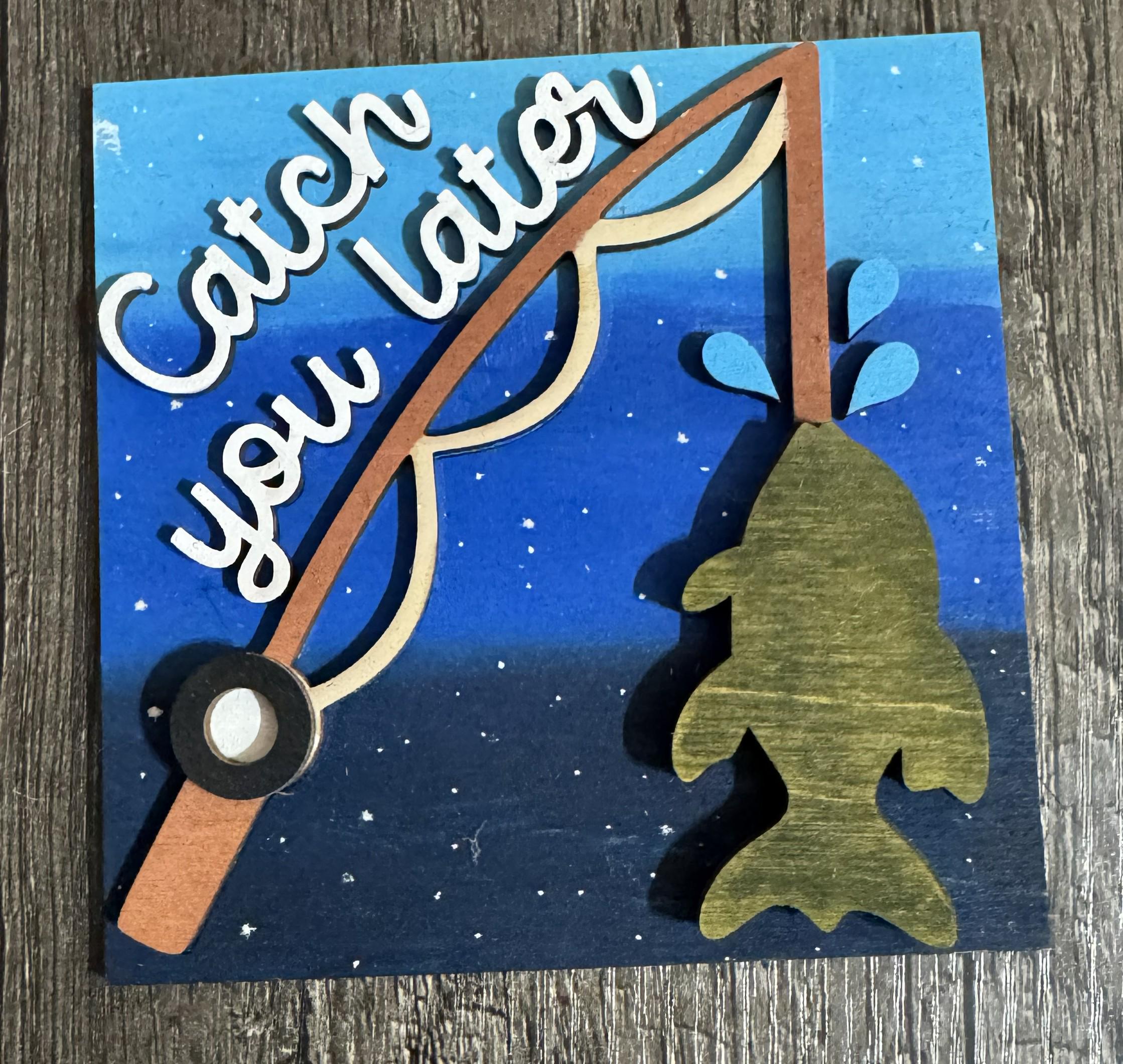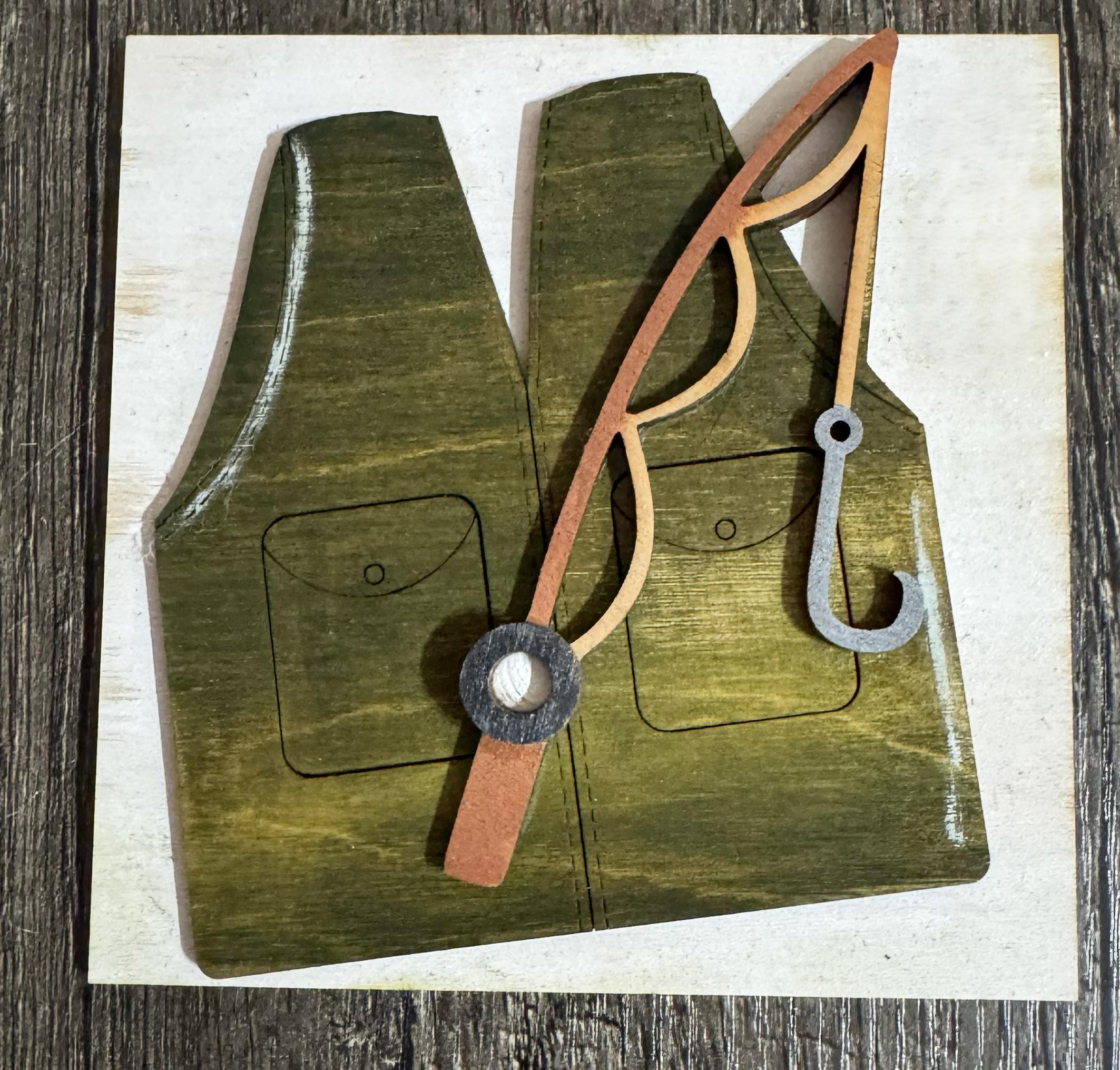 Bring rustic outdoor charm to your décor with these 4.25-inch hand‑painted wooden tiles, each designed with layered fishing‑themed details. Choose from fish, bobbers, rods, vests, and fun sayings to create a personalized display for shelves, tiered trays, cabins, man caves, or gift giving.