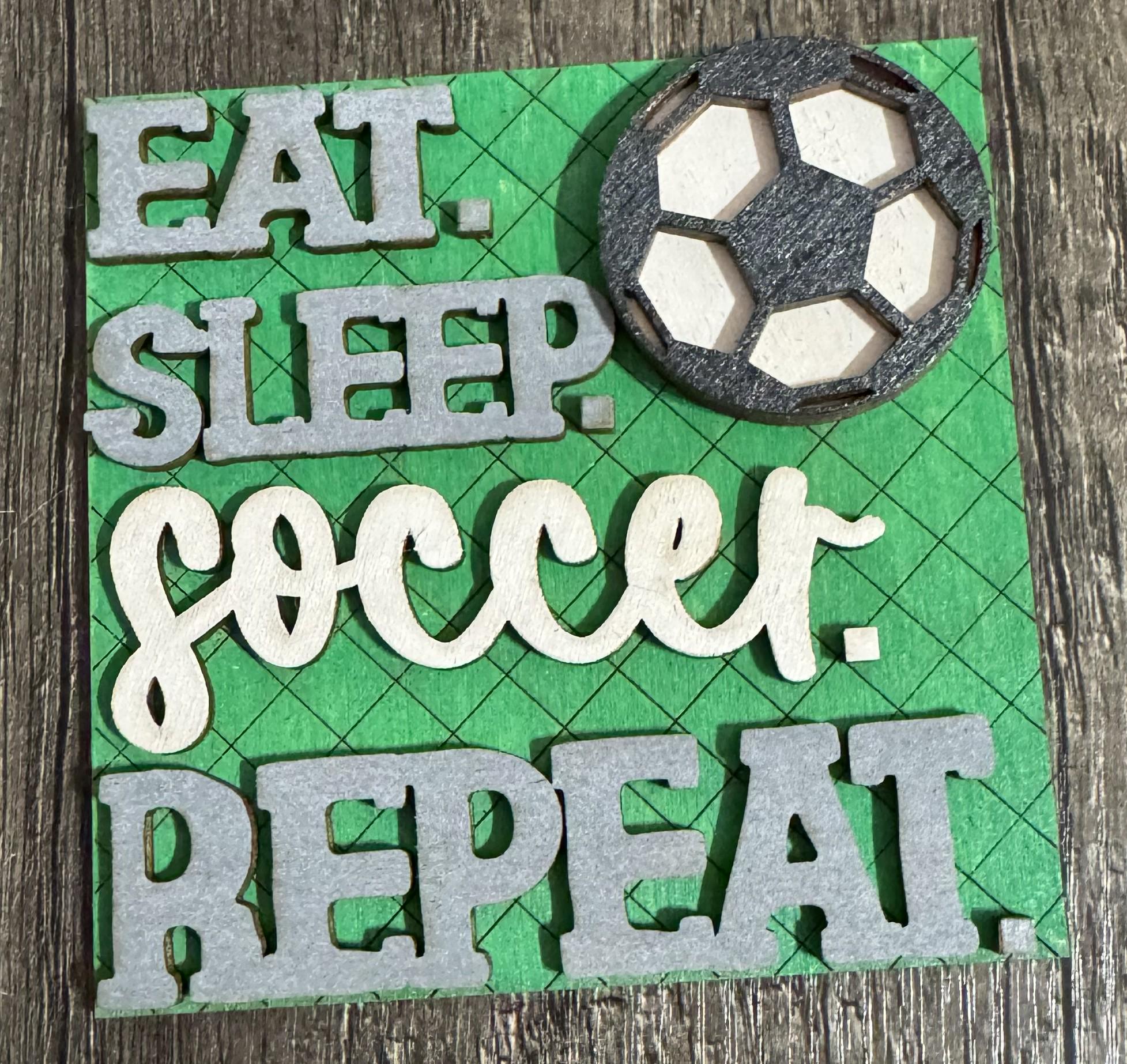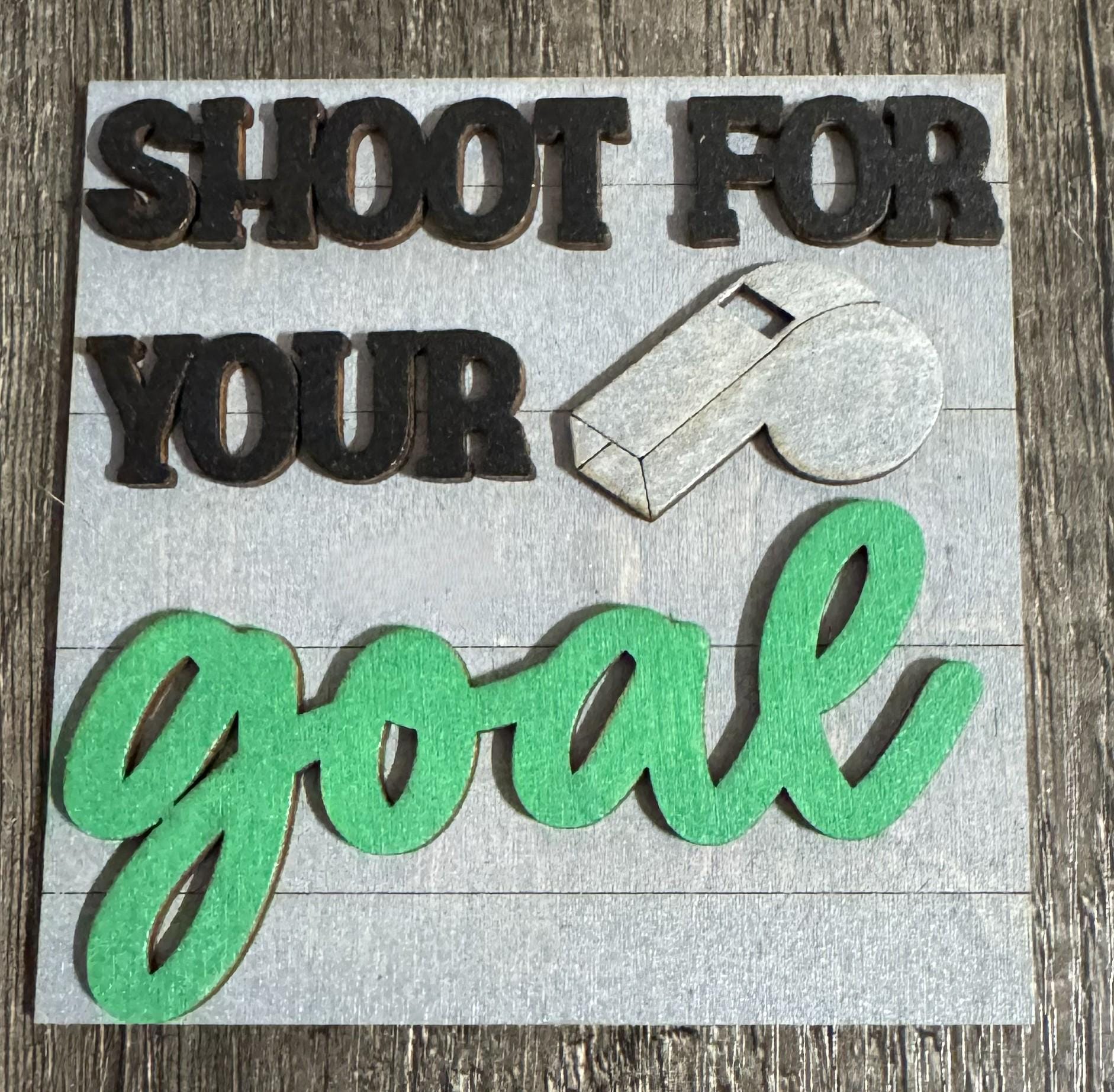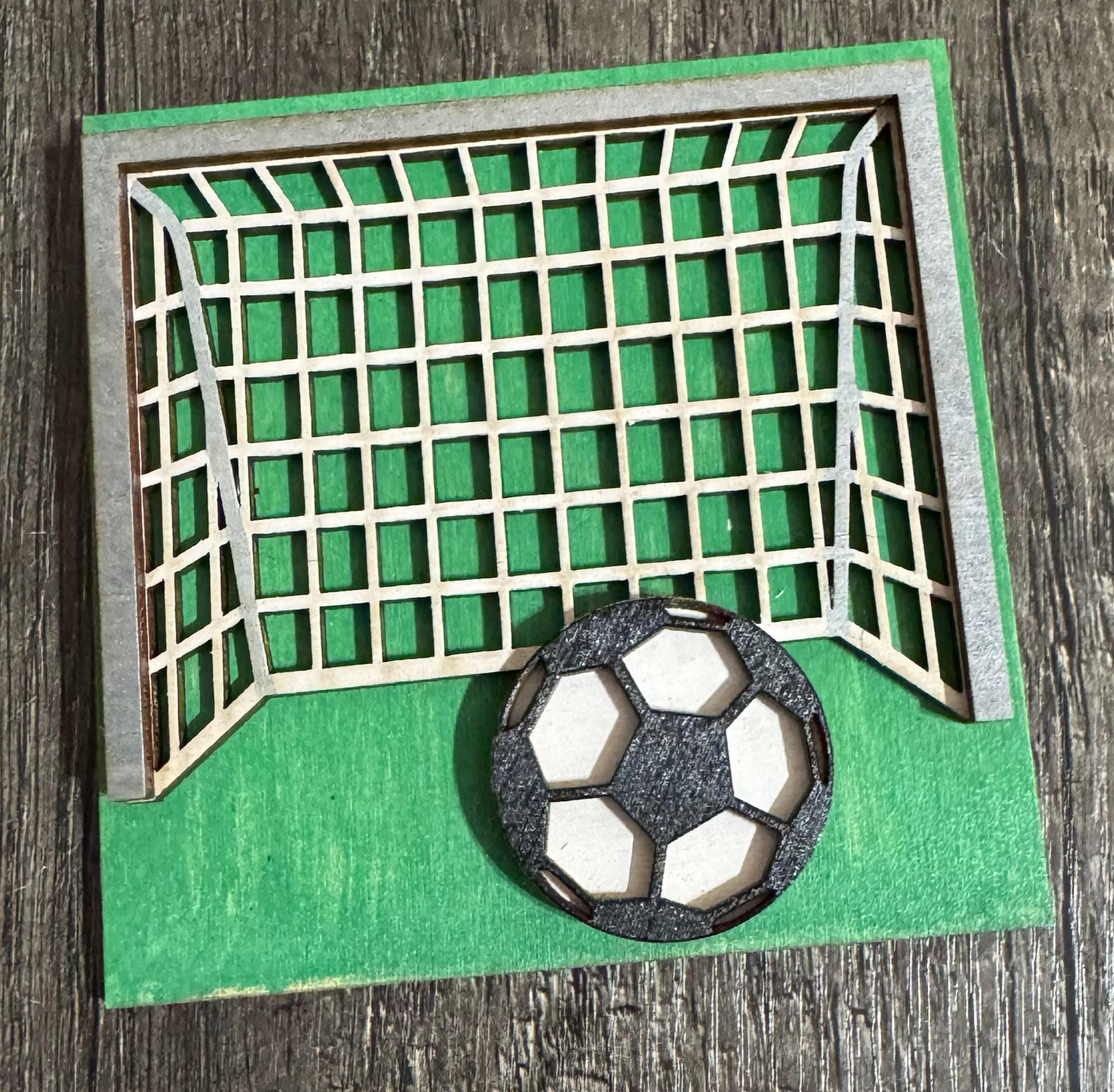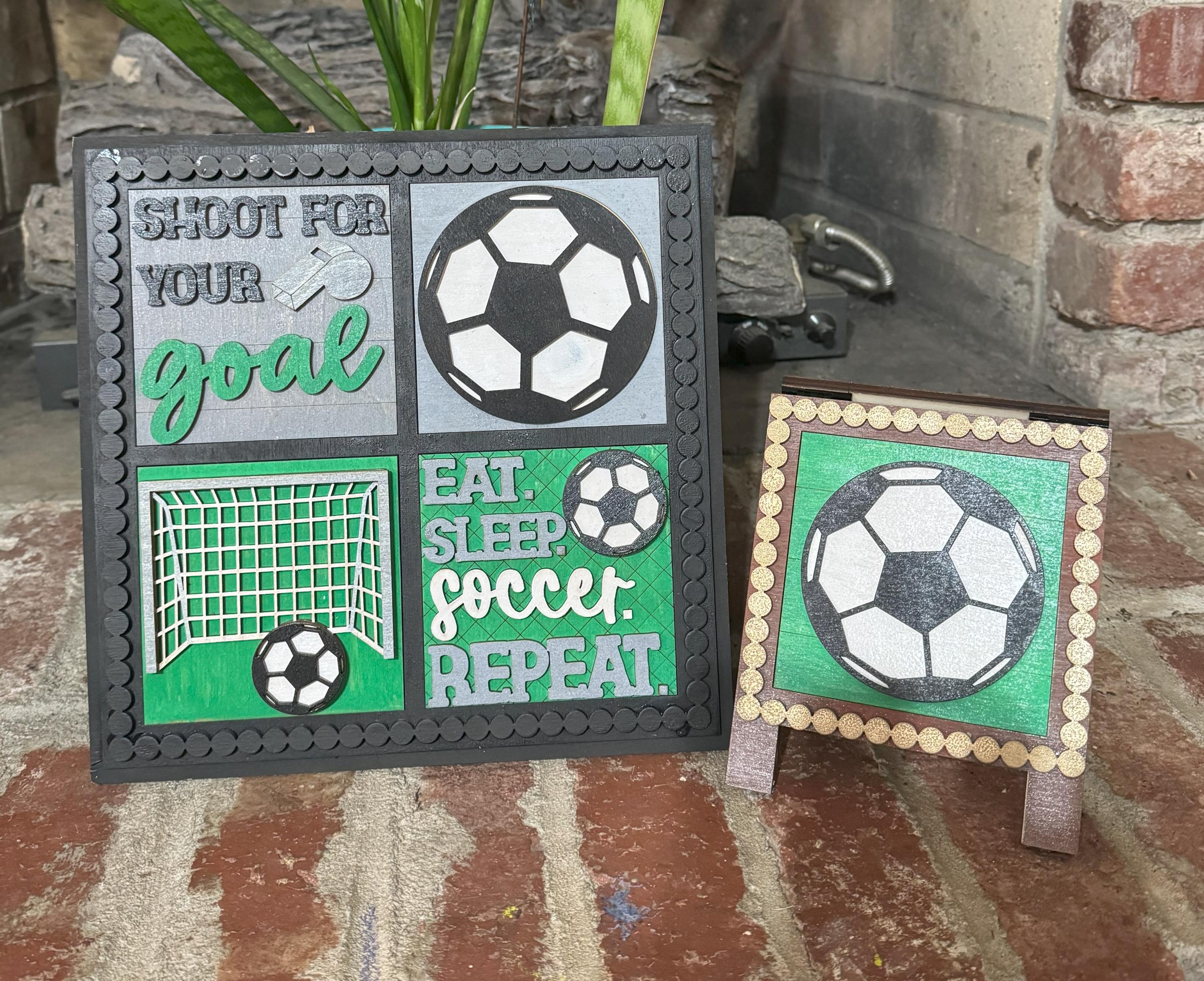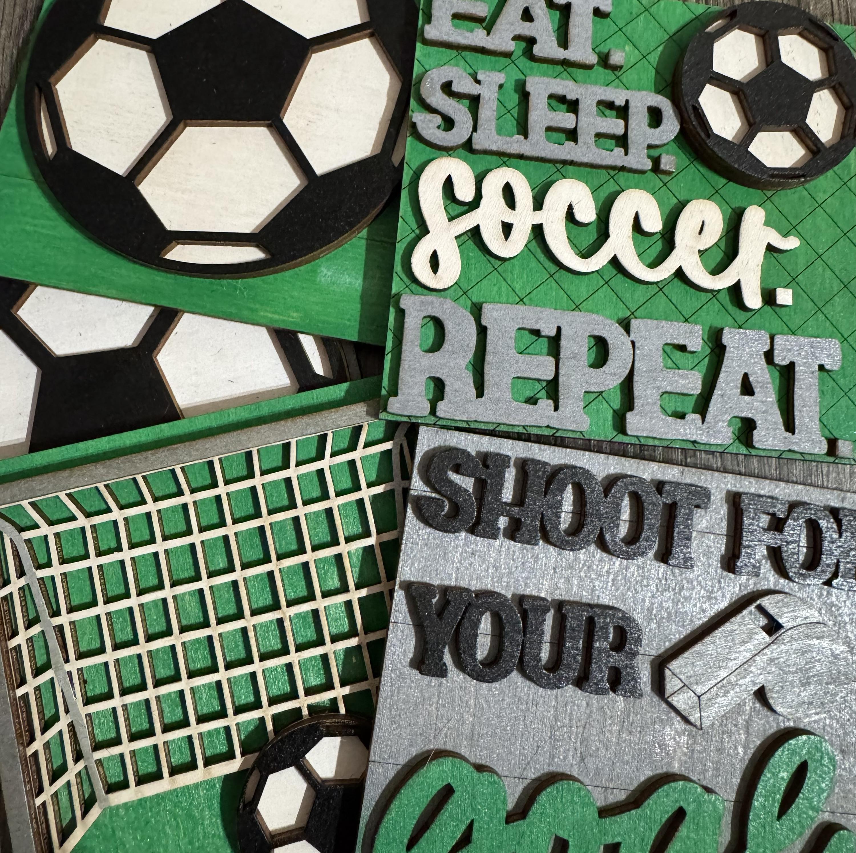 Celebrate the love of the game with these 4.25-inch hand‑painted wooden tiles, each designed with layered soccer details. Choose from soccer balls, goals, motivational sayings, and fun game‑day designs to create a custom display for shelves, tiered trays, kids’ rooms, game rooms, or gift giving.