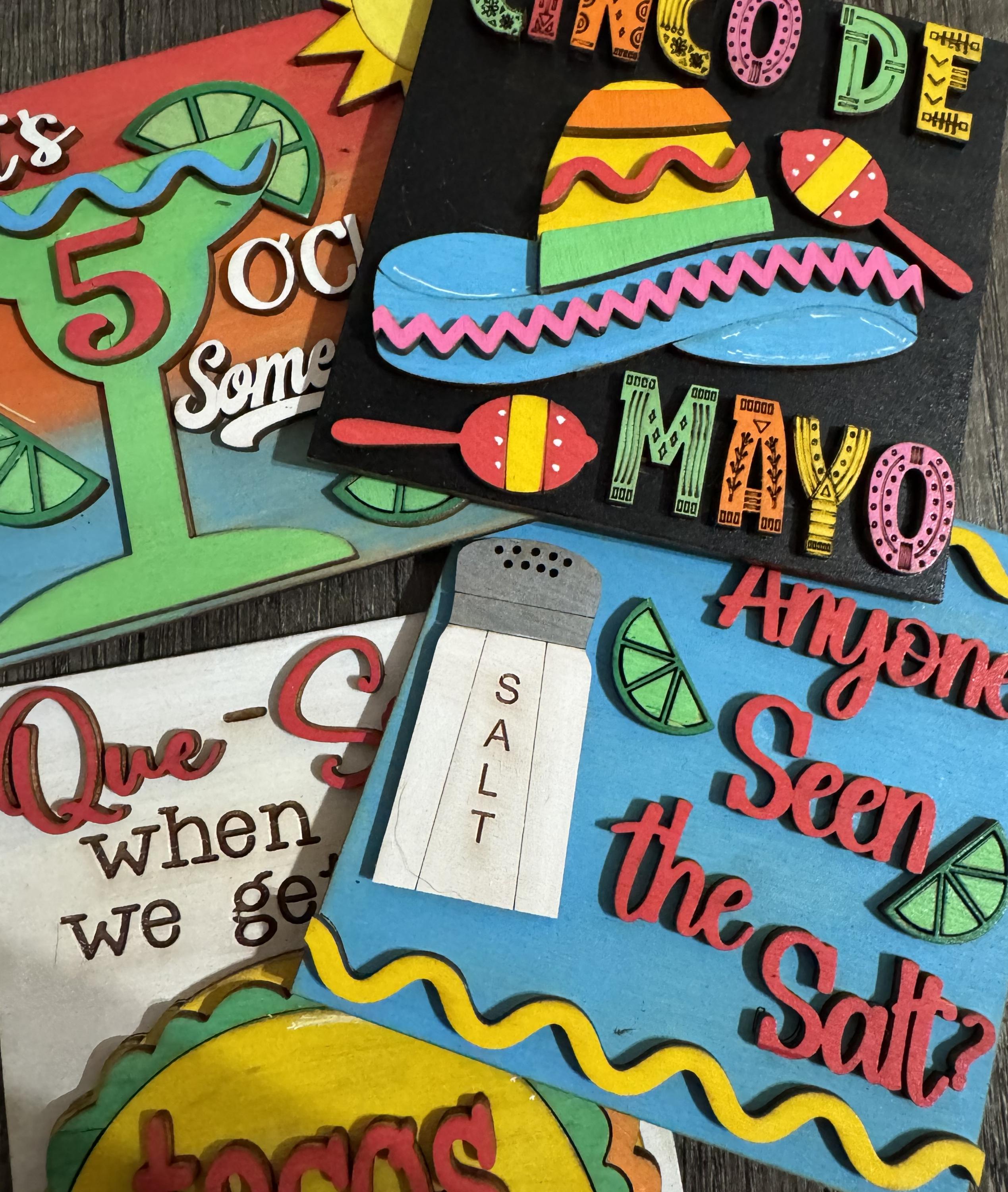Fiesta vibes are officially here! This new set of hand‑painted 4.25” wooden tiles brings all the fun of taco night and Cinco de Mayo into your kitchen or bar cart. Bright colors, bold graphics, and a whole lot of personality — perfect for parties, summer décor, or anyone who loves tacos as much as I do. Which tile would you grab for your next fiesta?