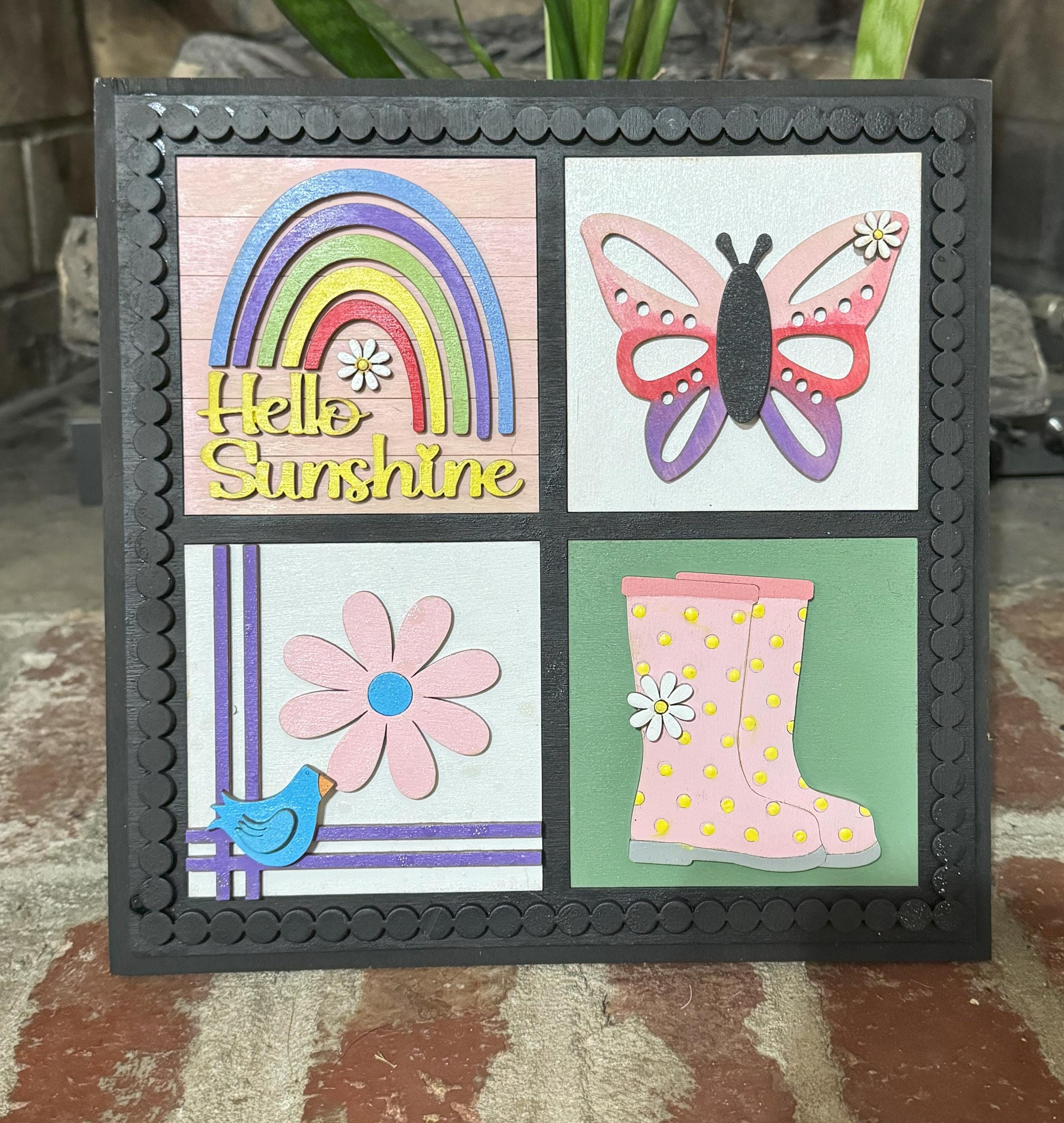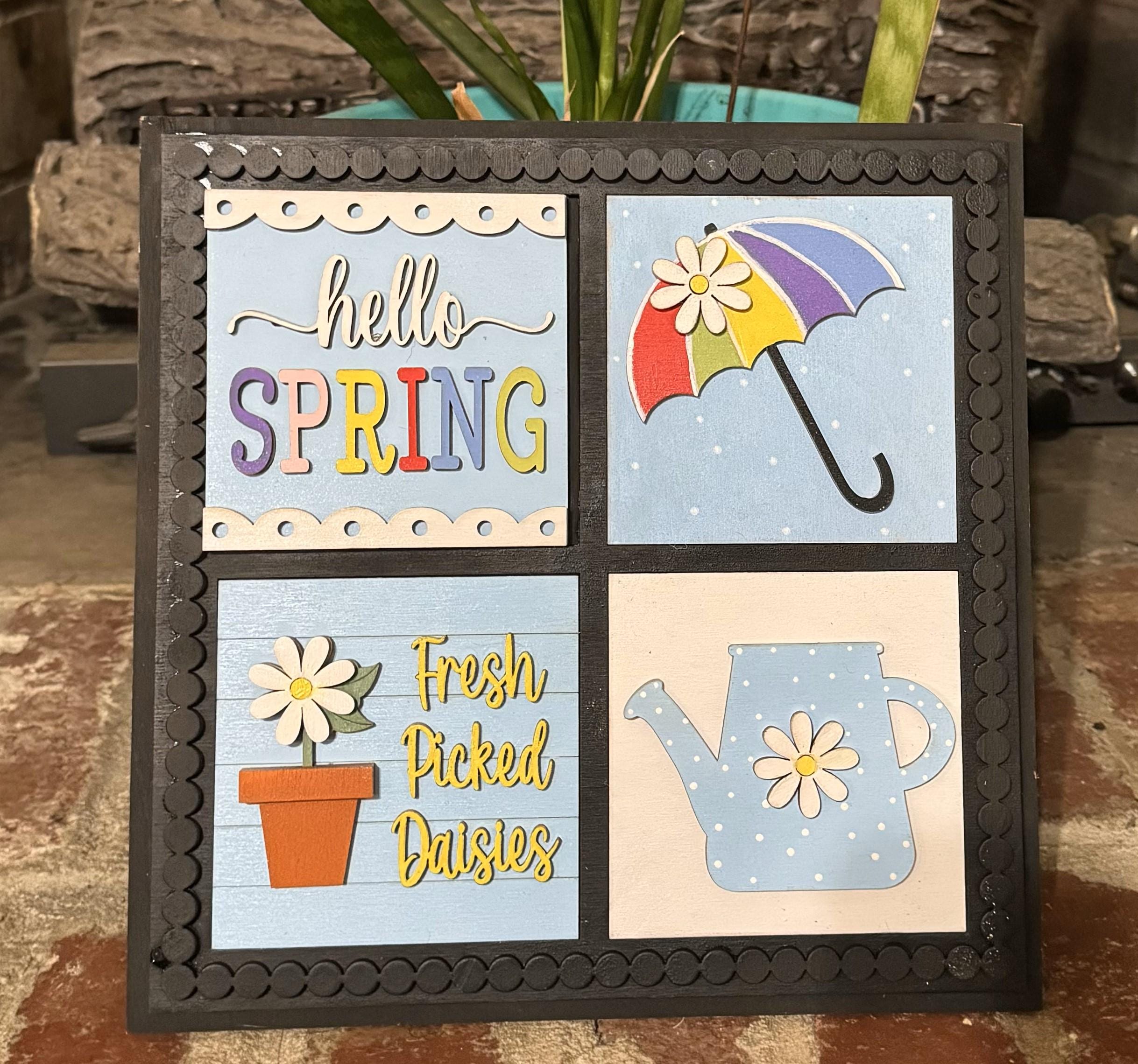 Bring a burst of cheerful spring energy into your home with this set of hand‑painted 4.25” wooden tiles. Each tile is painted by hand (never printed) and features bright, joyful spring icons — a blue bird, butterfly, umbrella, daisy pot, “Hello Spring” sign, polka‑dot watering can, pink flower with bird, rainbow with “Hello Sunshine,” rain boots with daisy, and two “Bloom & Grow” designs. These tiles make charming seasonal décor for tiered trays, shelves, mantels, desks, or gift baskets. Their layered, colorful, whimsical style adds warmth and personality to any space. Perfect for spring decorating, Easter displays, garden lovers, and handmade‑art collectors.
