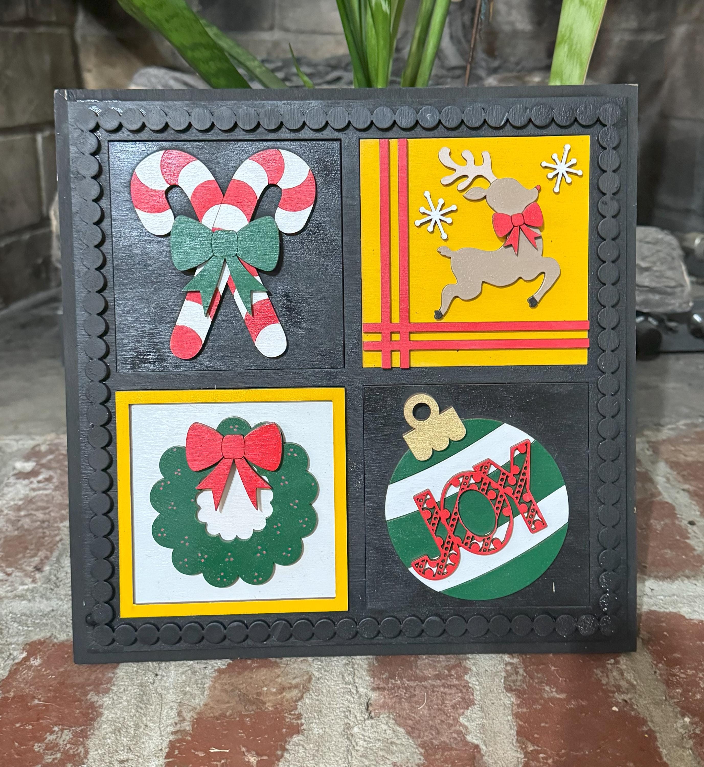 Bring the magic of Christmas into your home with these hand‑painted interchangeable holiday tiles, perfectly sized for your 4.25" display frames (sold separately). Each tile is full of festive charm—classic Santa, JOY ornament, candy canes, reindeer, wreaths, holiday sayings, and bright seasonal colors that instantly warm up any space.